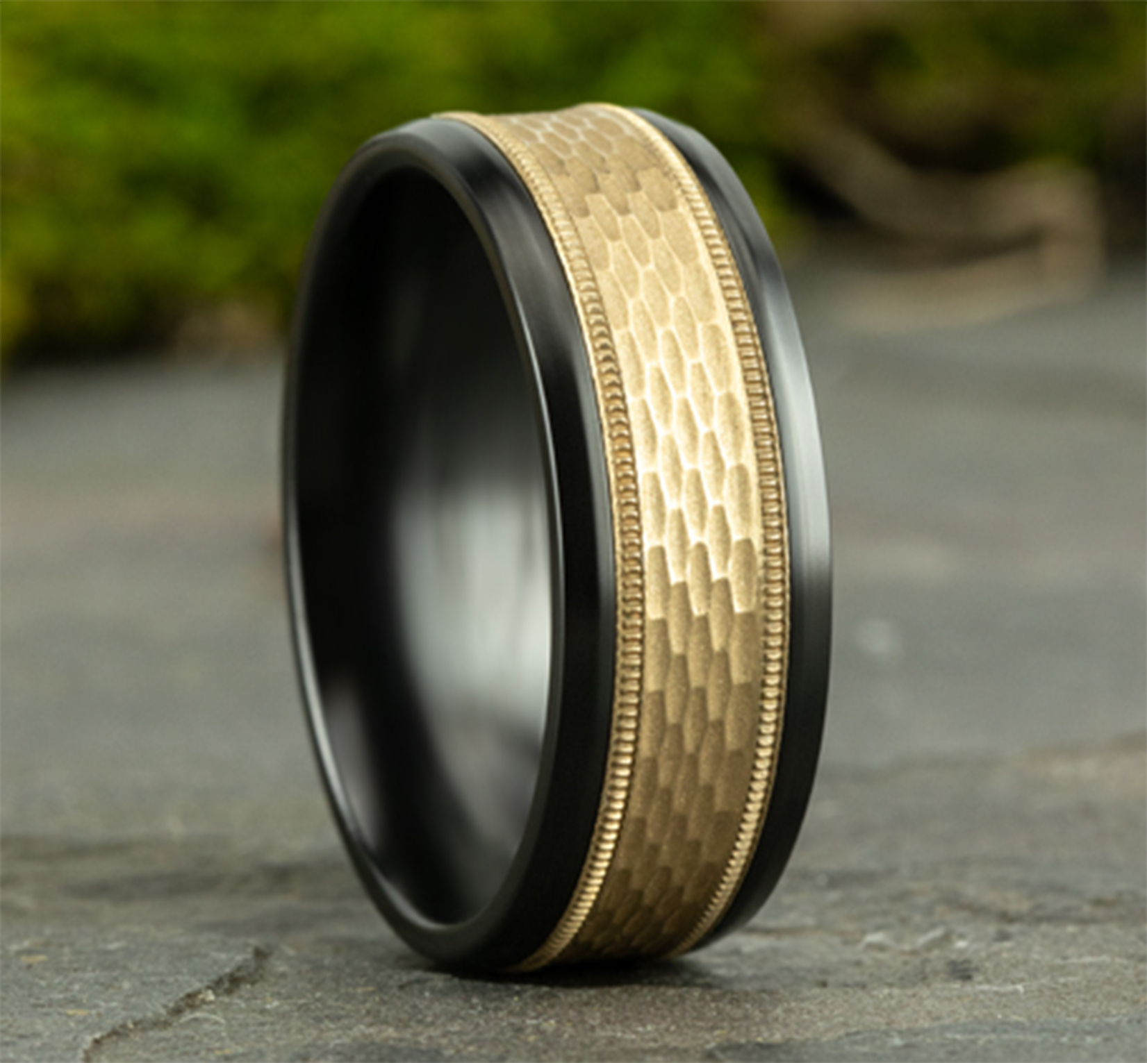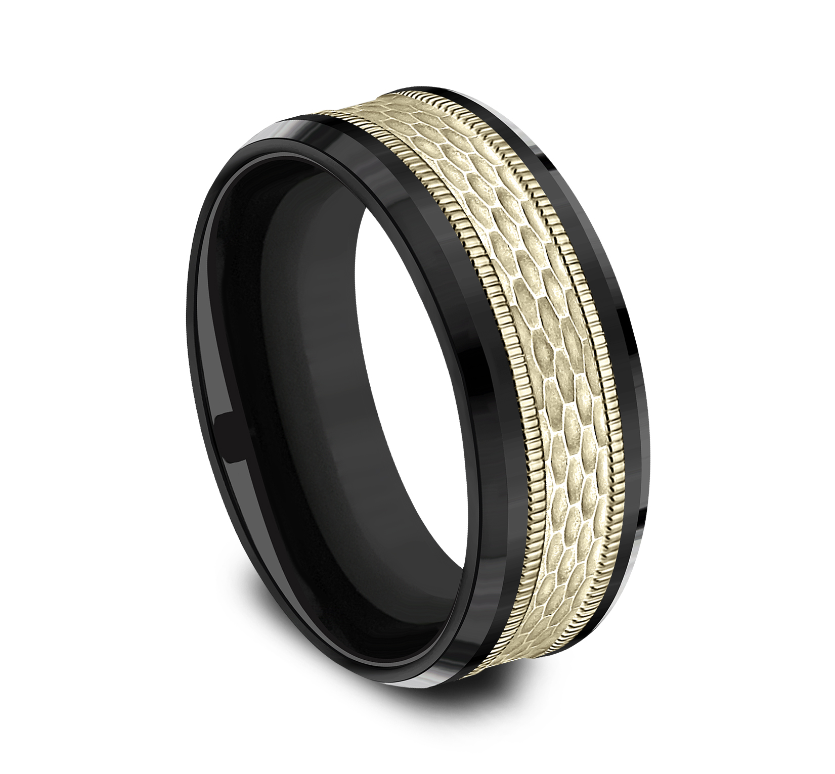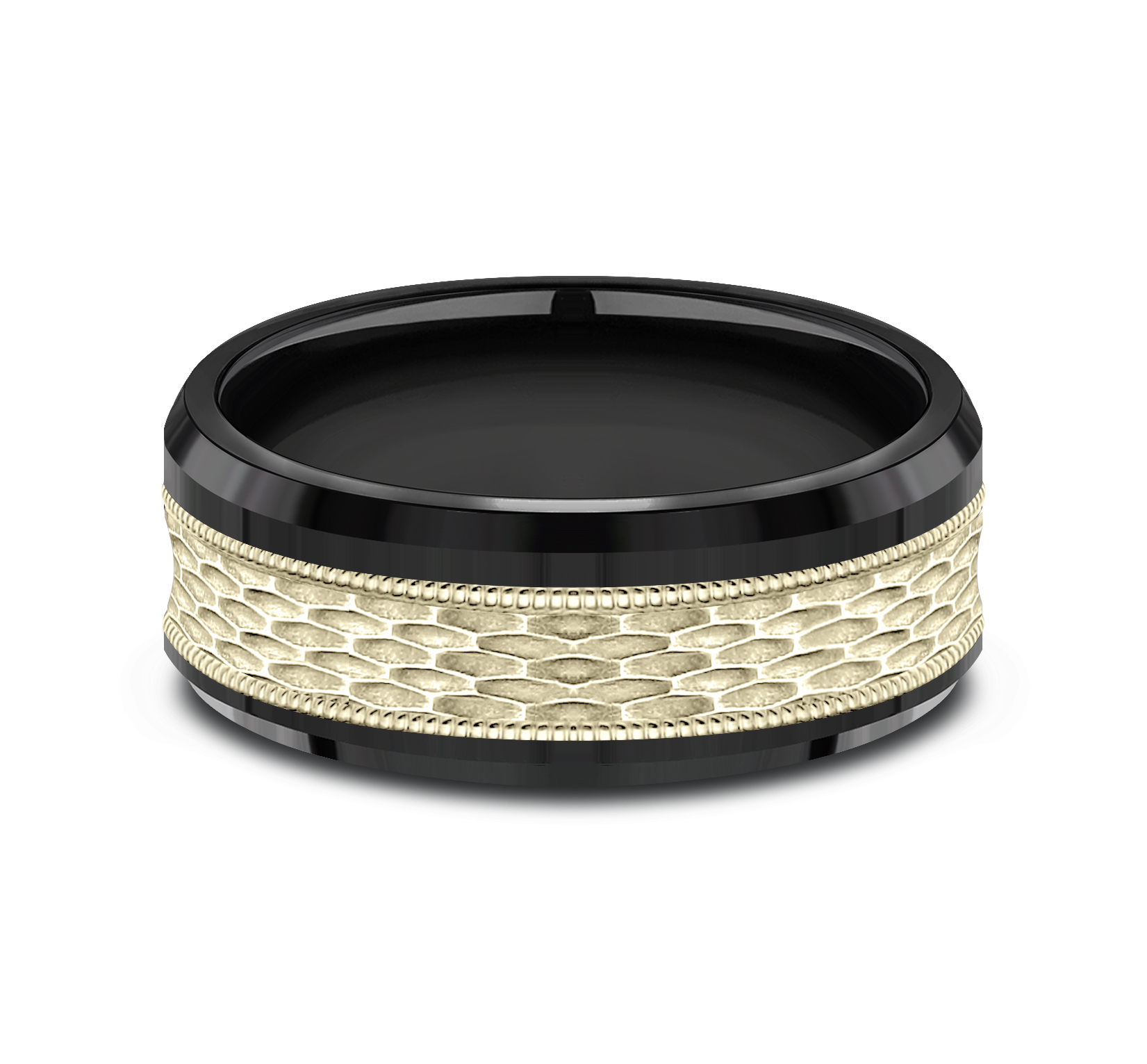 8mm, Comfort fit Black Titanium and 14K Yellow Gold Mesh pattern with milgrain detail, polished bevel edges