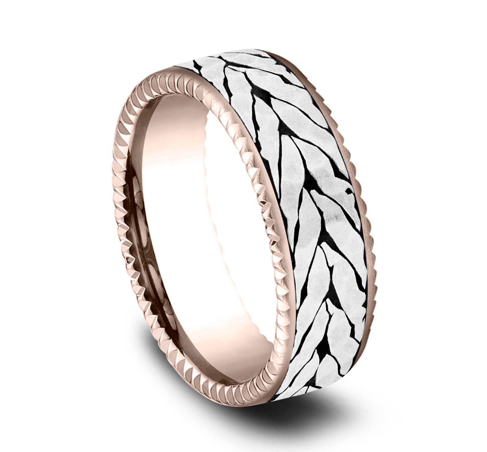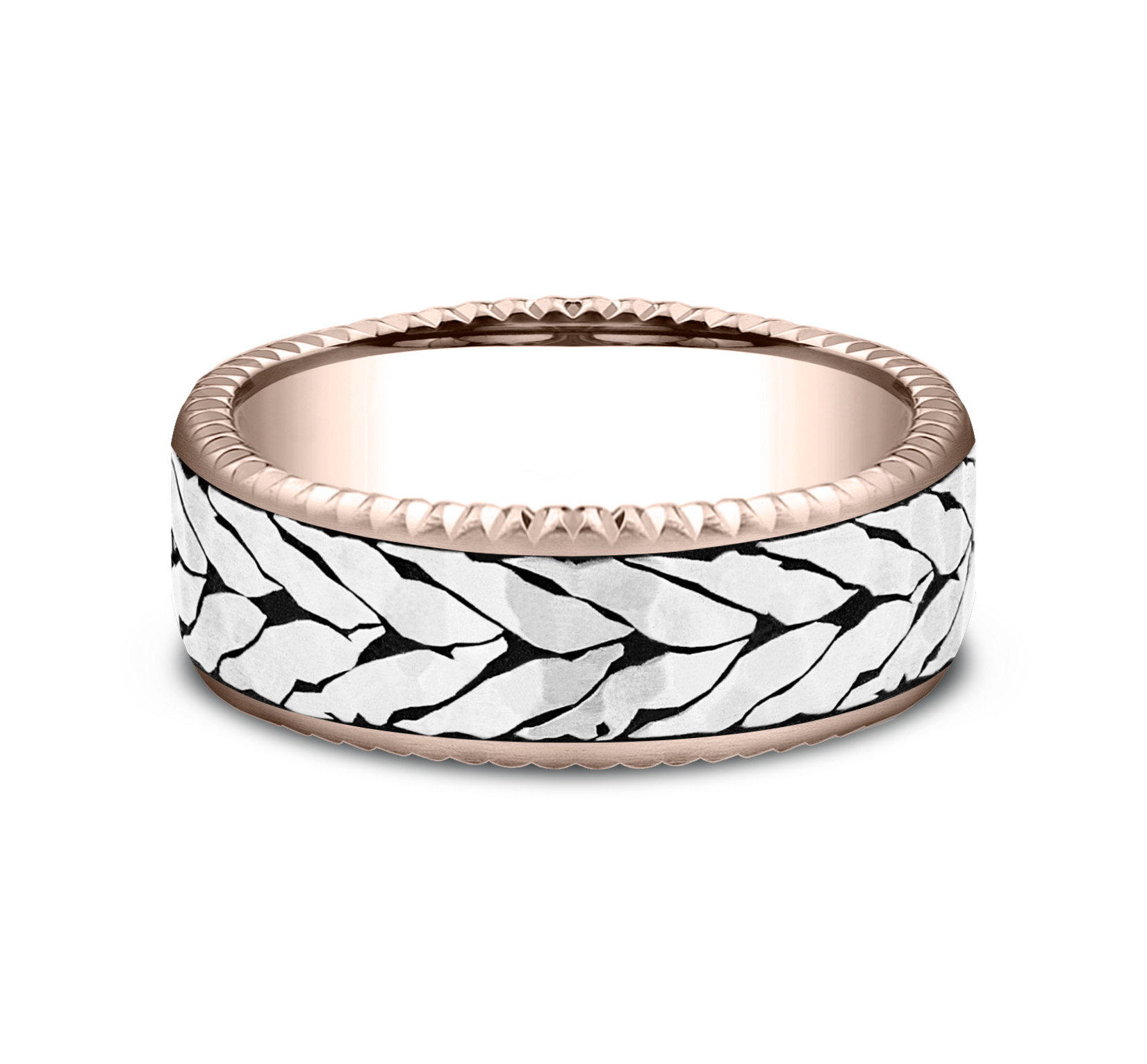 7.5mm, Comfort fit 14K Rose Gold and Grey-Black Titanium Hammered chevron pattern, fluted face