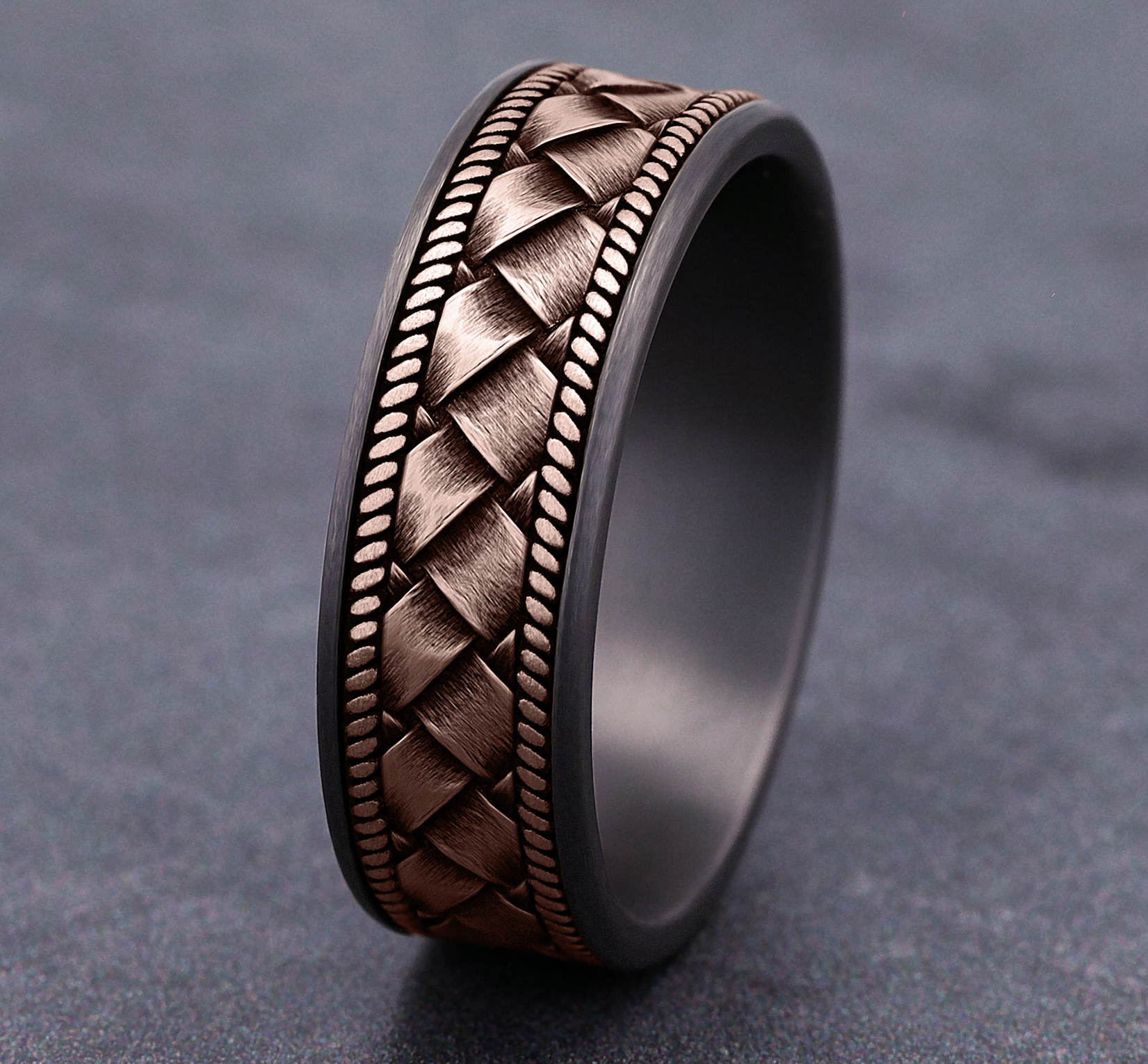 7.5mm, Comfort fit Grey Tantalum and 14K Rose Gold Basket weave pattern, thin edges