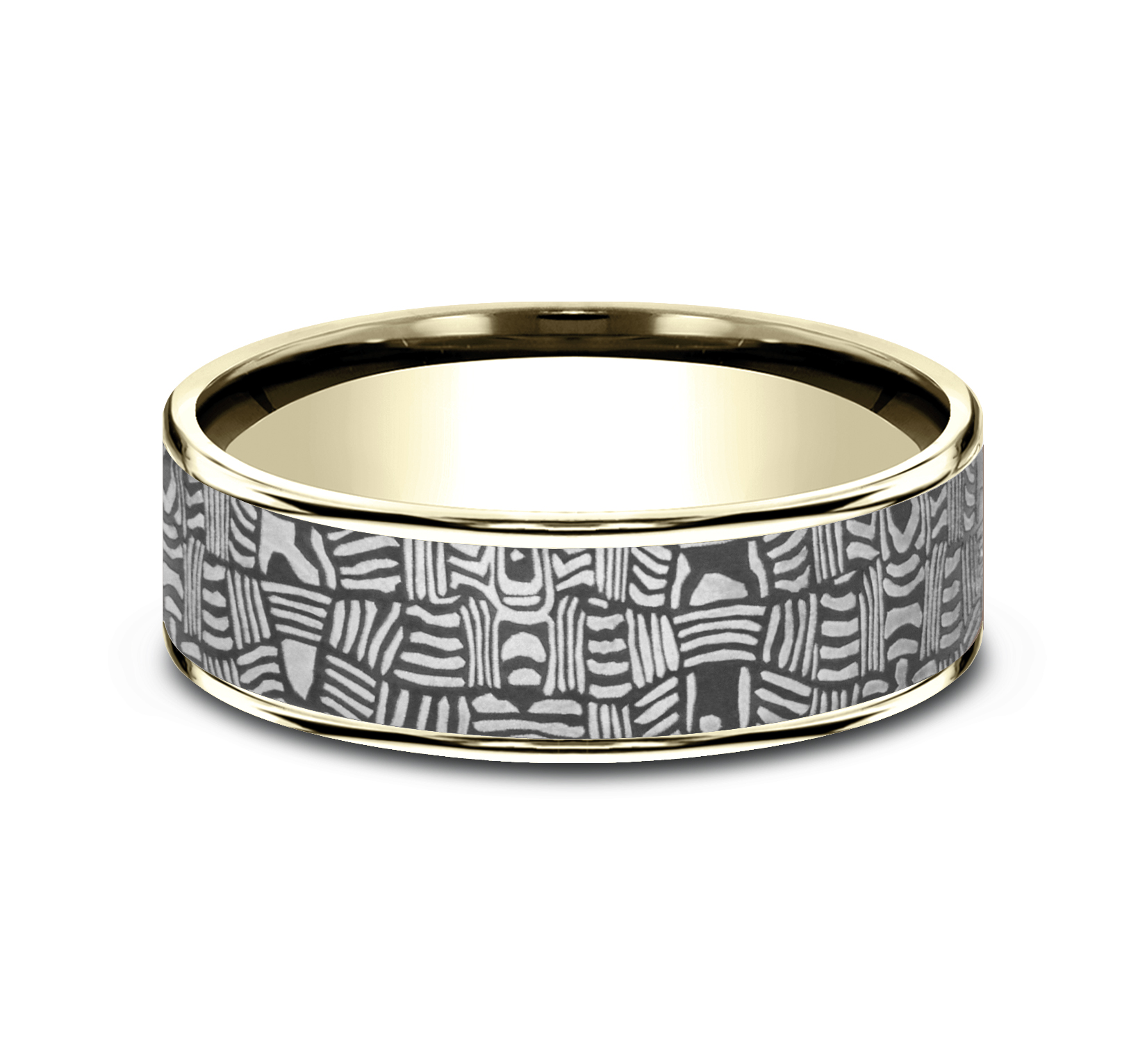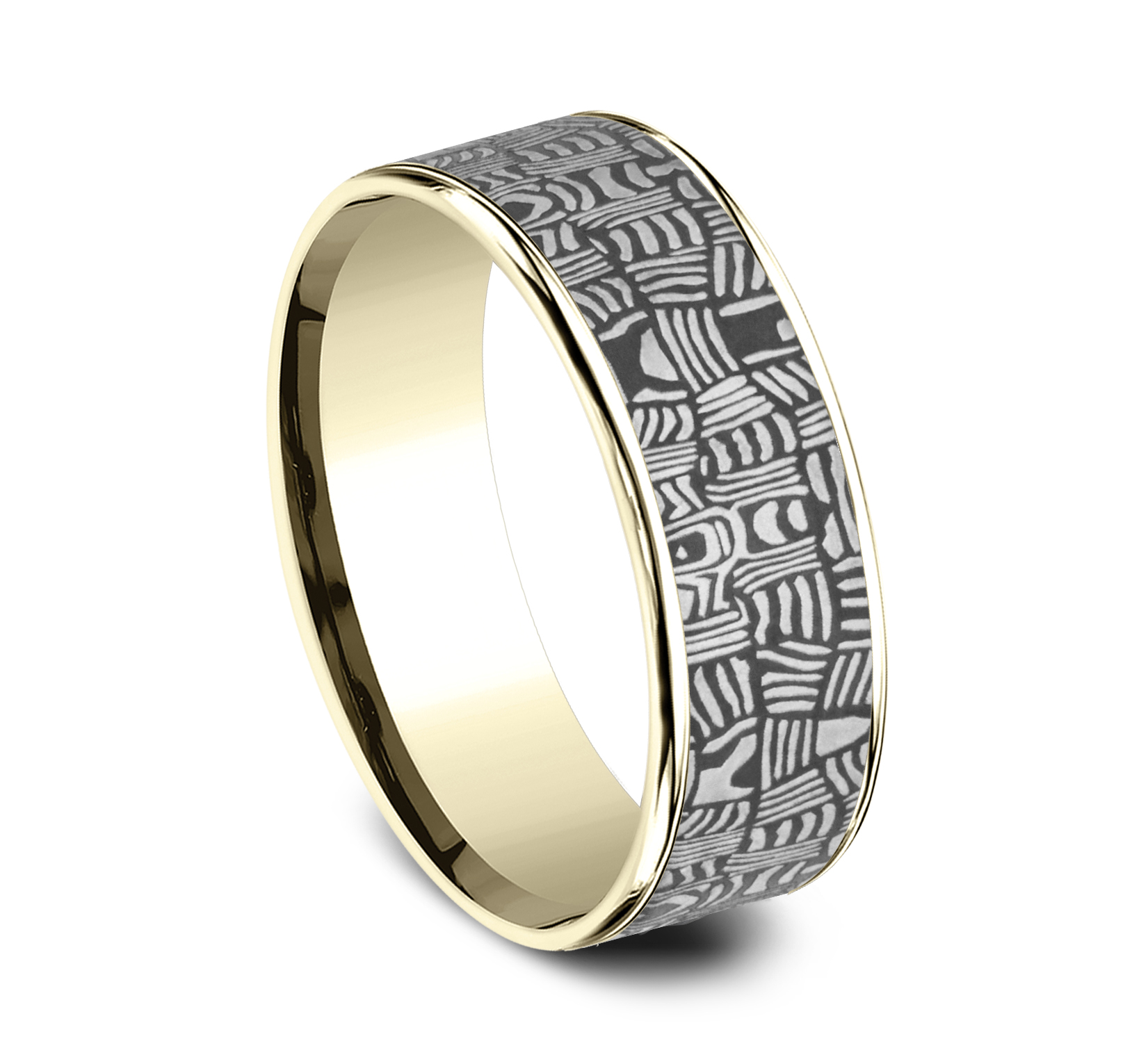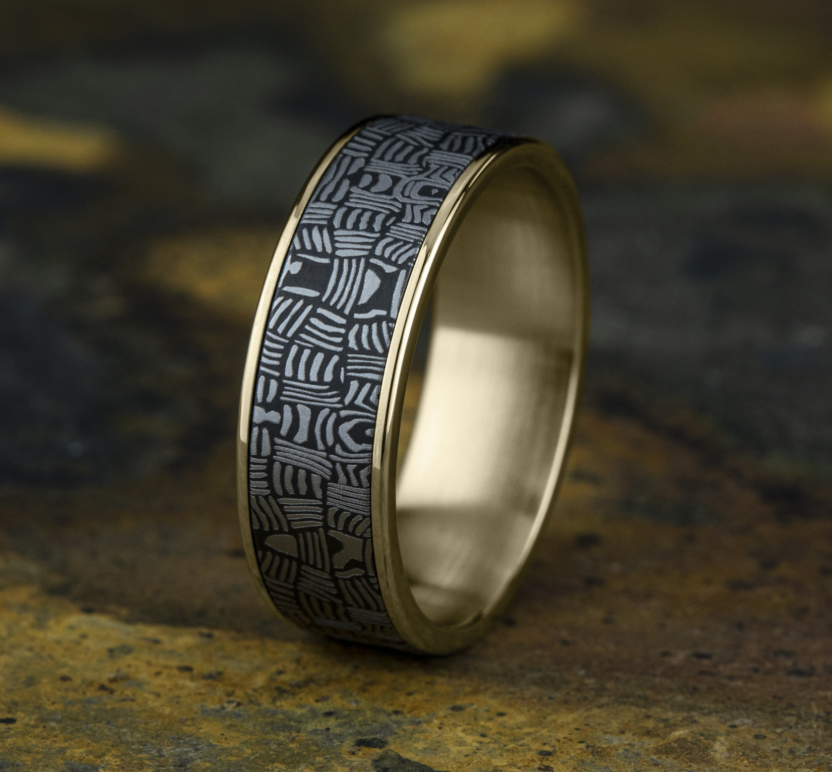 7.5mm, Comfort fit 14K Yellow Gold and Darkened Tantalum Unique Tamascus designed center, thin edges