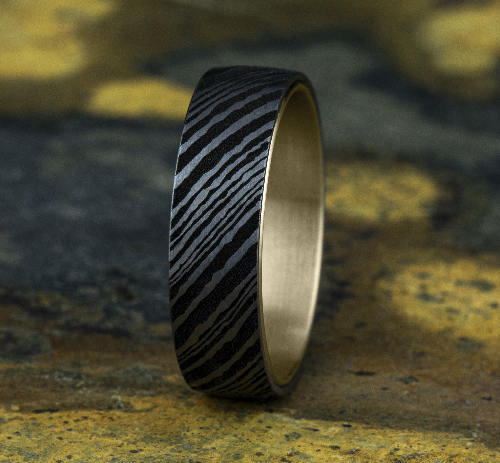6.5mm, Comfort fit 14K Yellow Gold and Damascus Steel Damascus Steel outer design