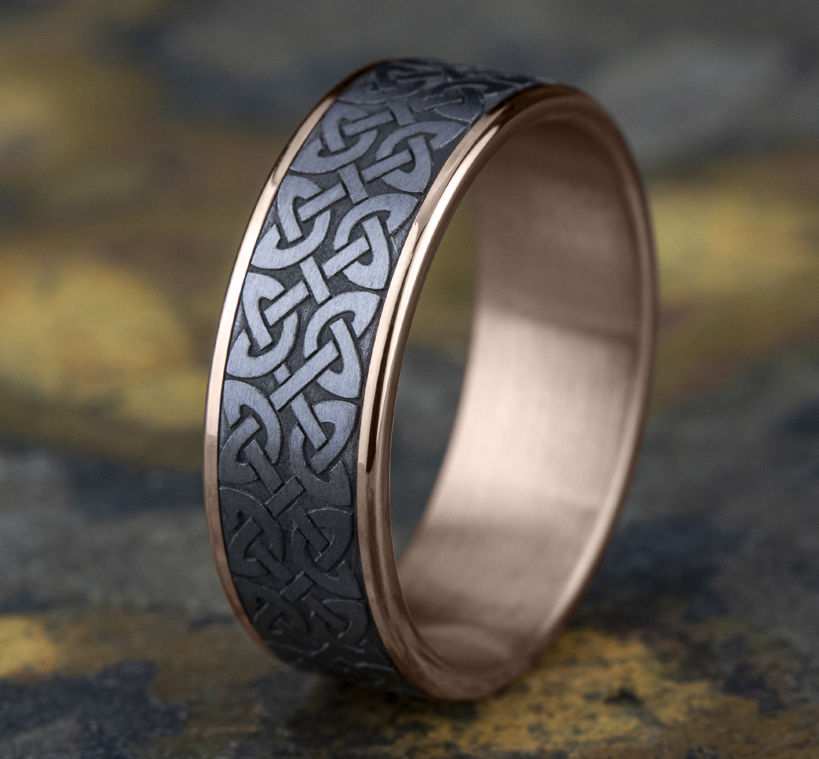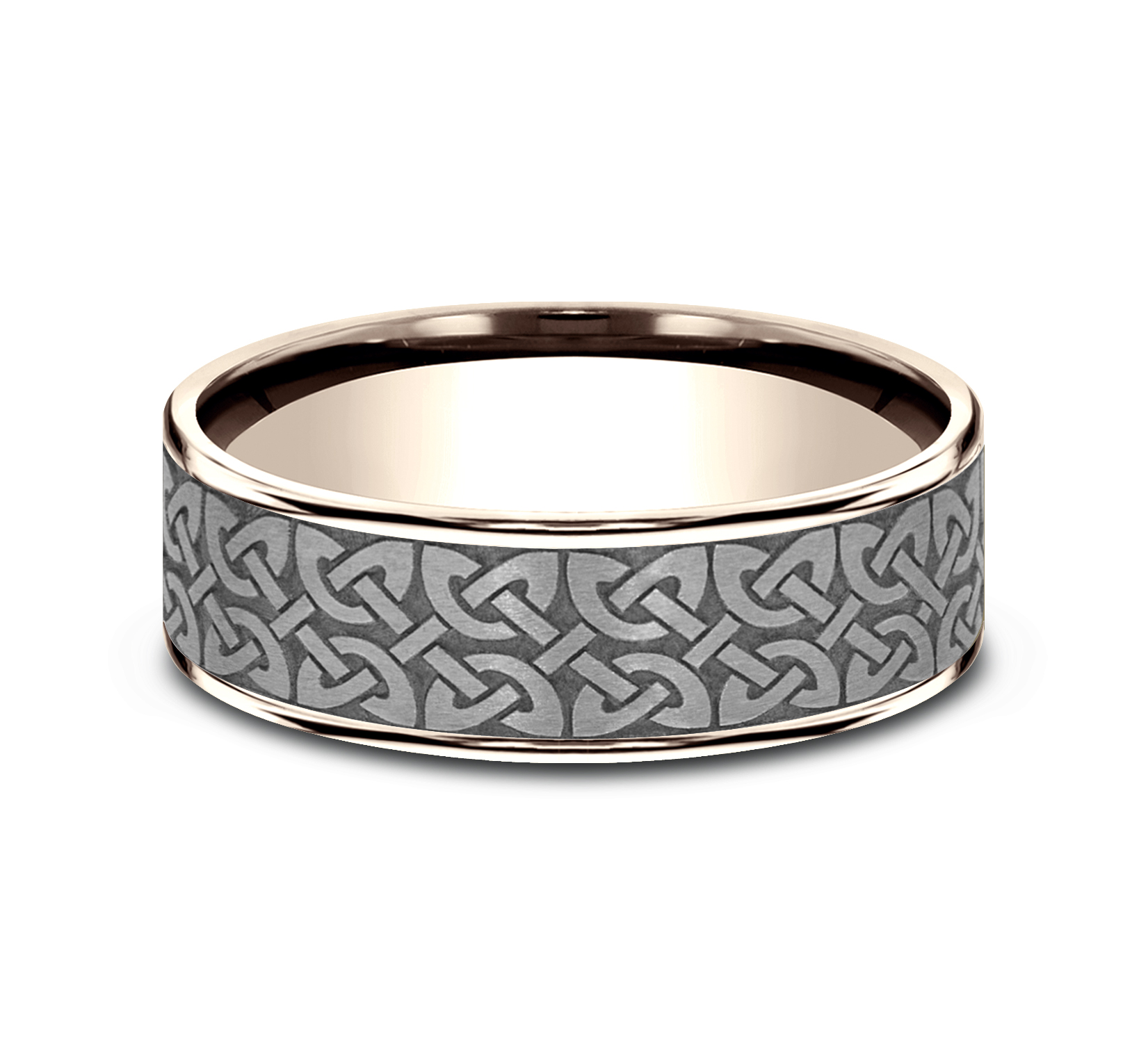 7.5mm, Comfort fit 14K Rose Gold and Grey Tantalum Celtic knot designed center, thin polished edges