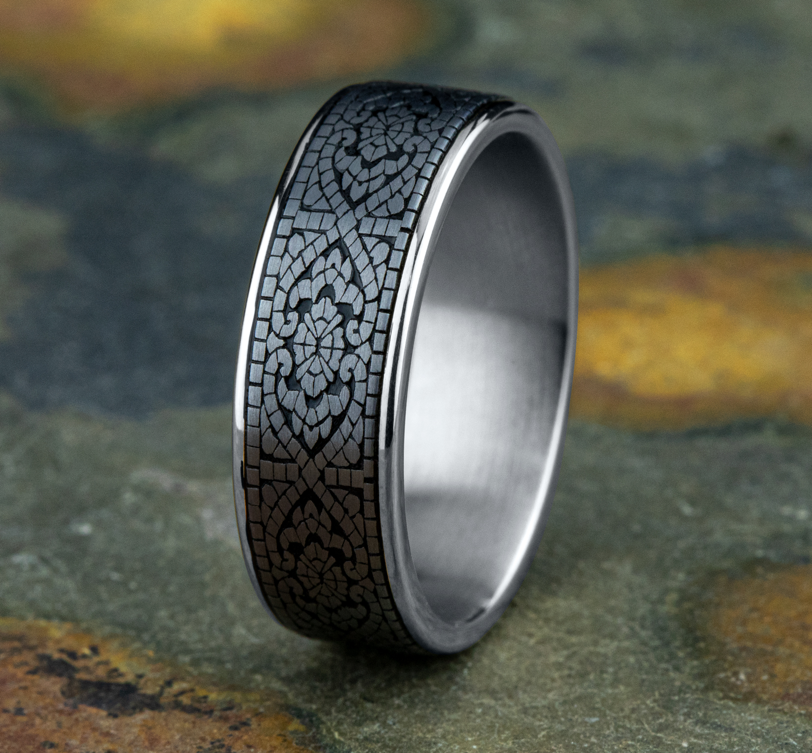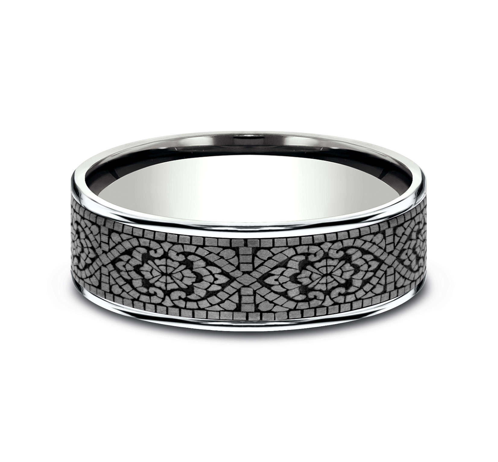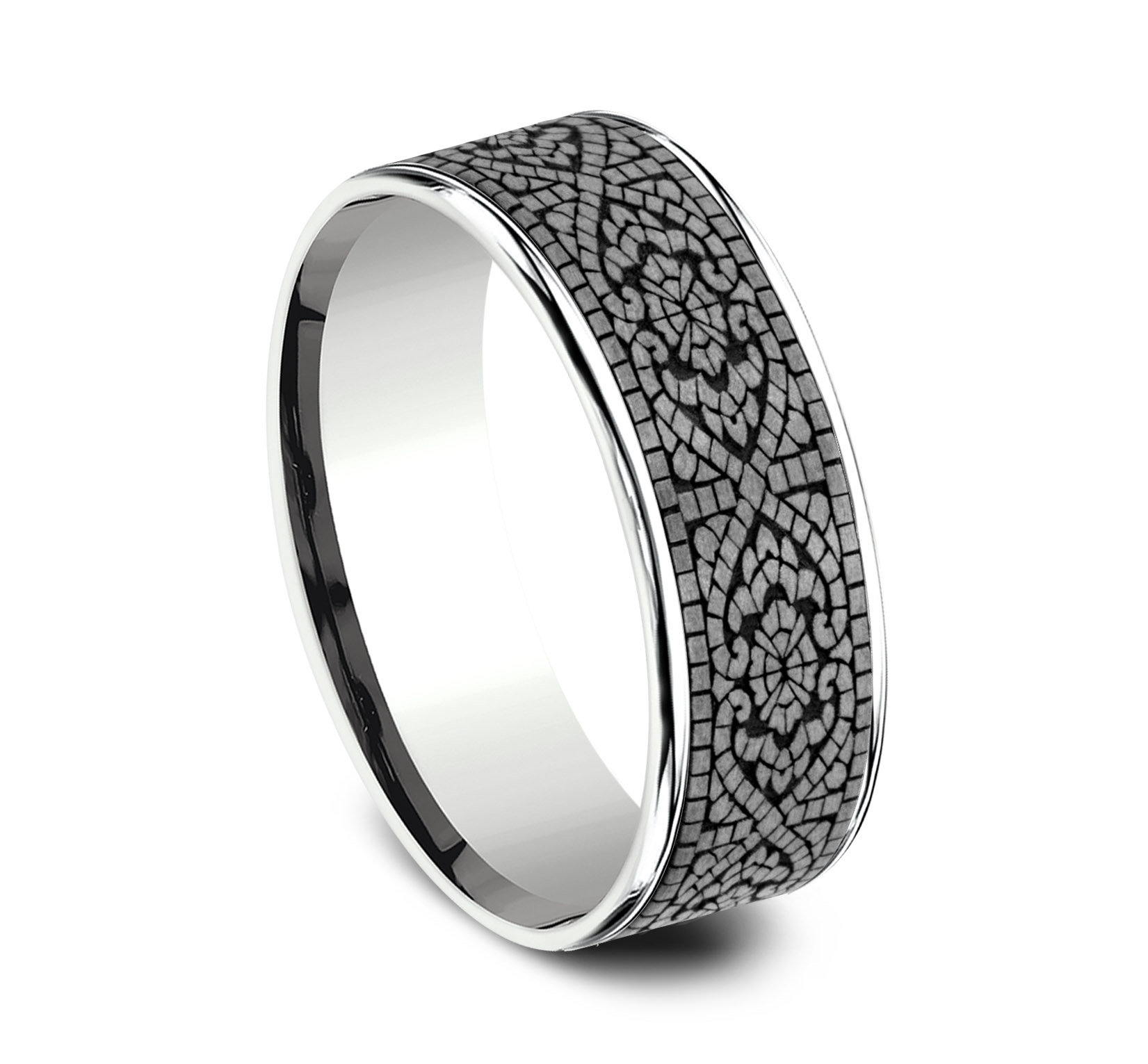 7.5mm, Comfort fit 14K White Gold and Grey Tantalum Mosaic patterned center, thin edges