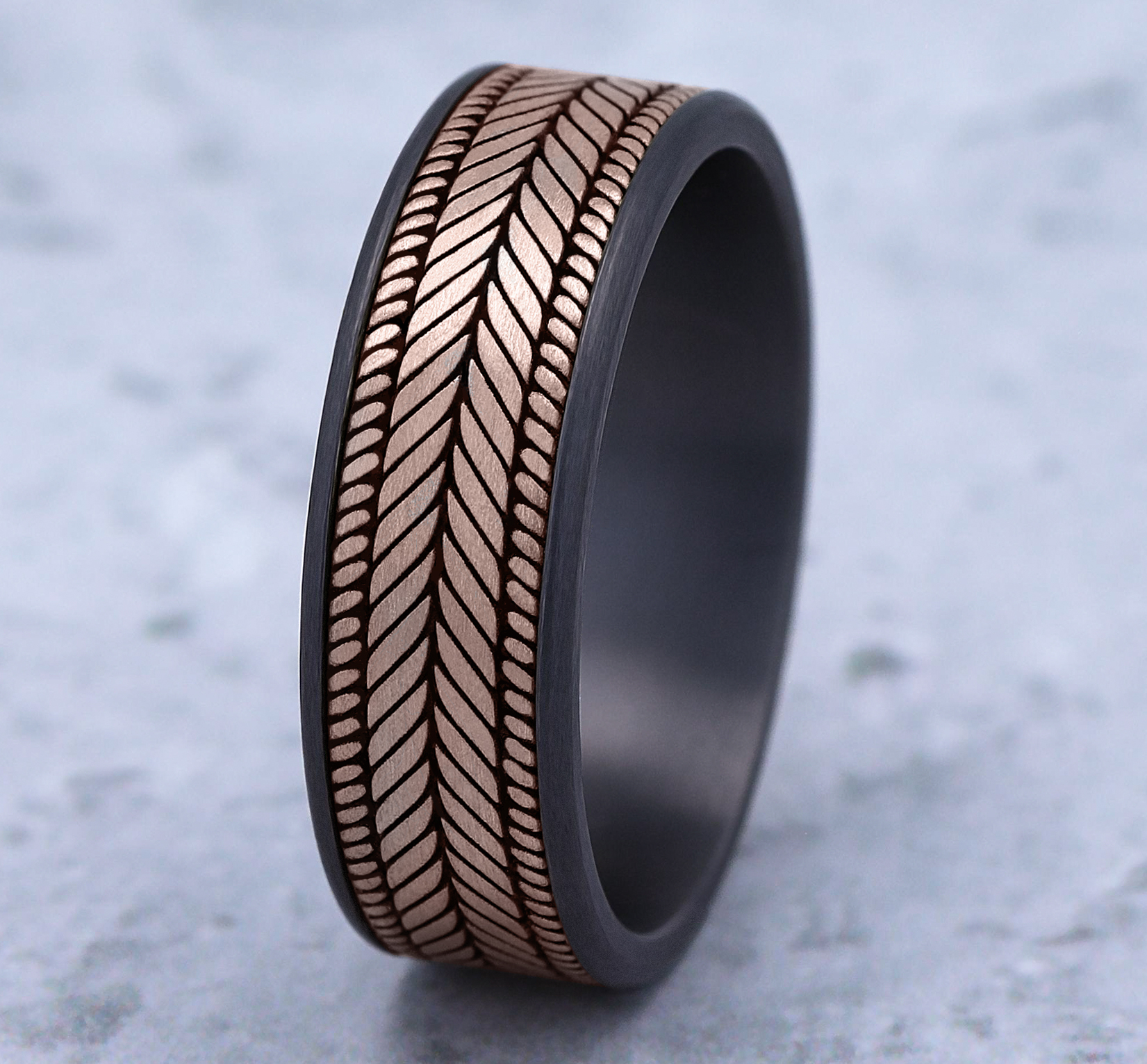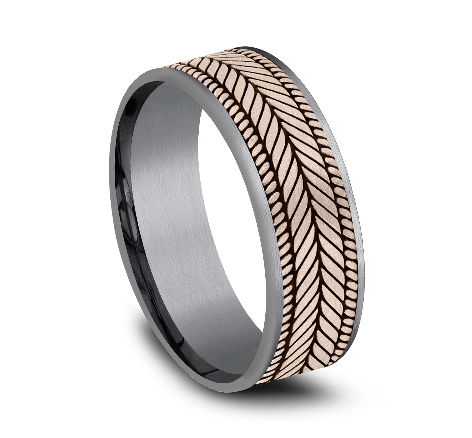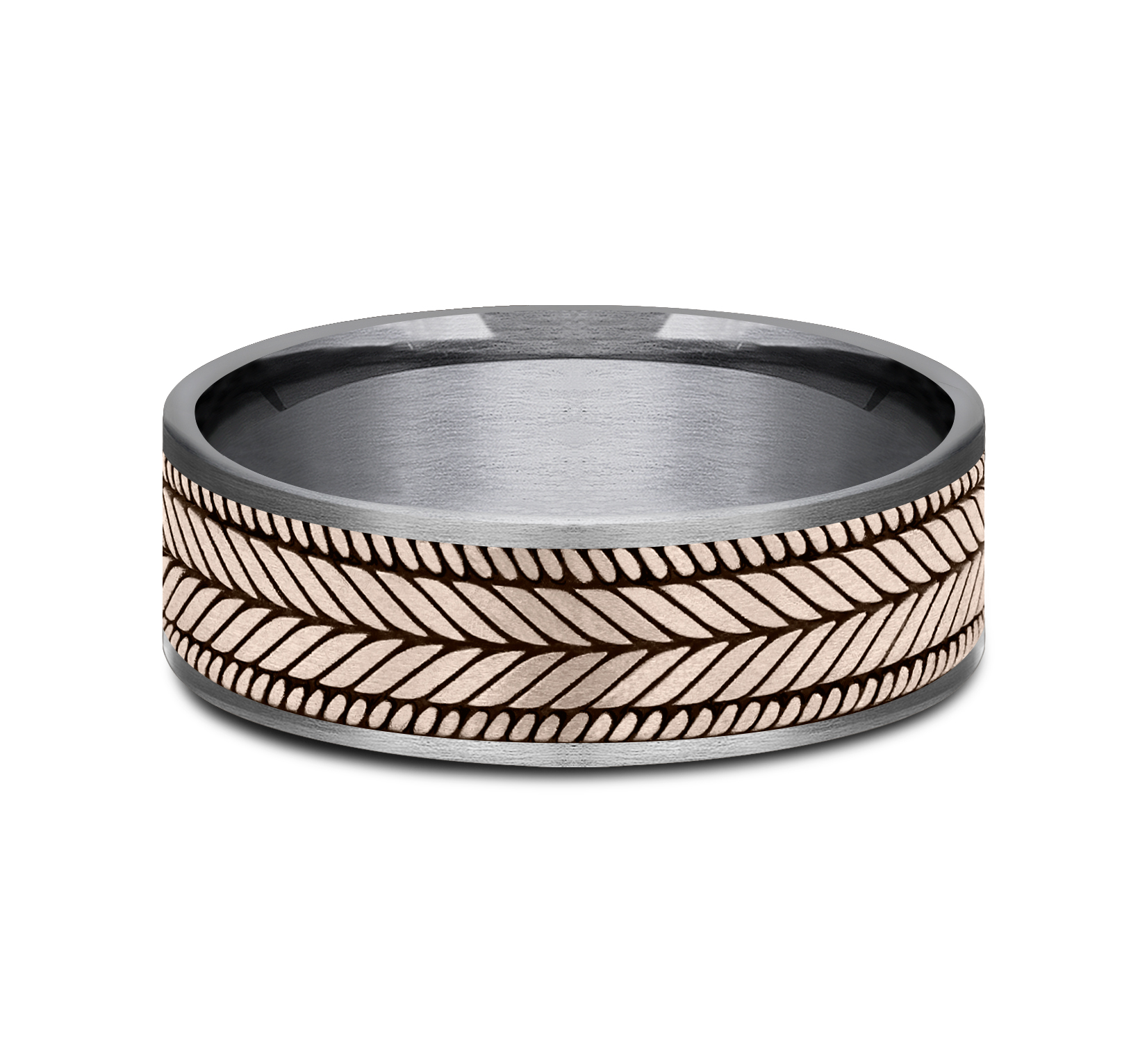 7.5mm, Comfort fit Grey Tantalum and 14K Rose Gold Chevron weave pattern, thin edges