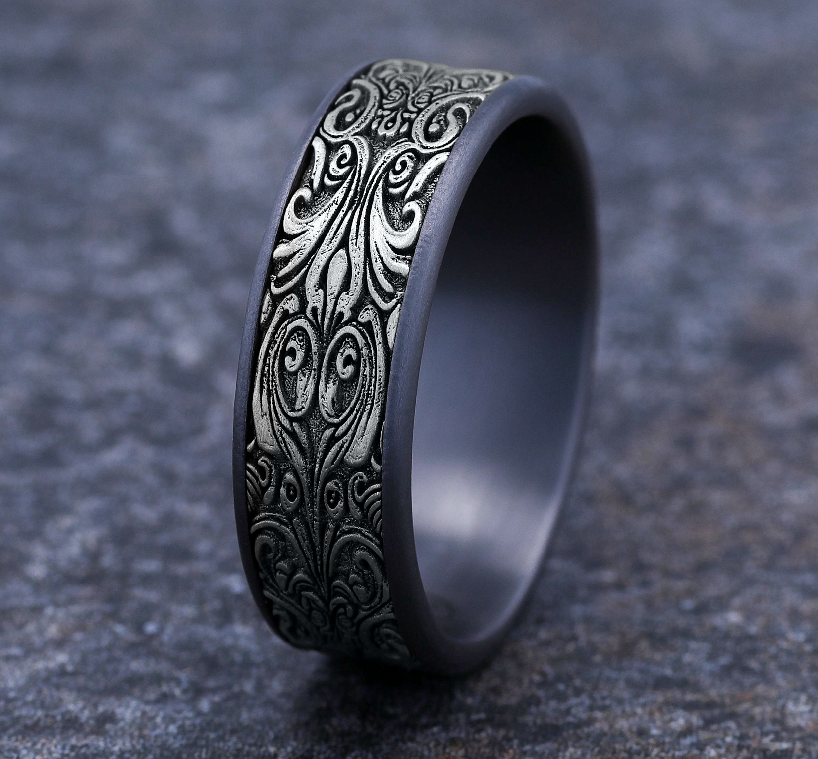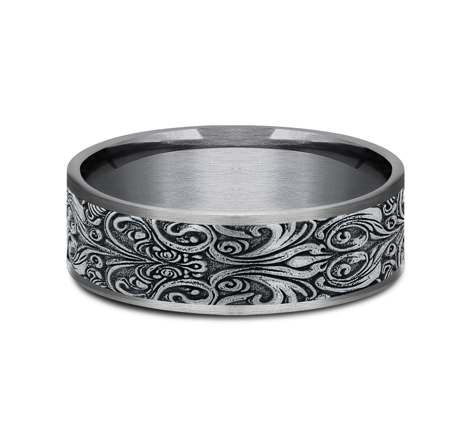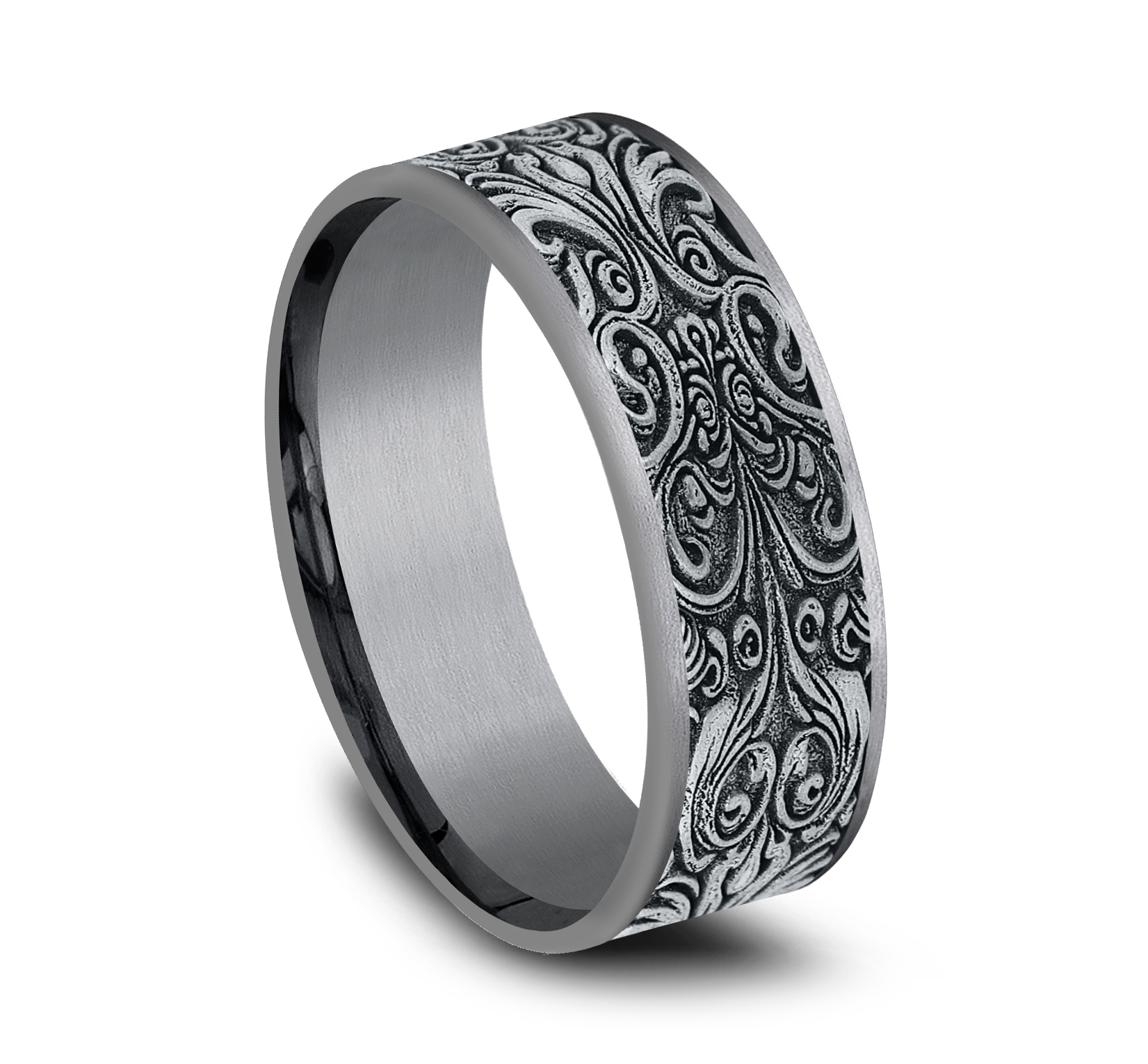 7.5mm, Comfort fit Grey Tantalum and 14K White Gold Baroque frame pattern, thin edges
