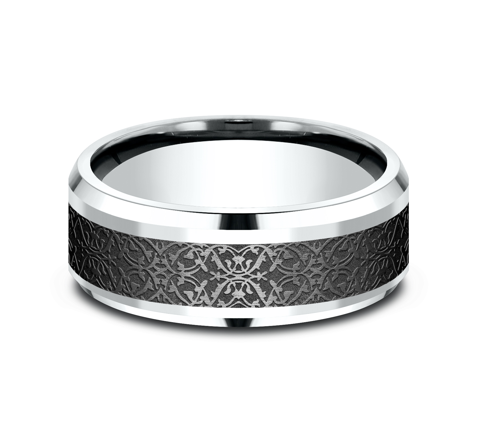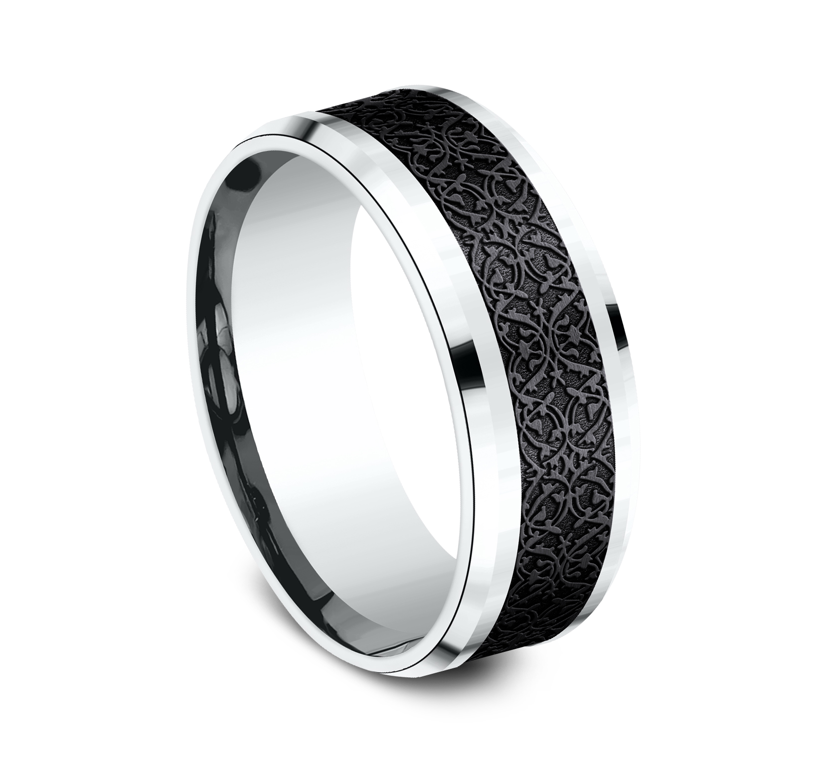 8mm, Comfort fit 14K White Gold and Black Titanium Ottoman pattern, polished drop bevel edges