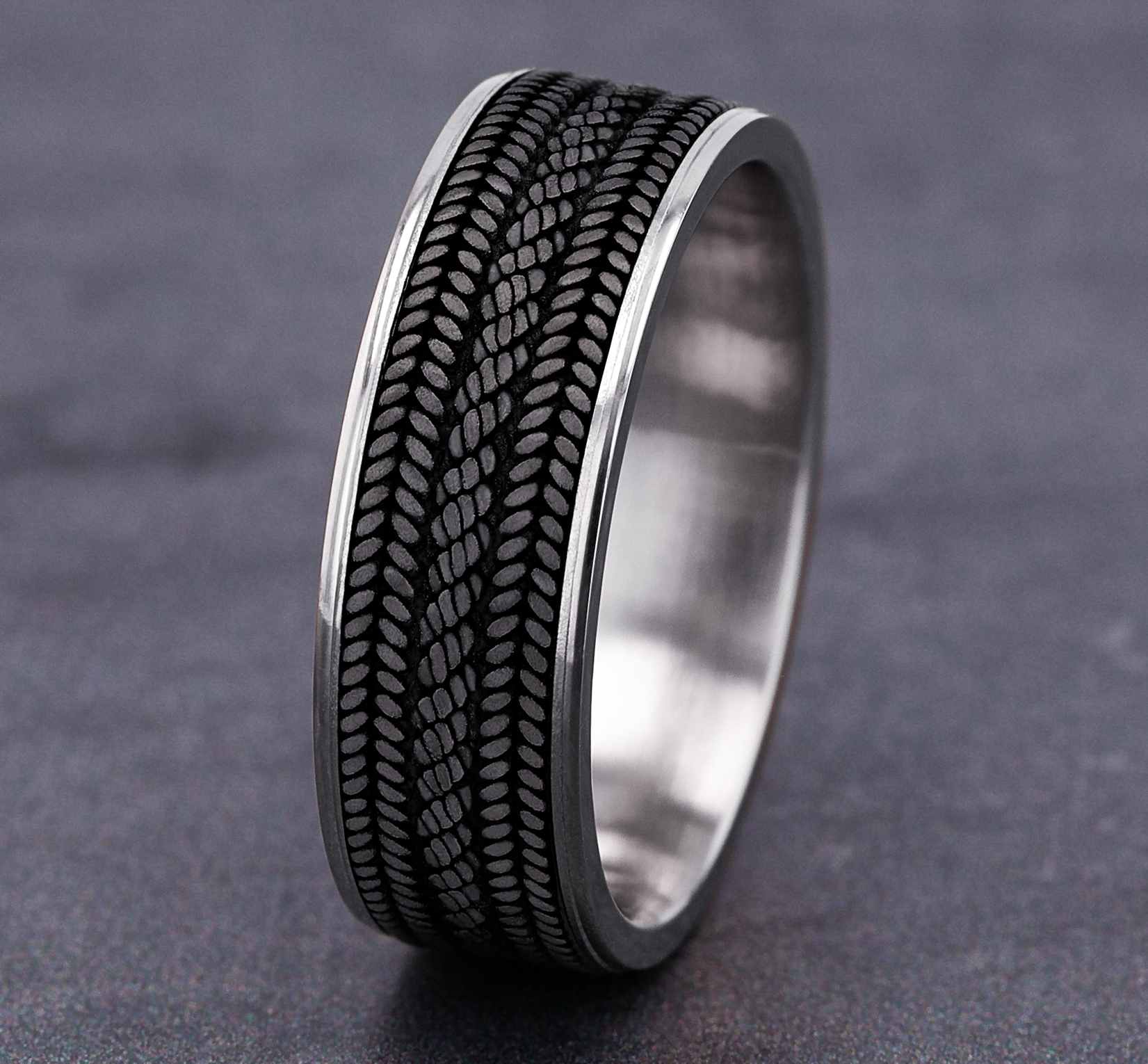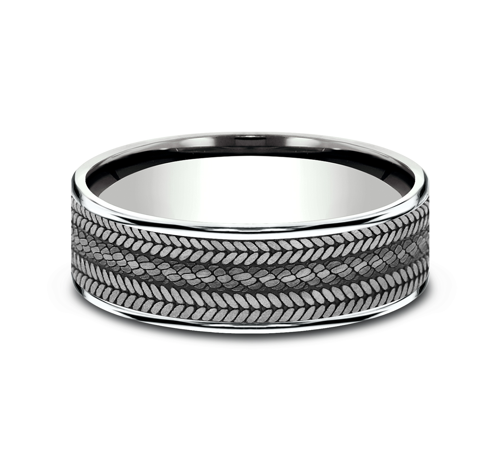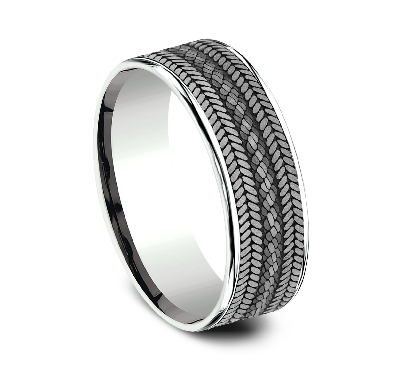 7.5mm, Comfort fit 14K White Gold and Grey Tantalum Rope center with chevron edge pattern, thin edges