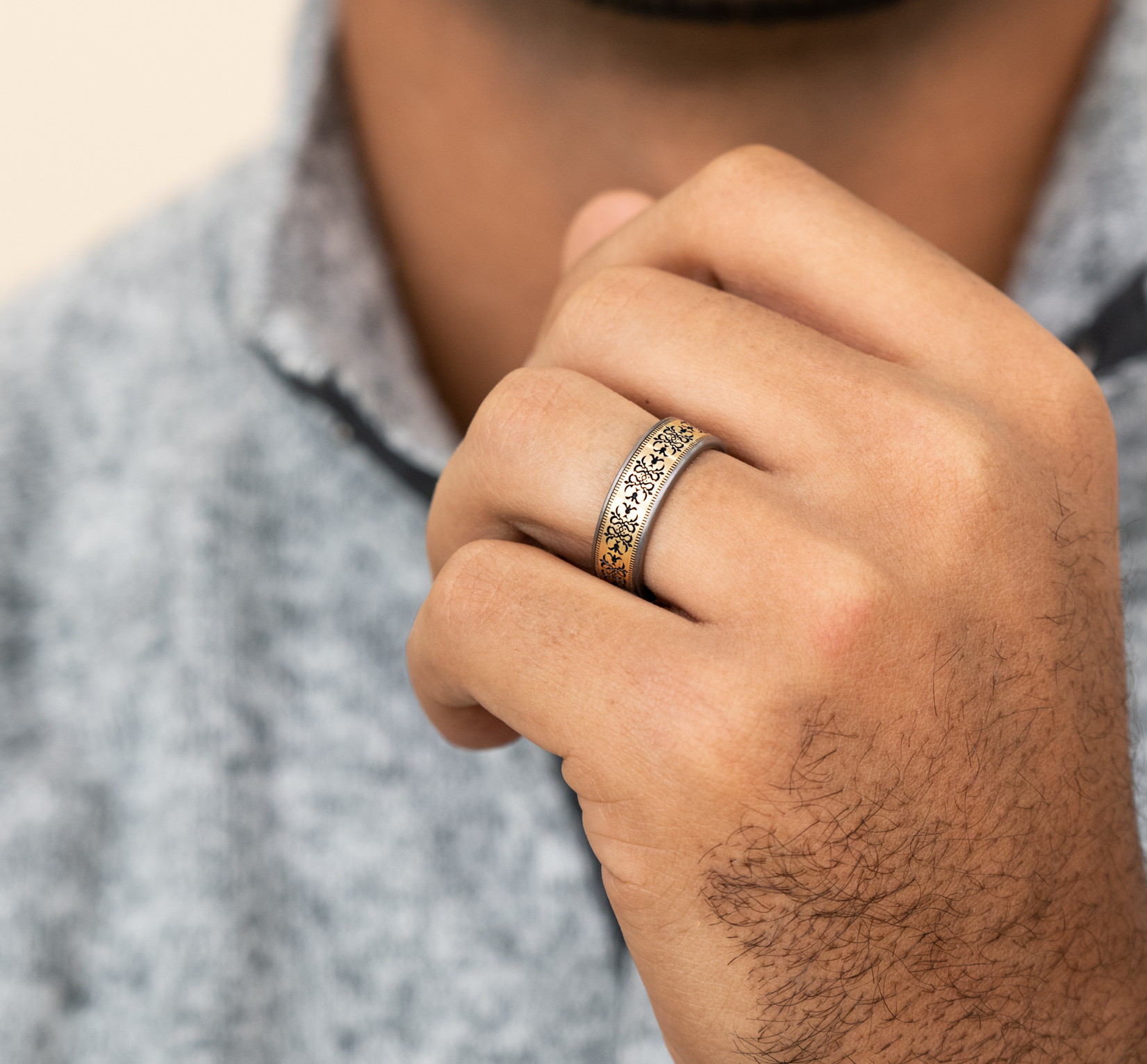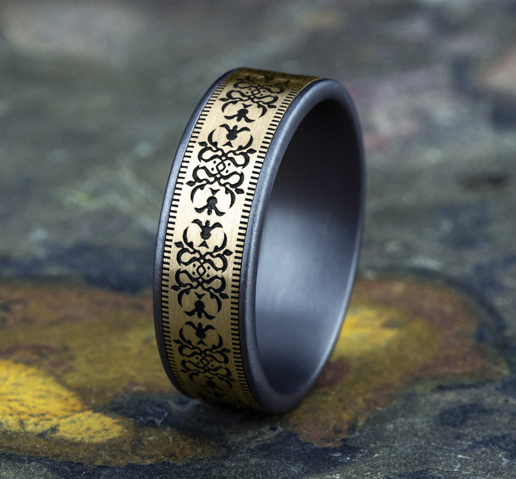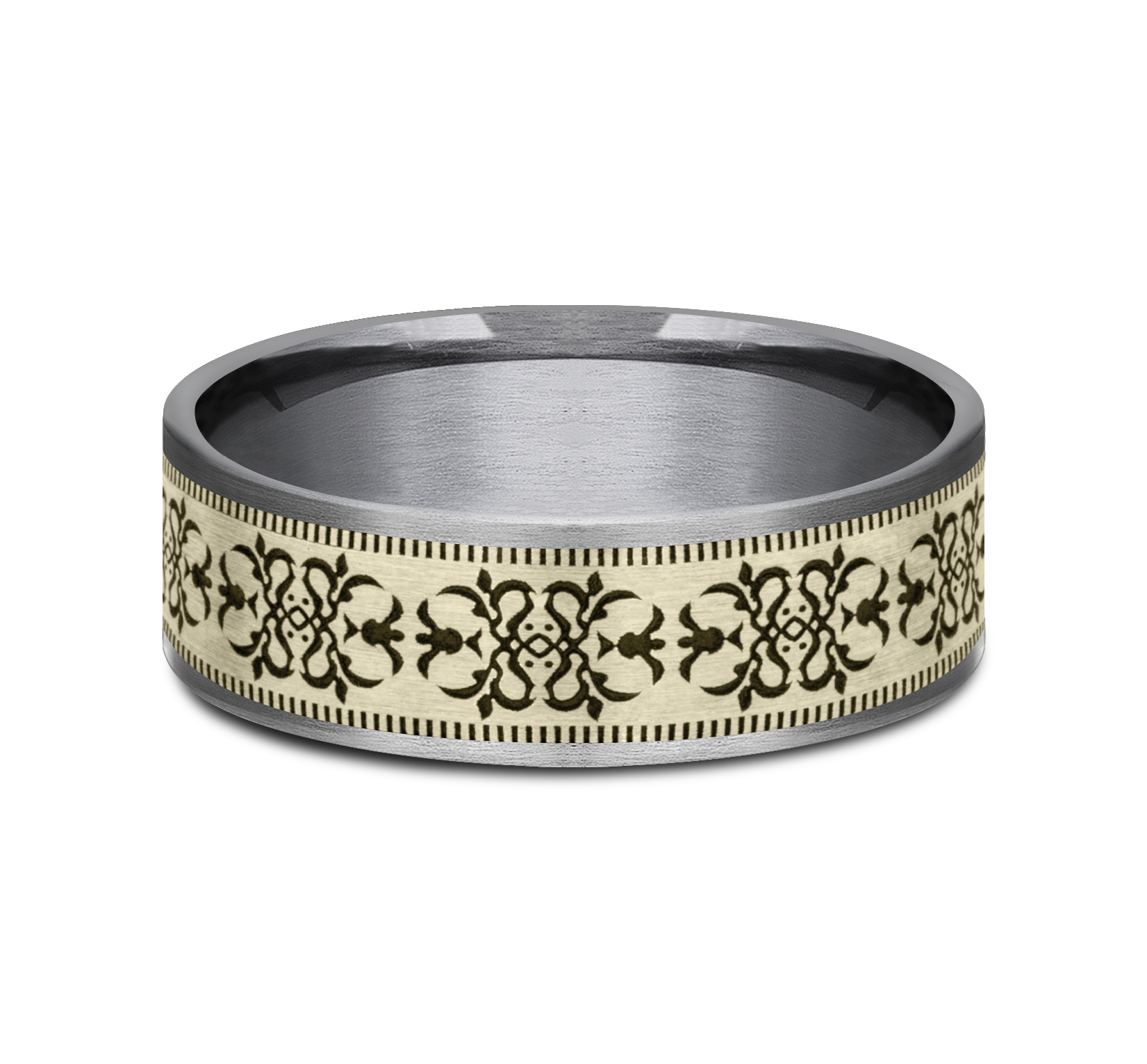 7.5mm, Comfort fit Grey Tantalum and 14K Yellow Baroque style pattern with milgrain detail