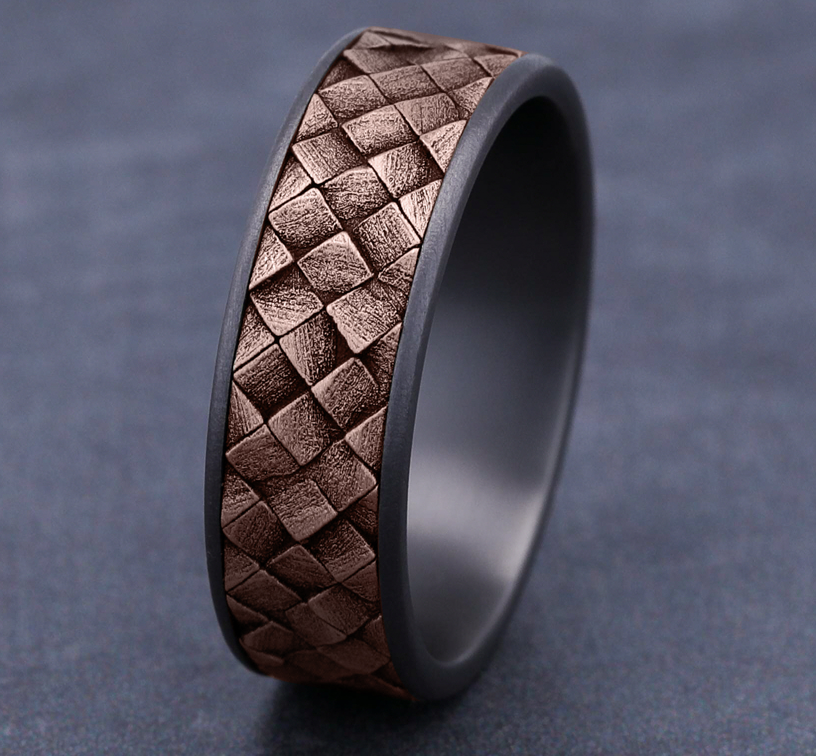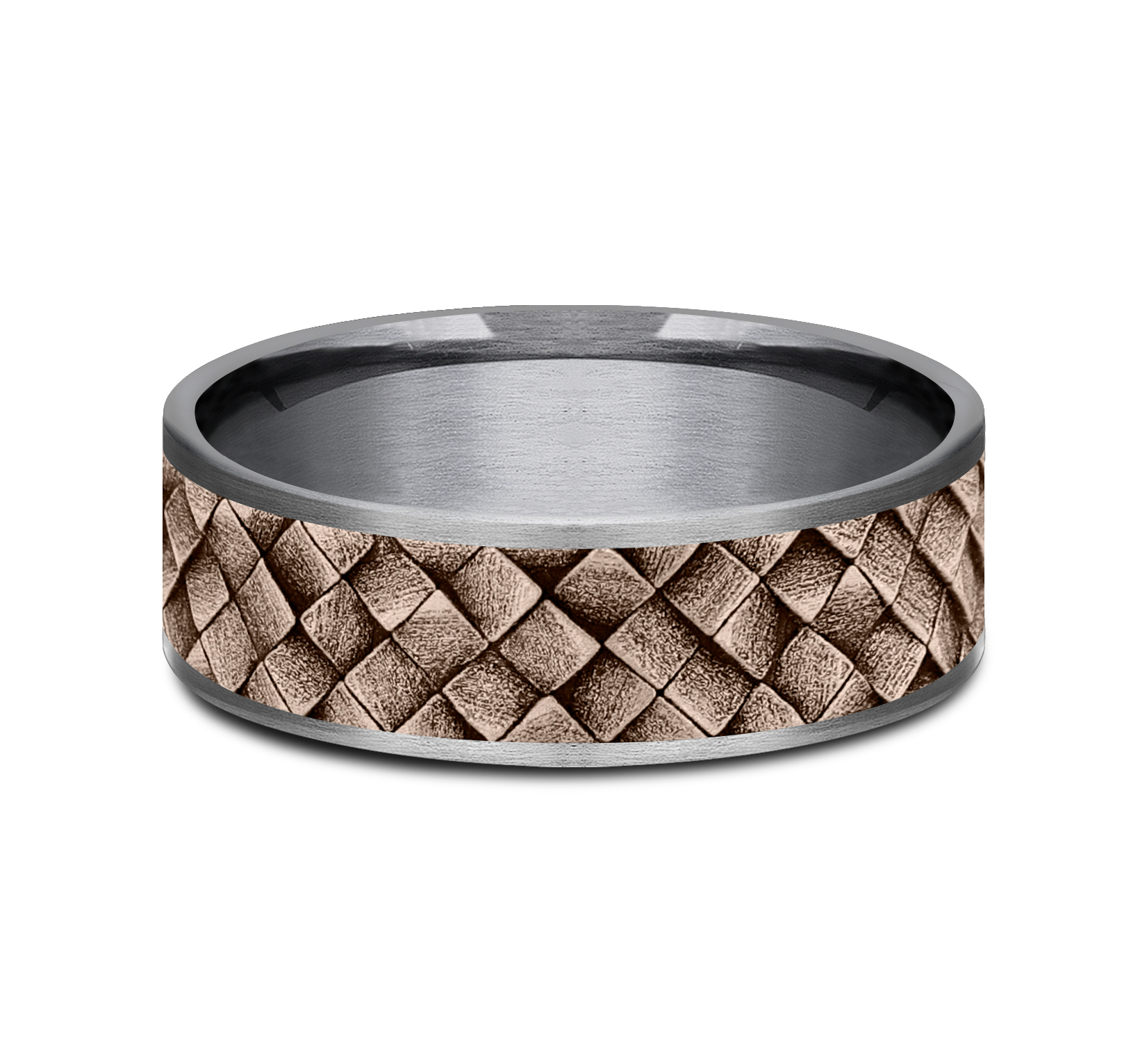 7.5mm, Comfort fit Grey Tantalum and 14K Rose Gold Cross hatch square pattern, thin edges