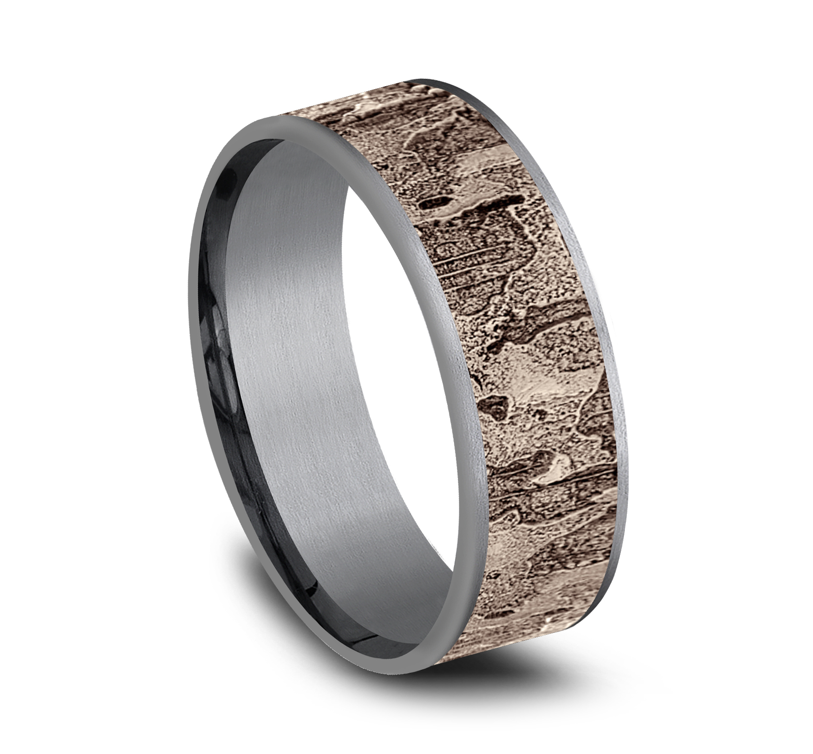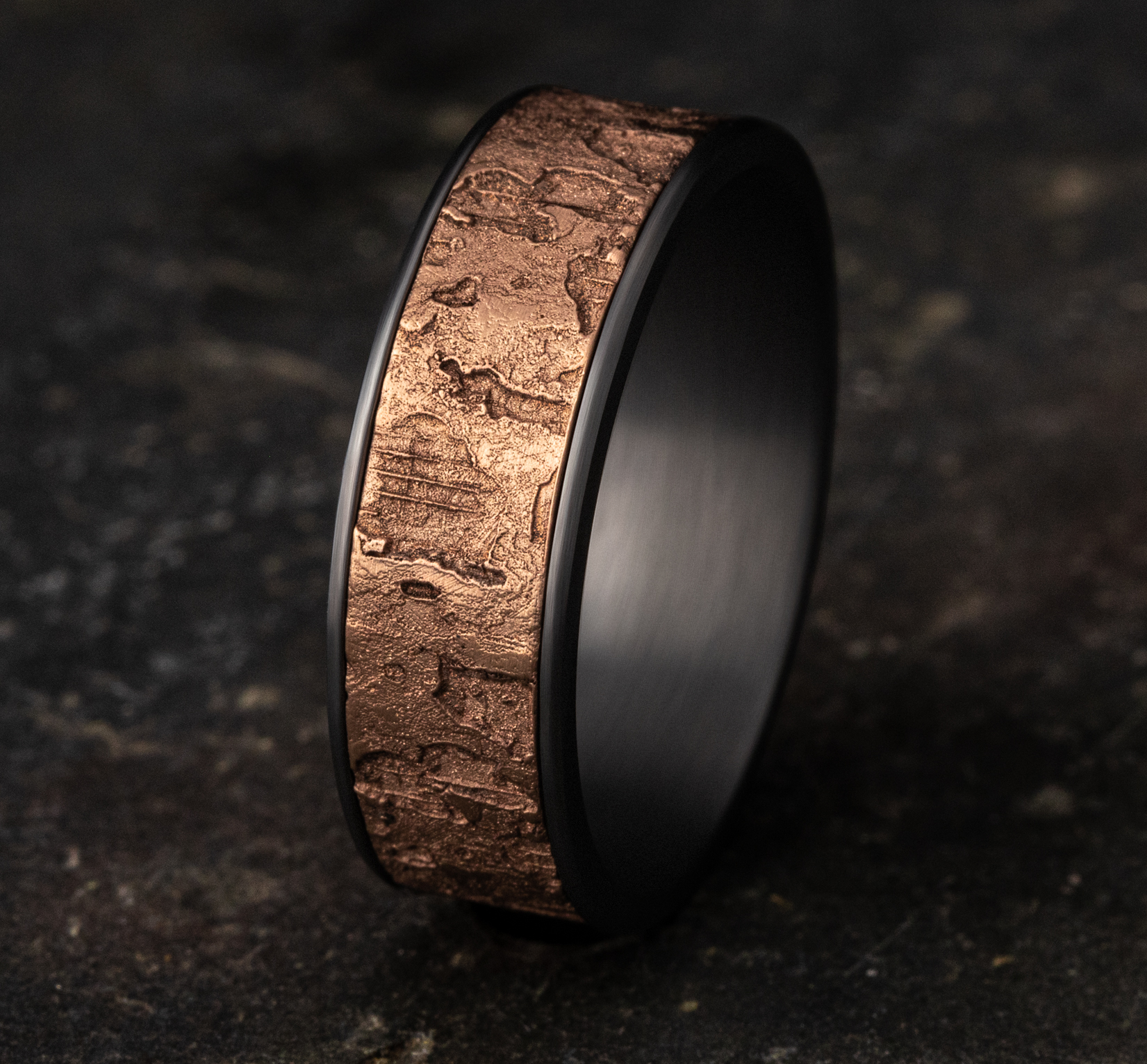 7.5mm, Comfort fit Grey Tantalum and 14K Rose Gold Wall fracture designed center, thin edges