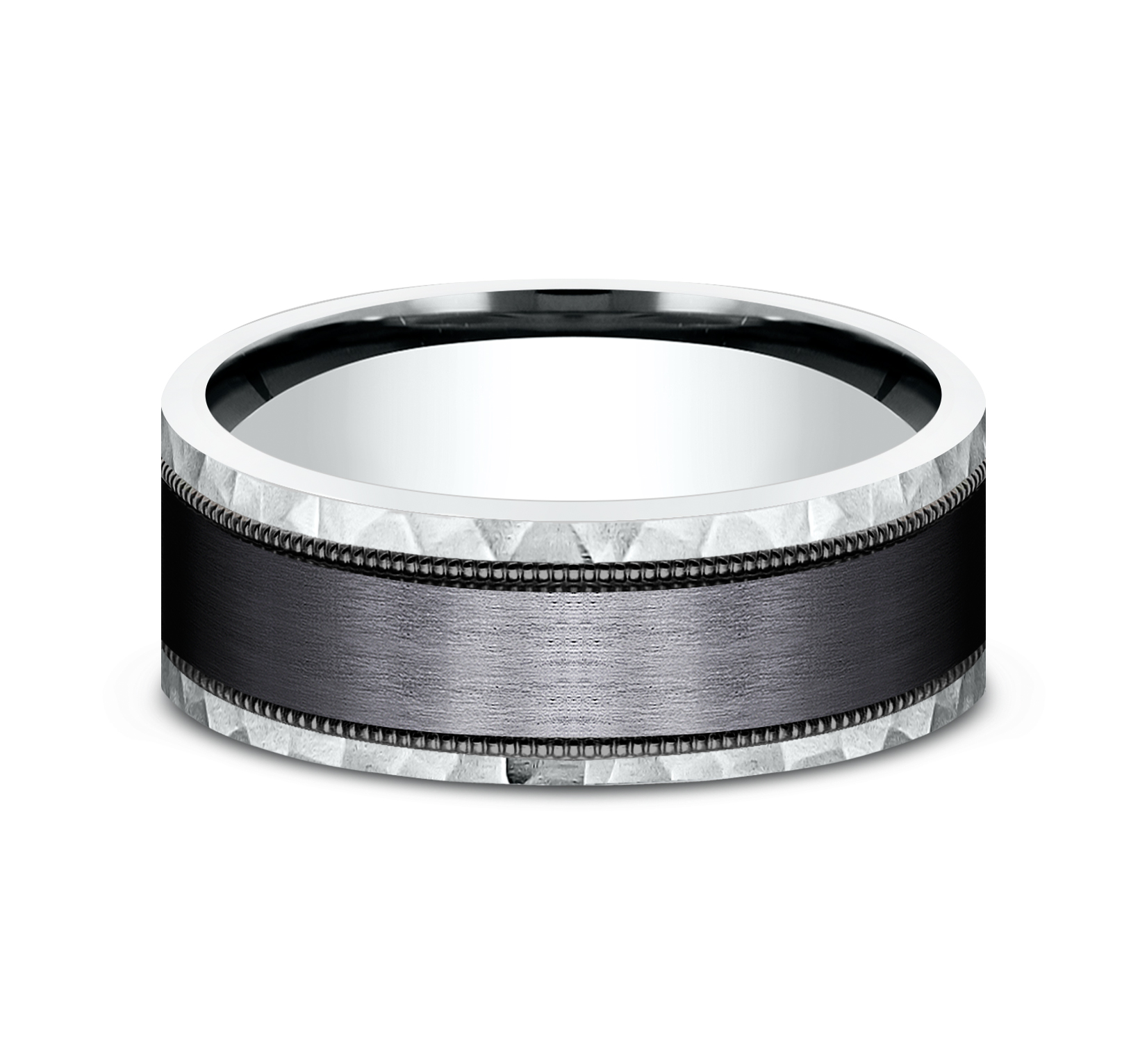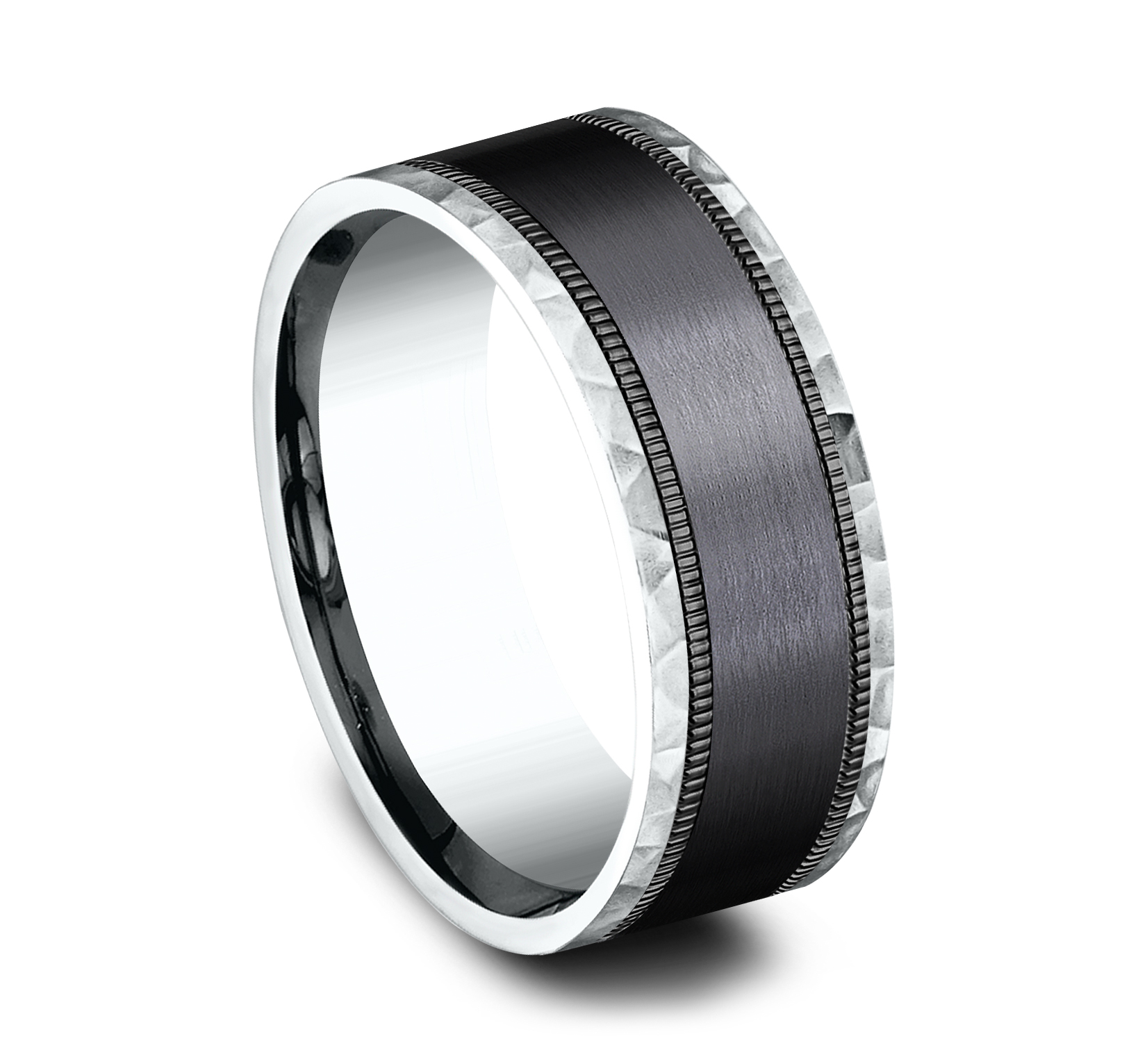 8mm, Comfort fit 14K White Gold and Black Titanium Satin center, milgrain detailing, hammered edges