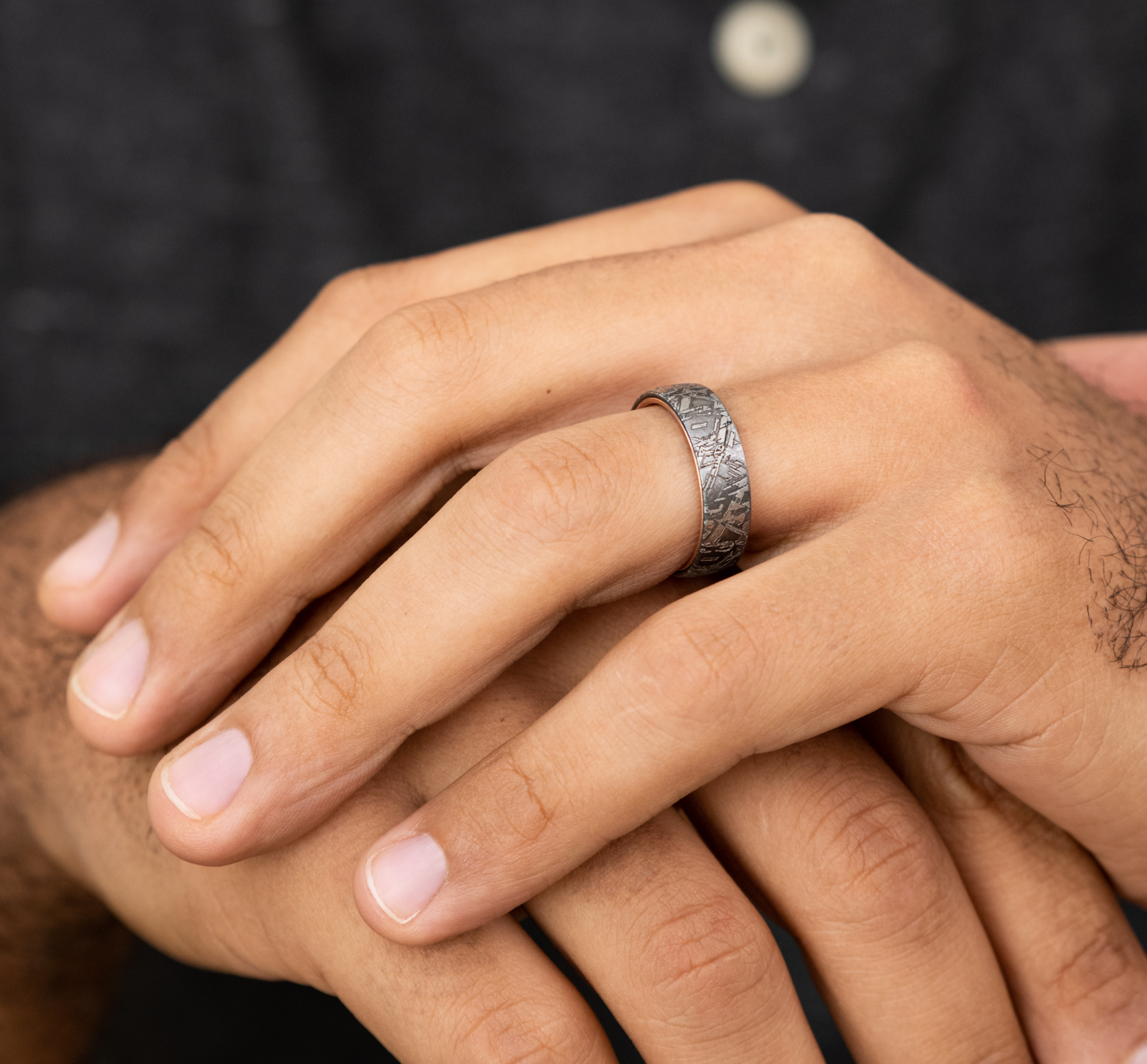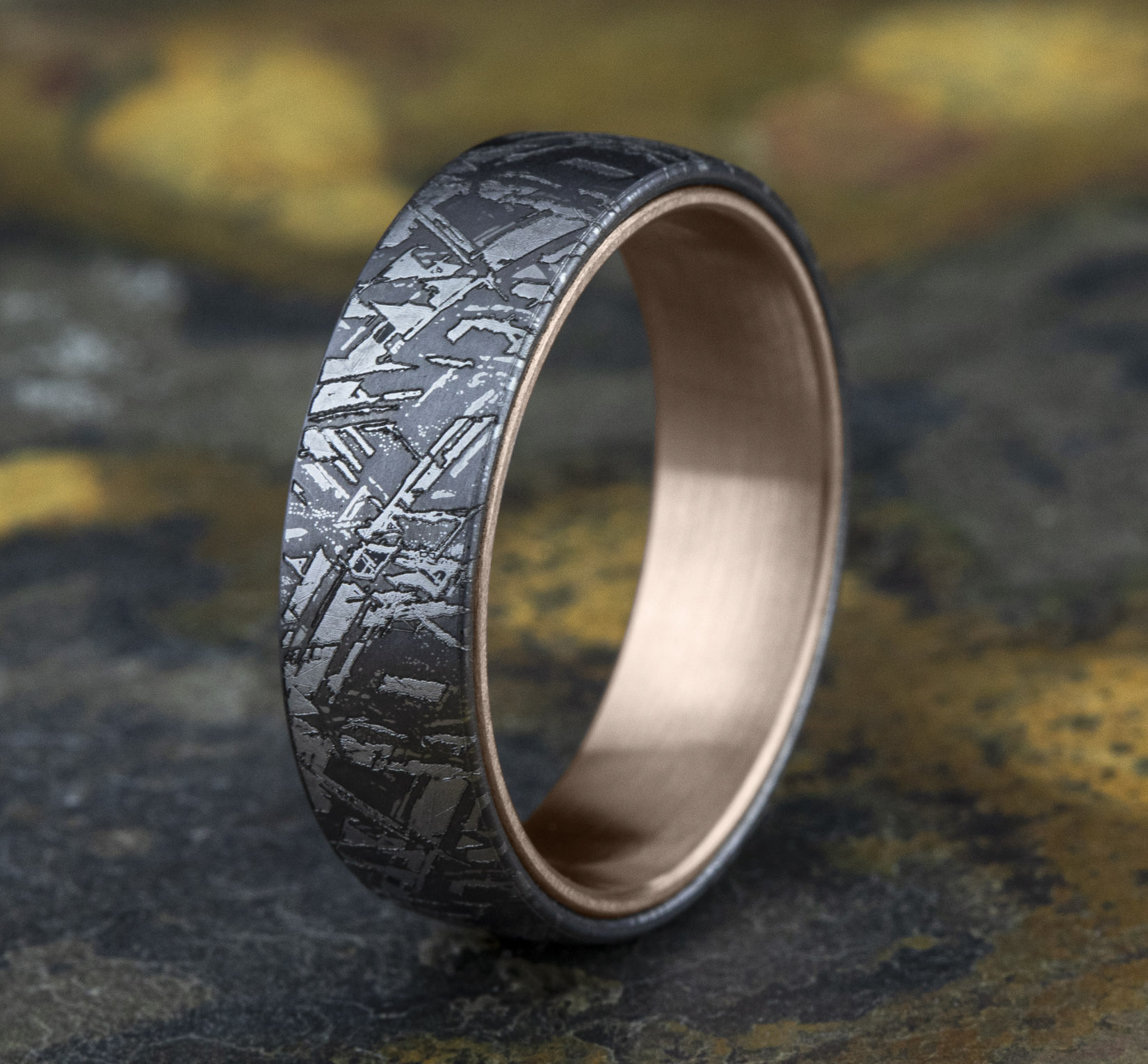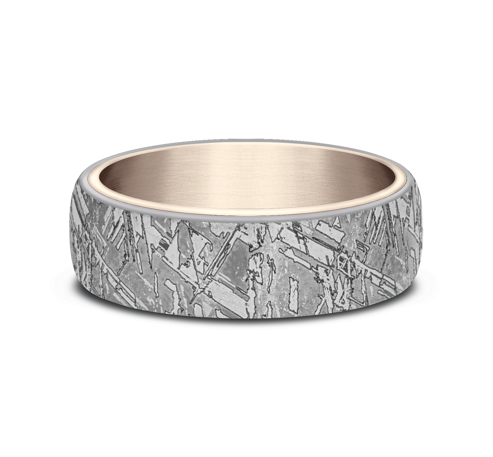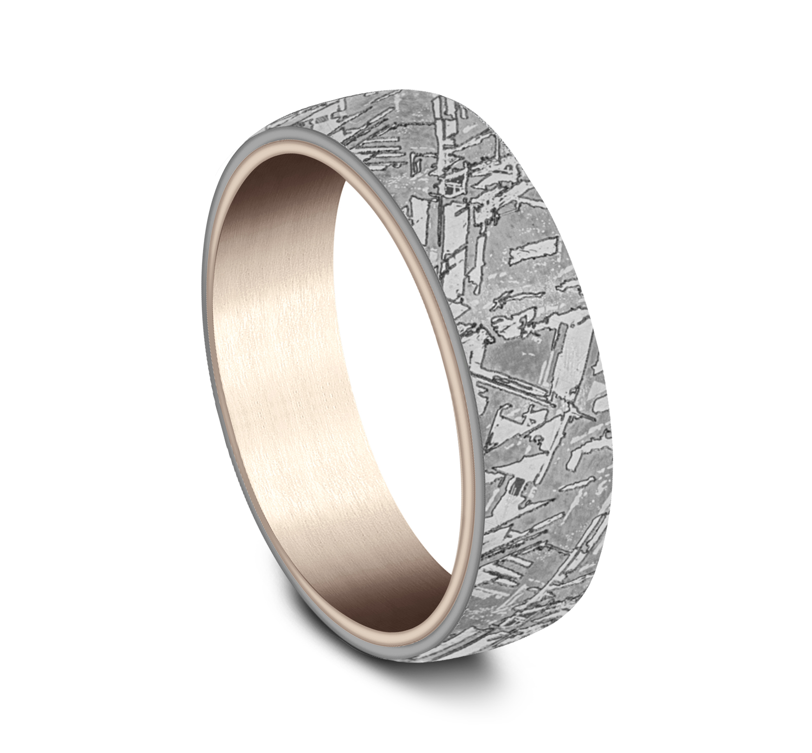 6.5mm, Comfort fit Grey Tantalum and 14K Rose Gold Meteorite pattern