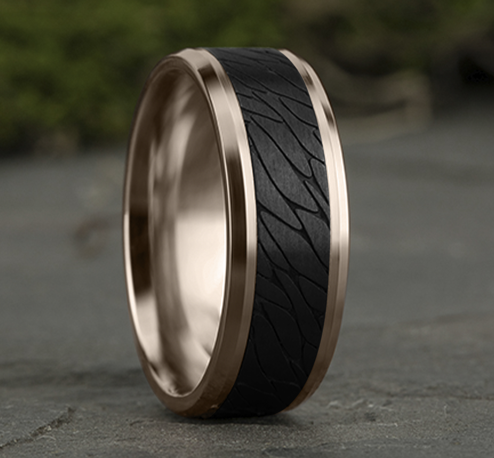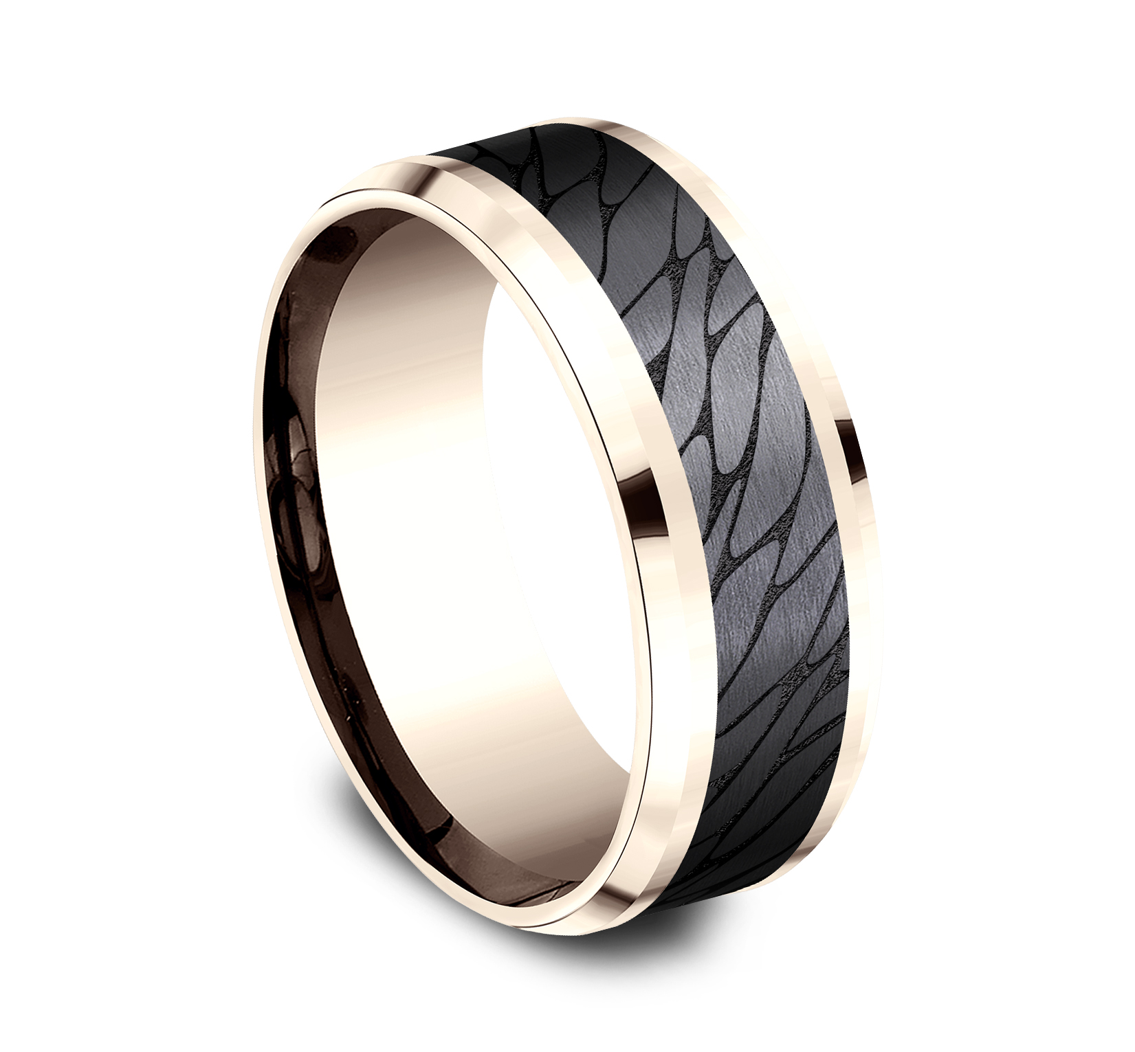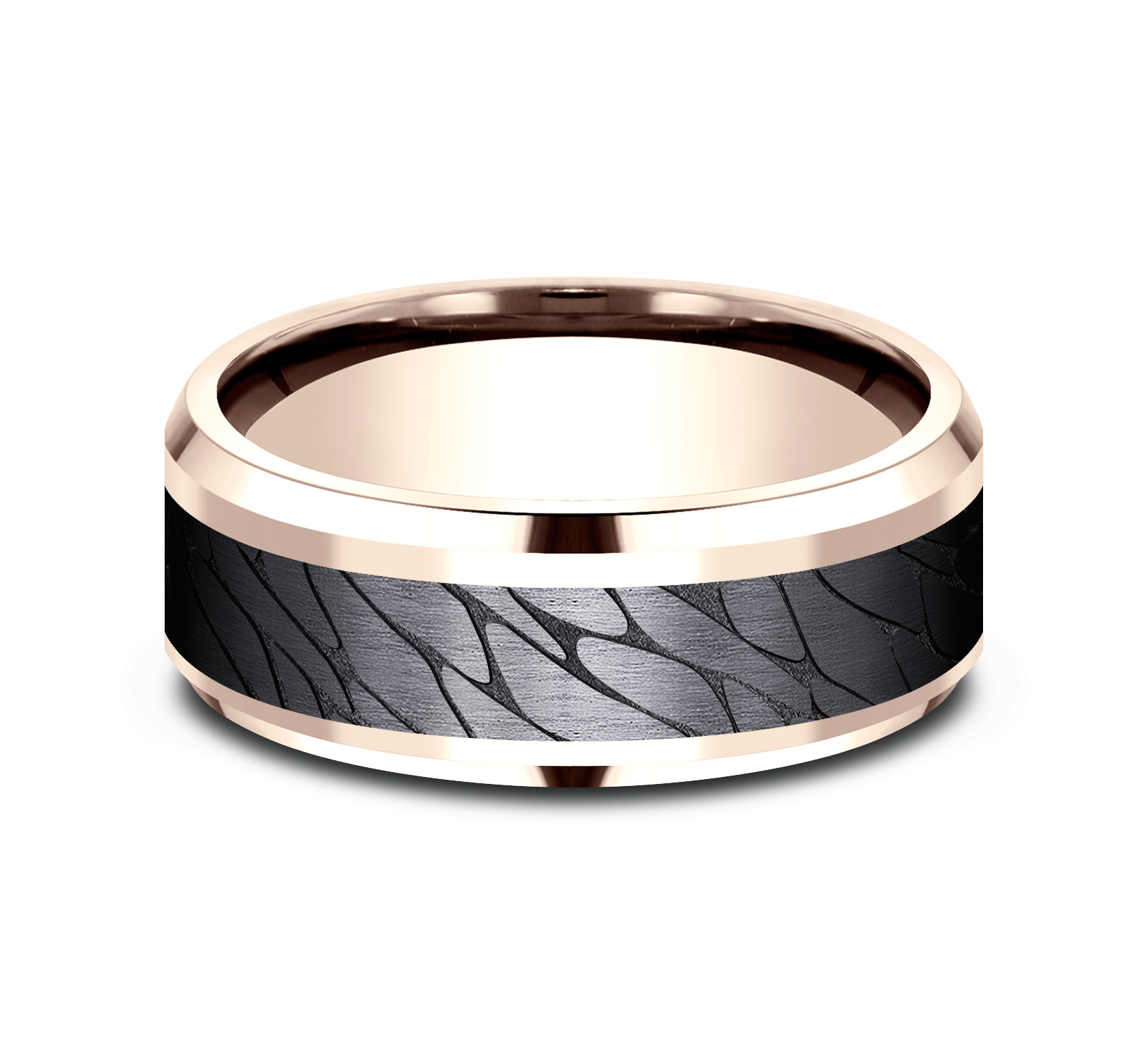 8mm, Comfort fit 14K Rose Gold and Black Titanium Pebble patterned center, bevel edges