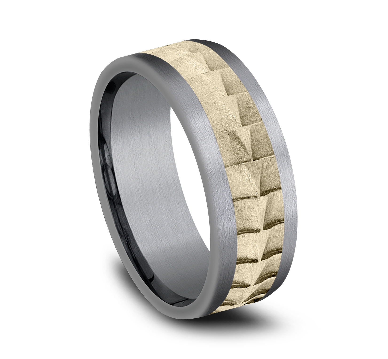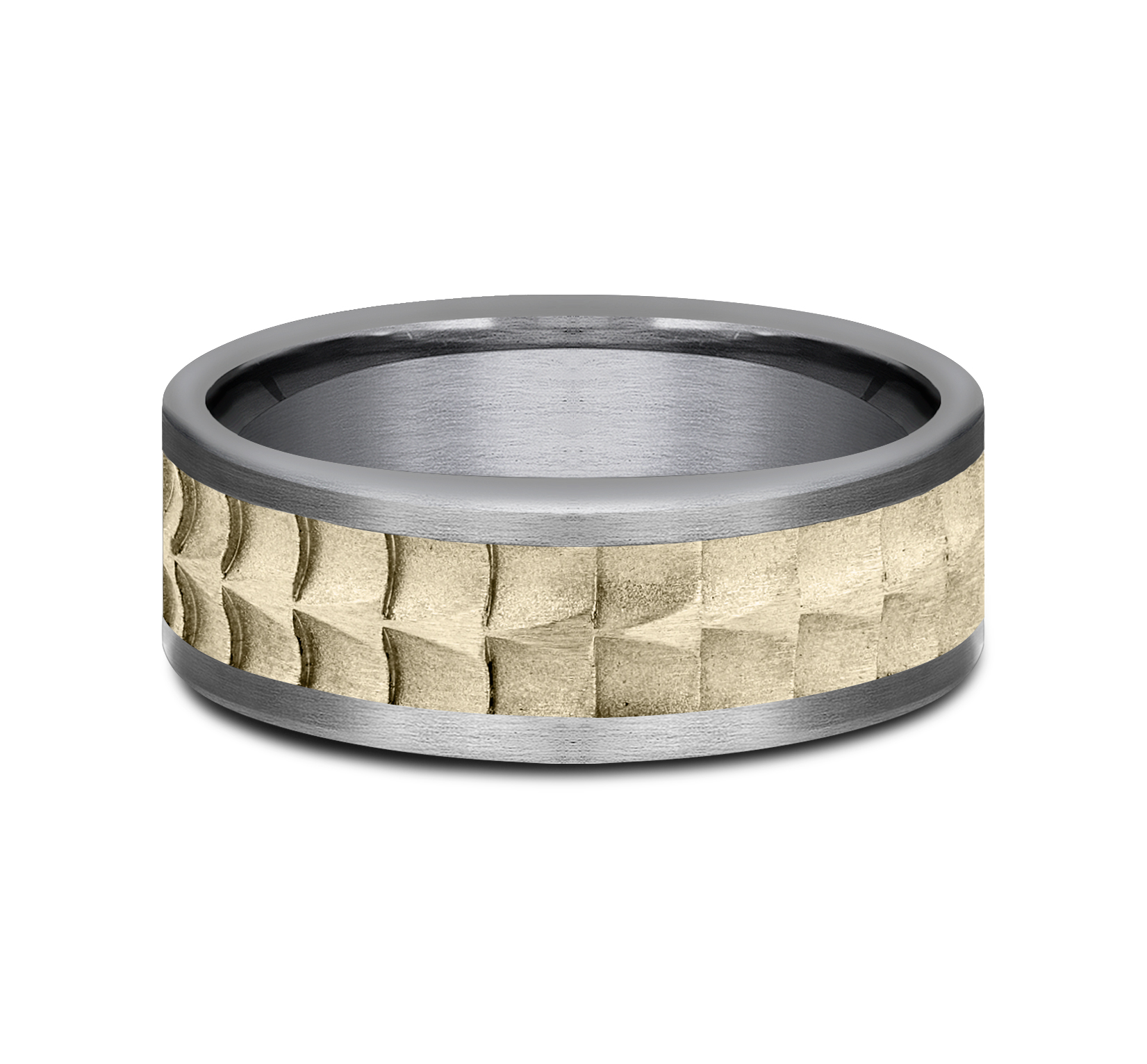 8mm, Comfort fit Grey Tantalum and 14K Yellow Gold Crocodile skin patterned center