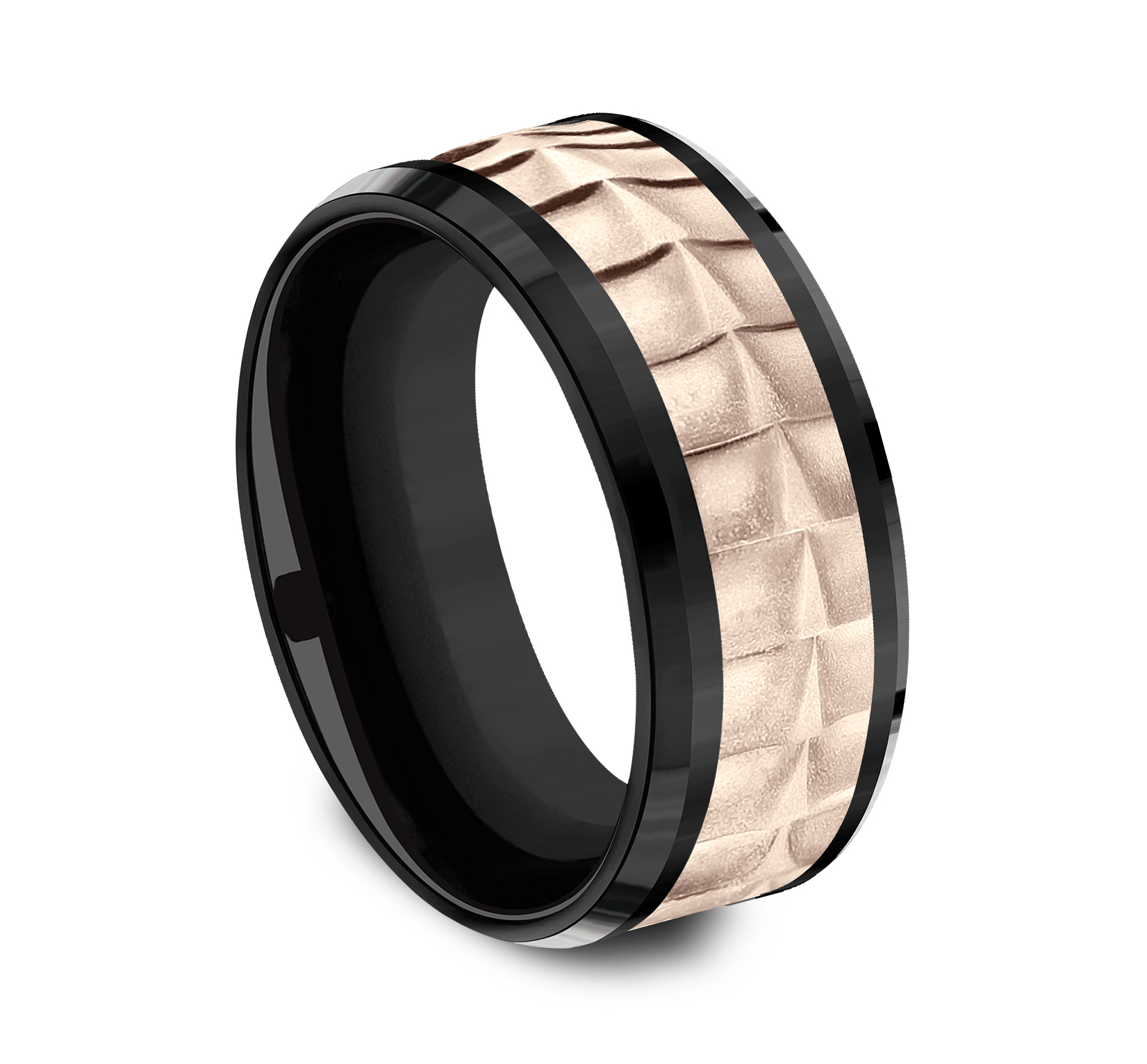 9mm, Comfort fit Black Titanium and 14K Rose Gold Crocodile skin patterned center, polished bevel edges