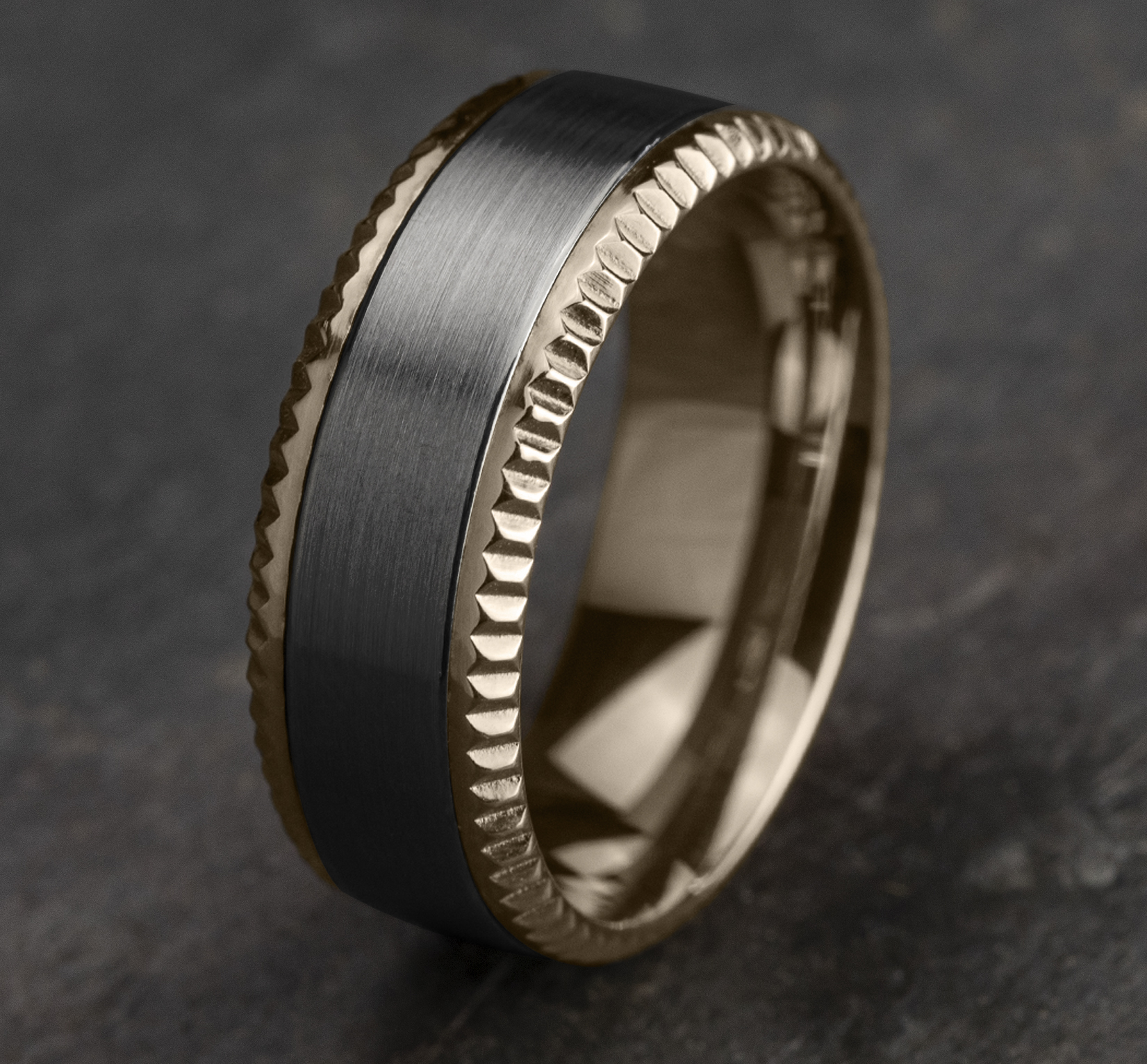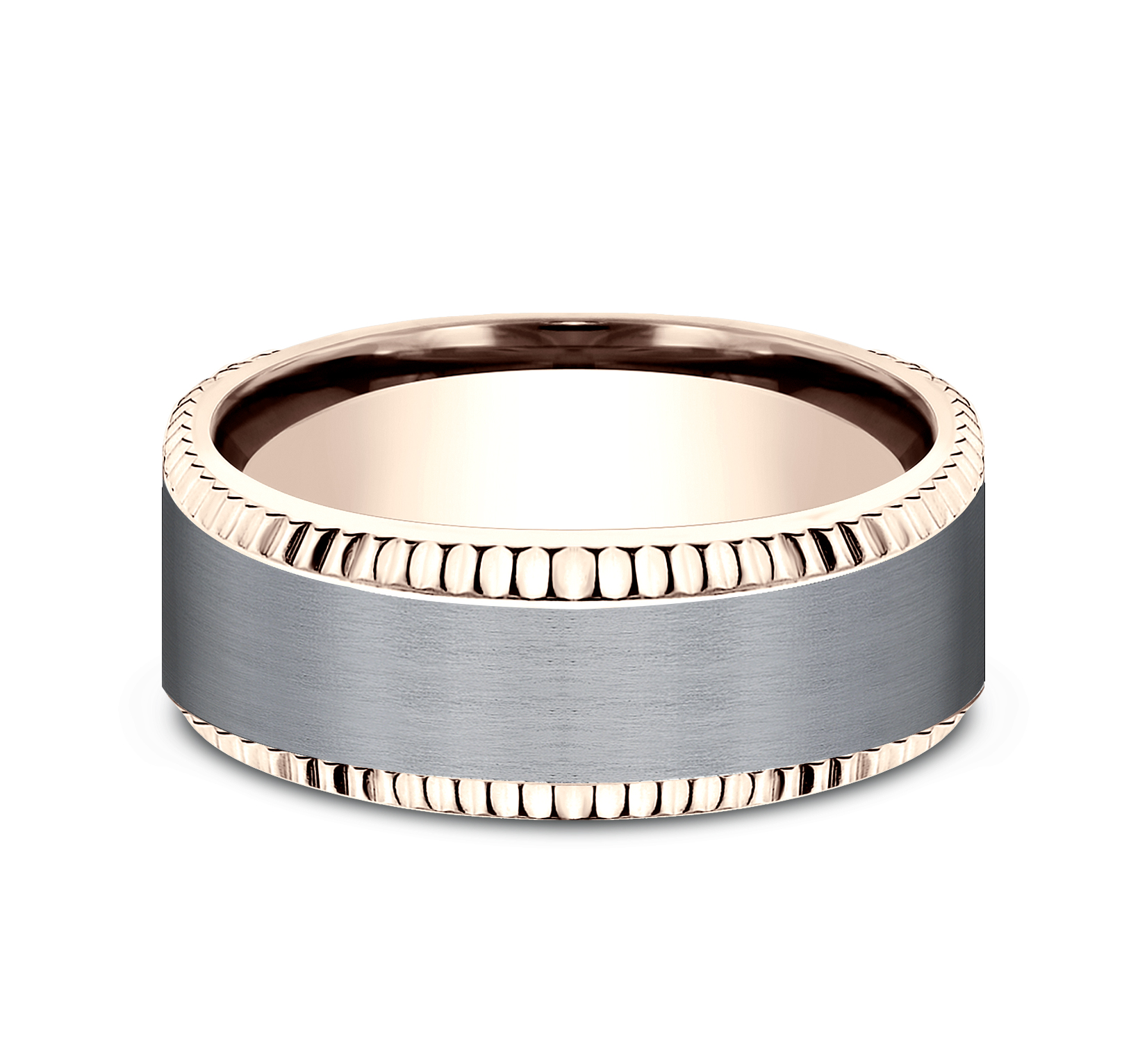 8mm, Comfort fit 14K Rose Gold and Grey Tantalum Satin center,fluted bevel edges
