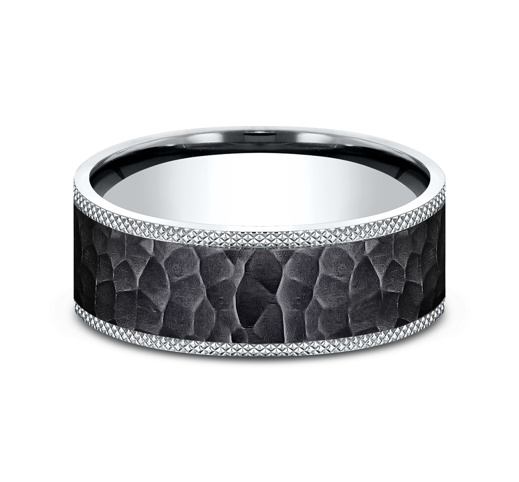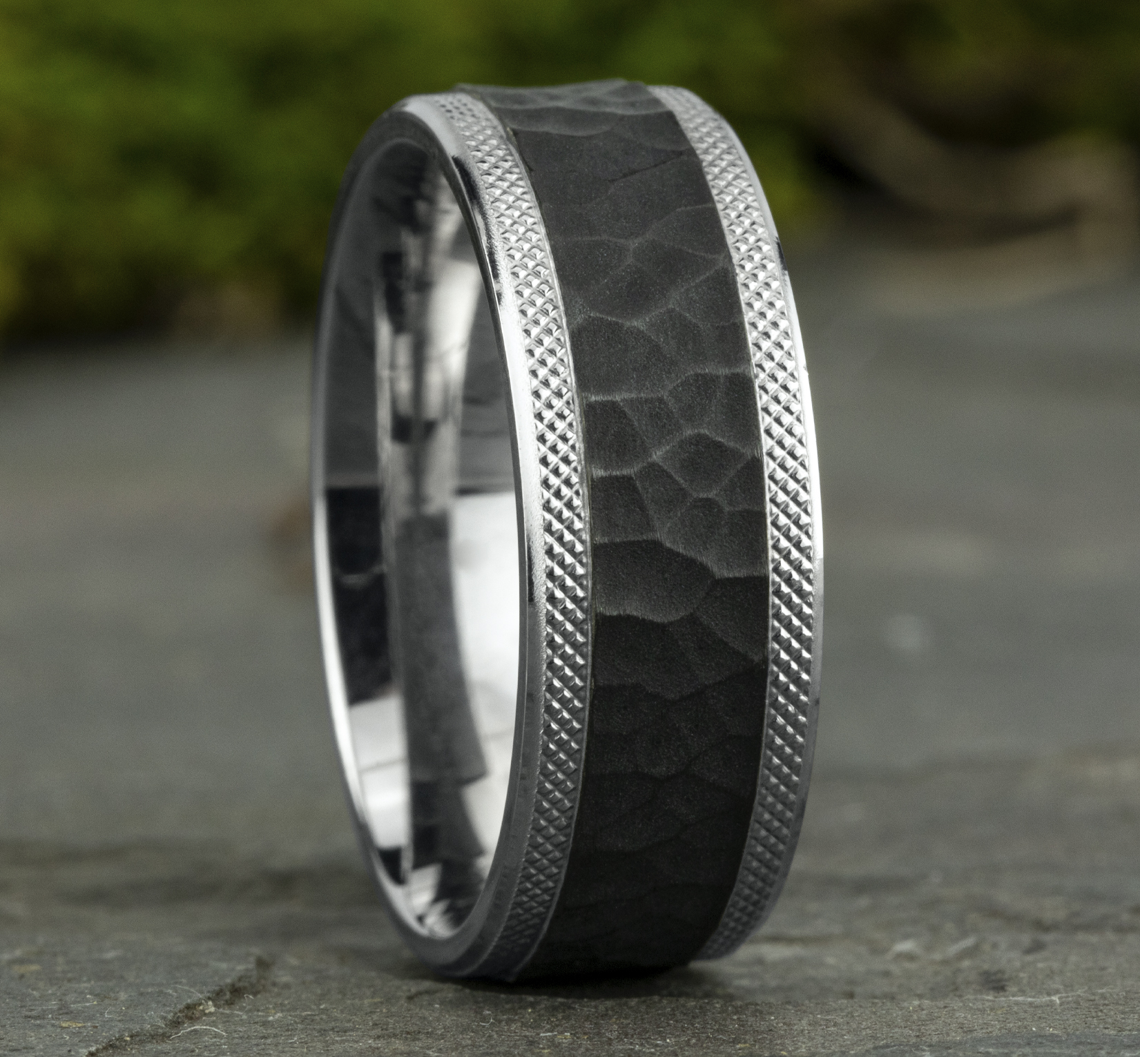 8mm, Comfort fit 14K White Gold and Black Titanium Hammered center, knurl detailed edges