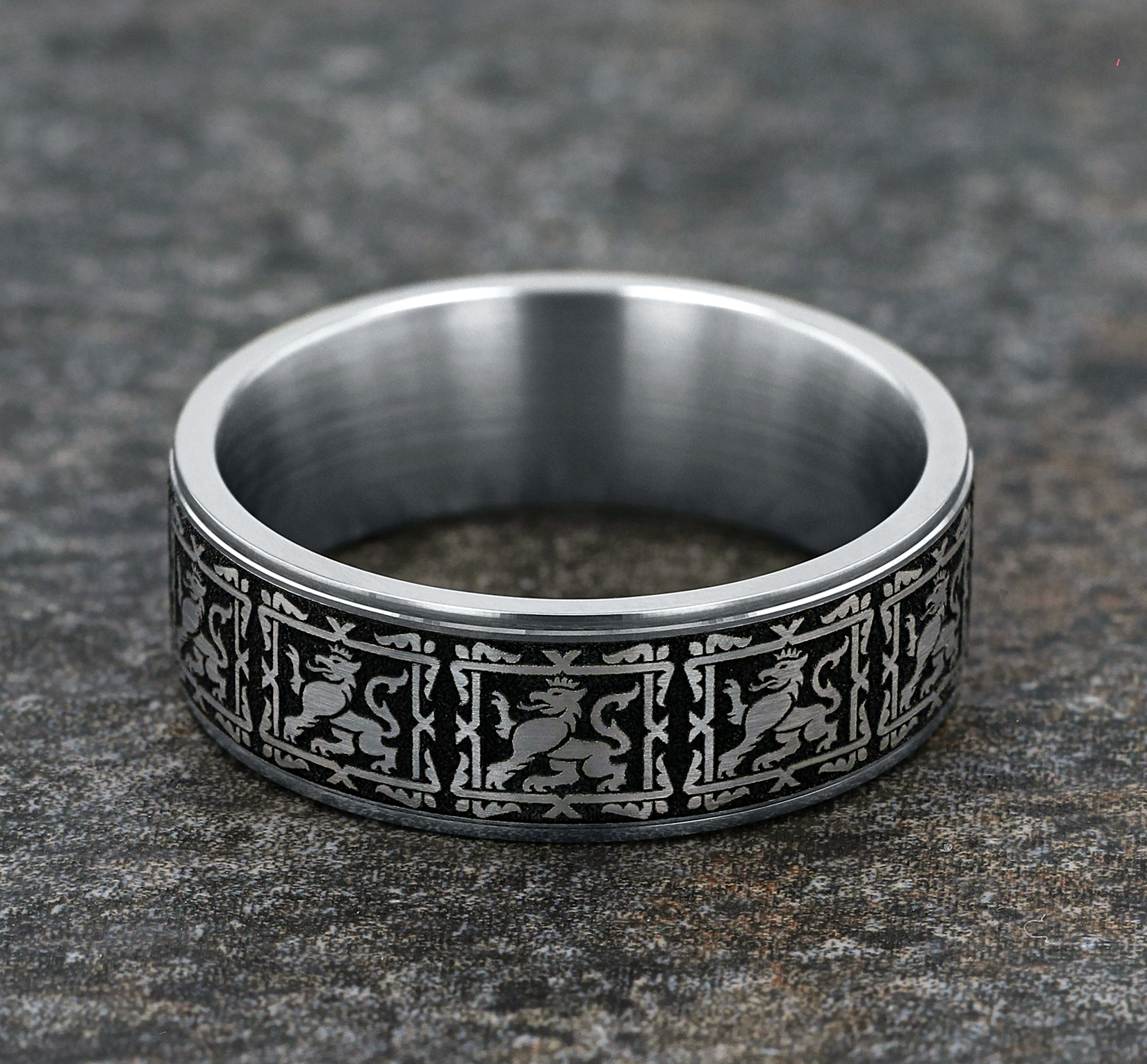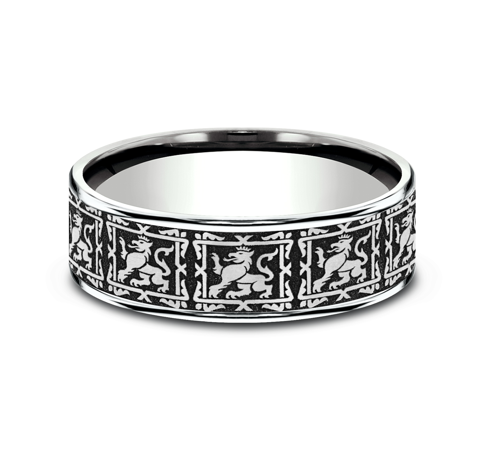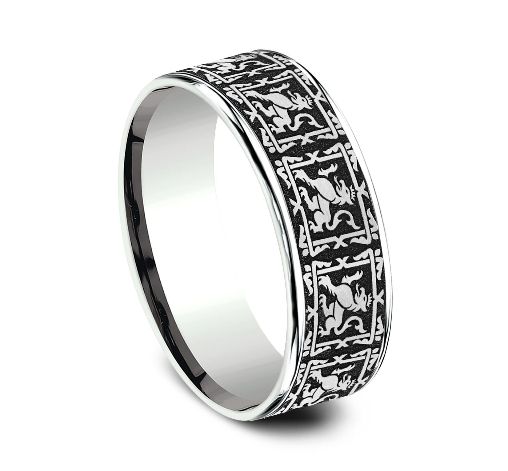 7.5mm, Comfort fit 14K White Gold and Grey/Black Titanium Griffin pattern, thin edges