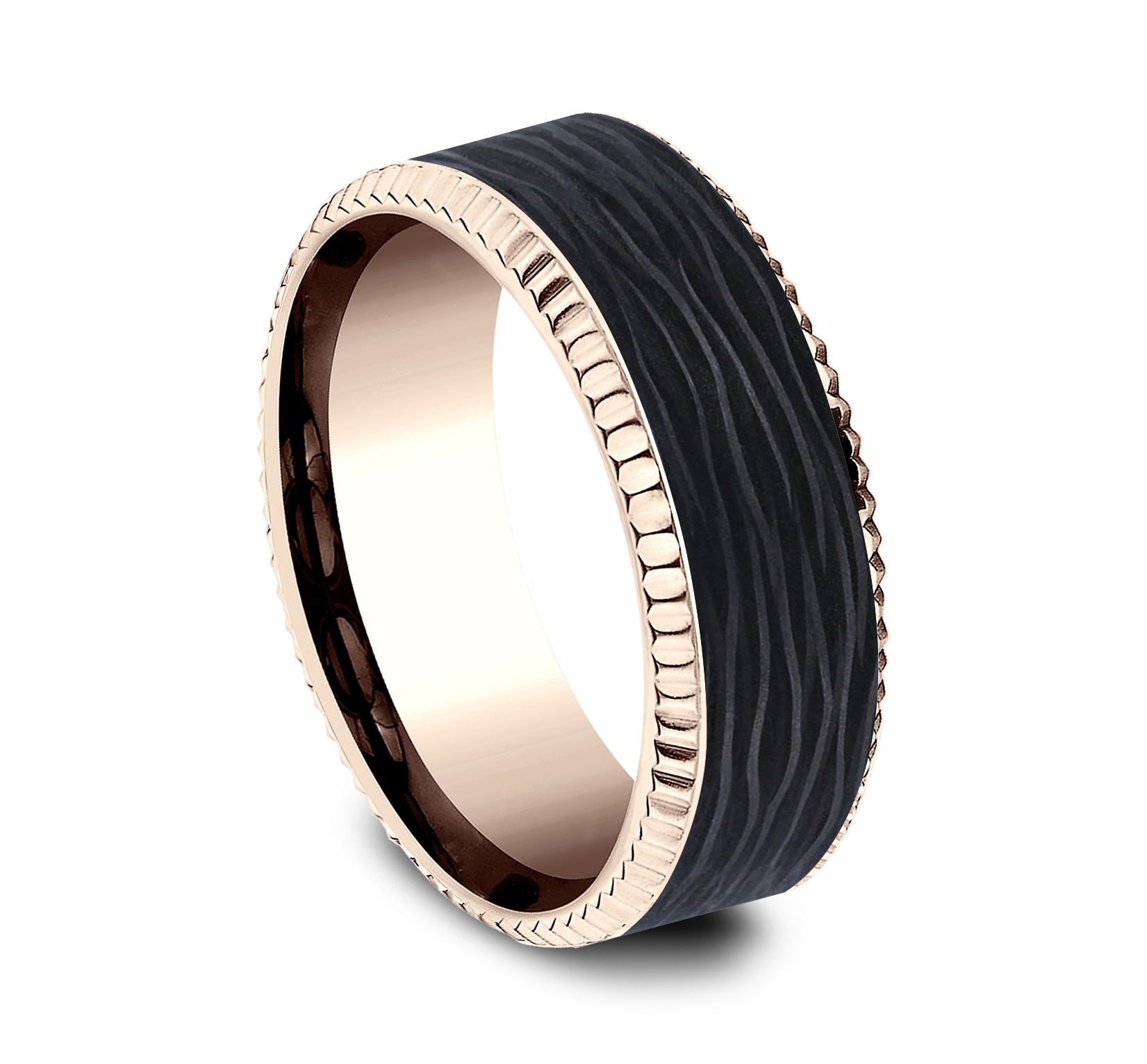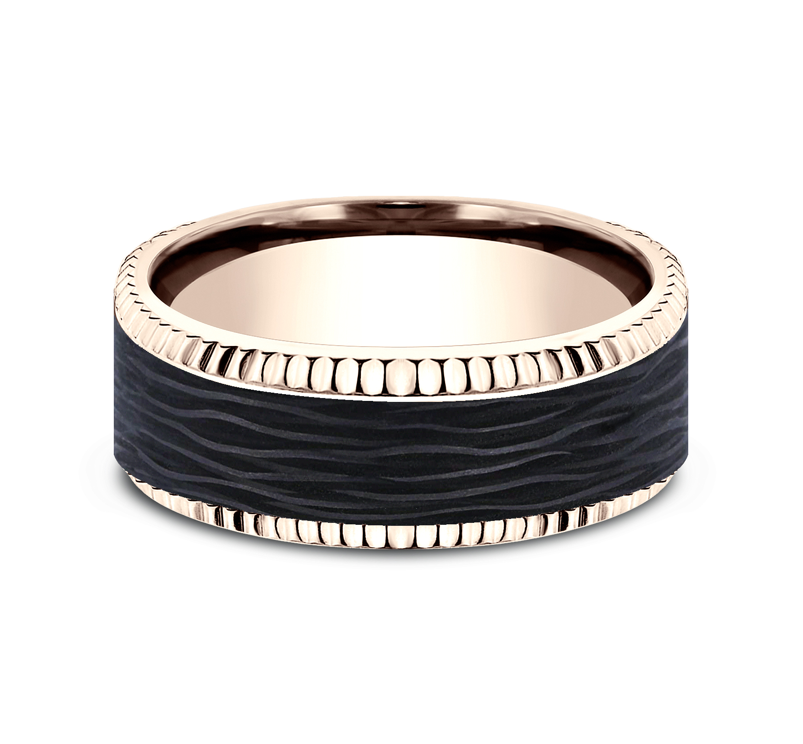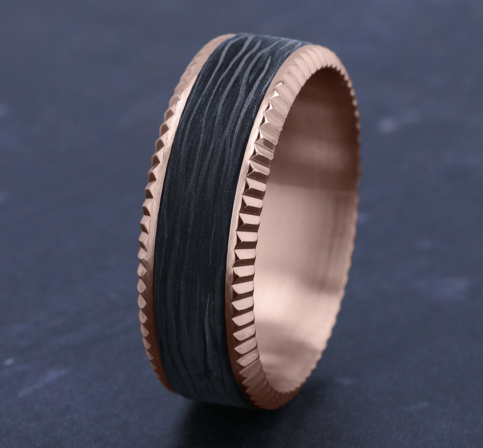 8mm, Comfort fit 14K Rose Gold and Forged Carbon Fiber Forged carbon fiber center, fluted bevel edges