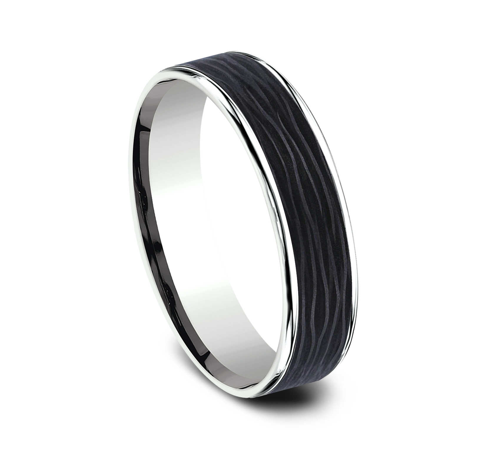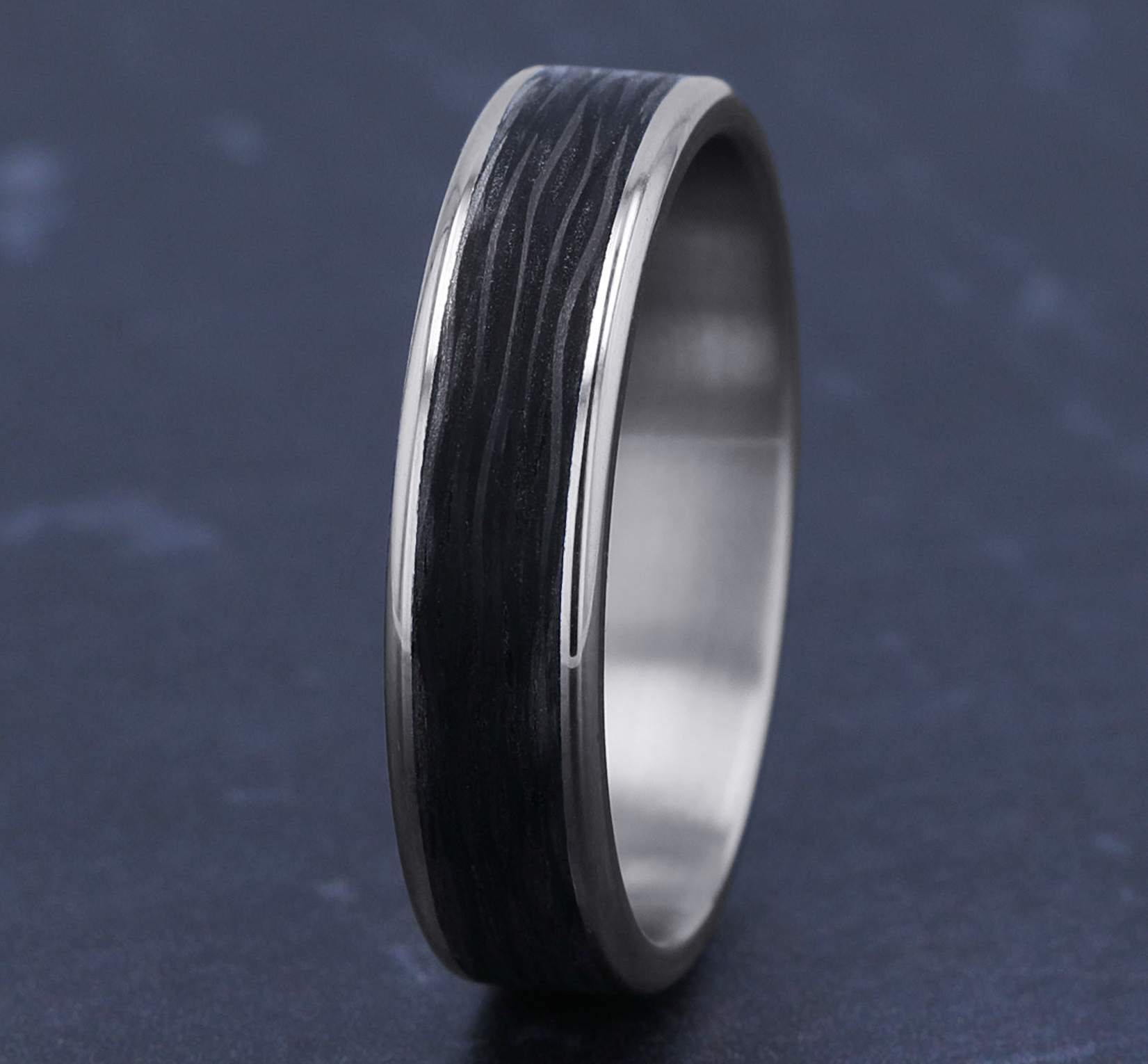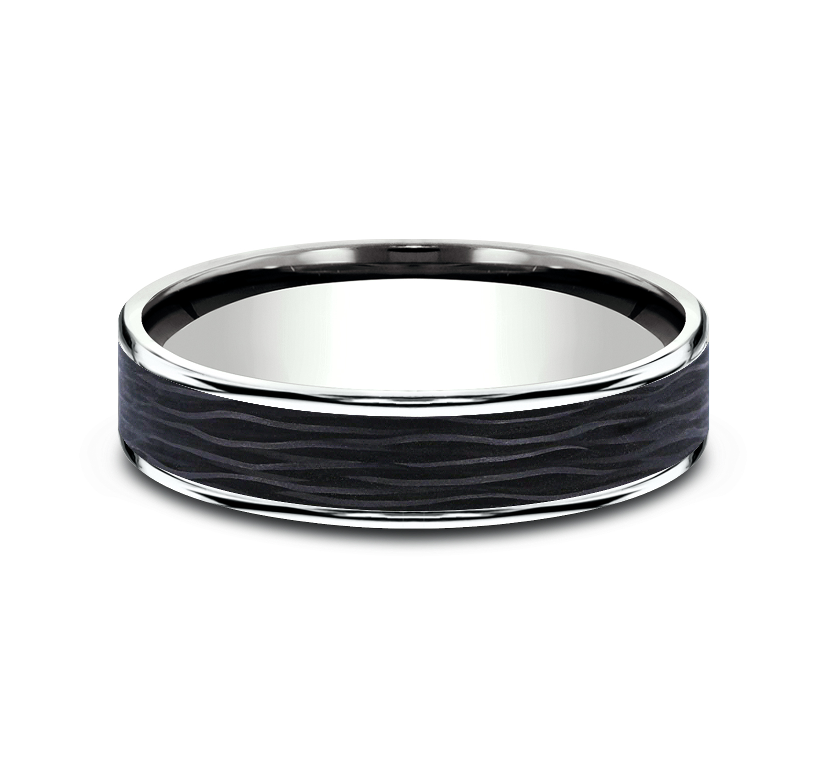 5.5mm, Comfort fit 14K White Gold and Forged Carbon Fiber Forged carbon fiber center, thin edges
