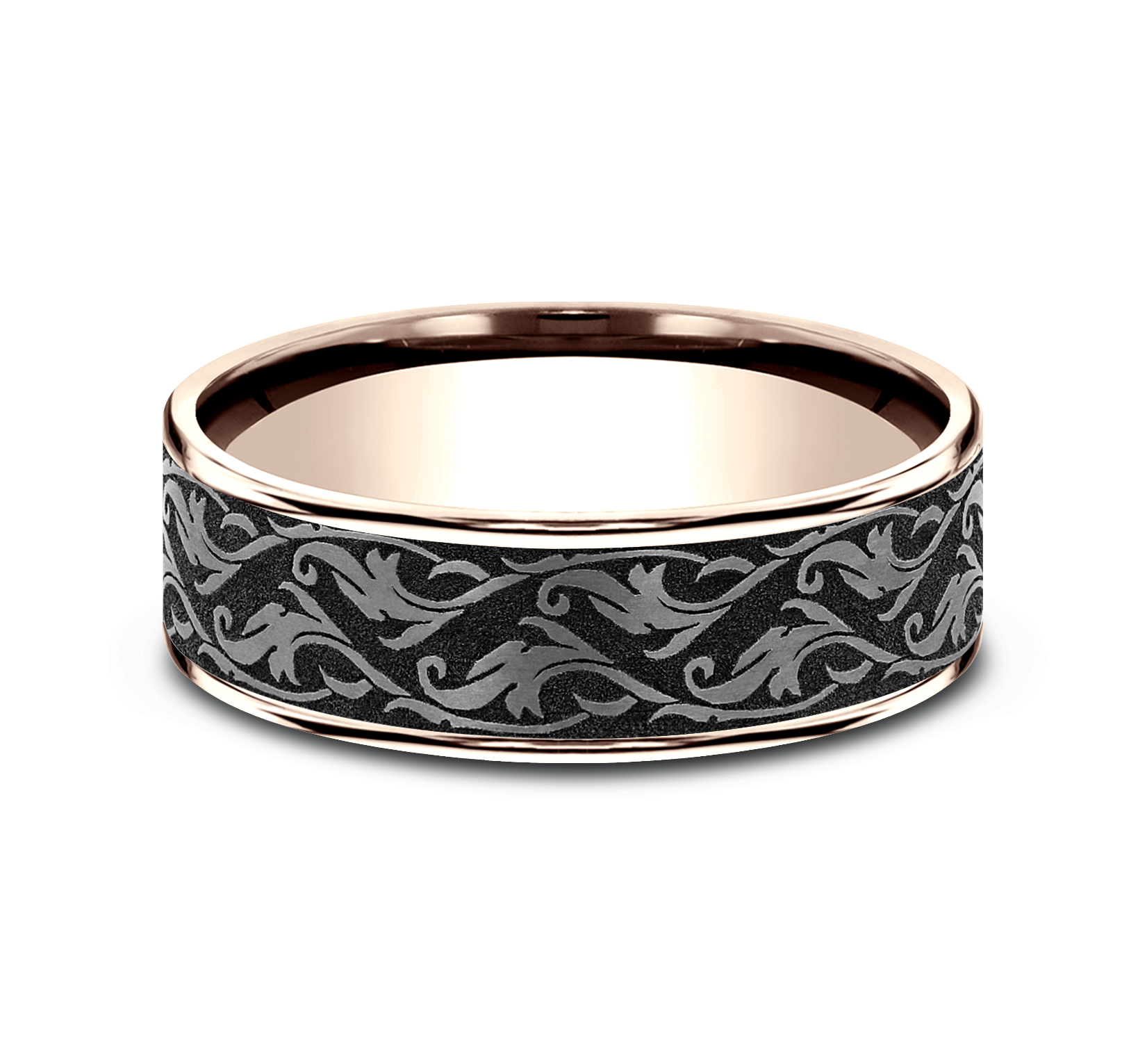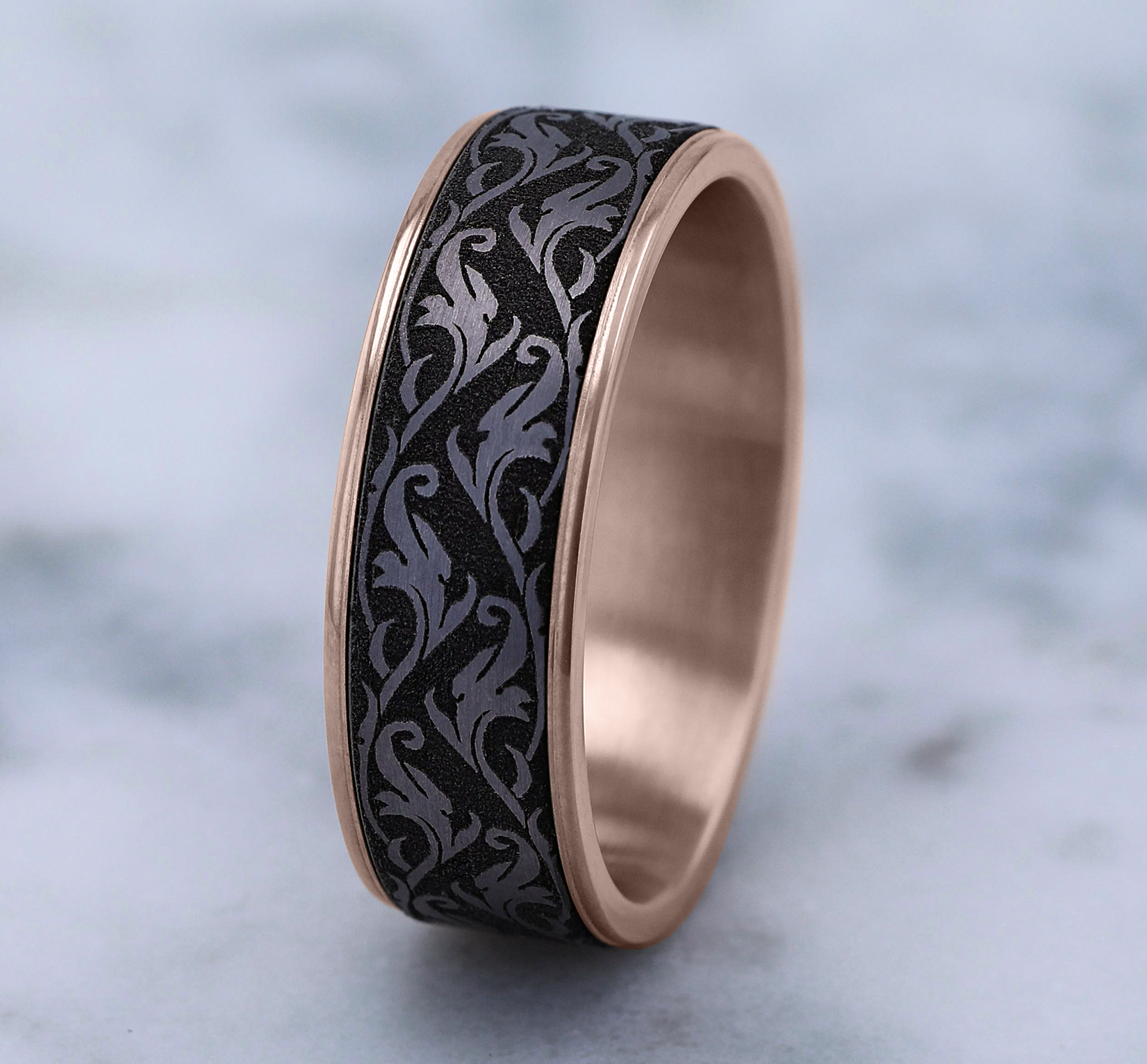 7.5mm, Comfort fit 14K Rose Gold and Grey Tantalum Vine script pattern, thin edges