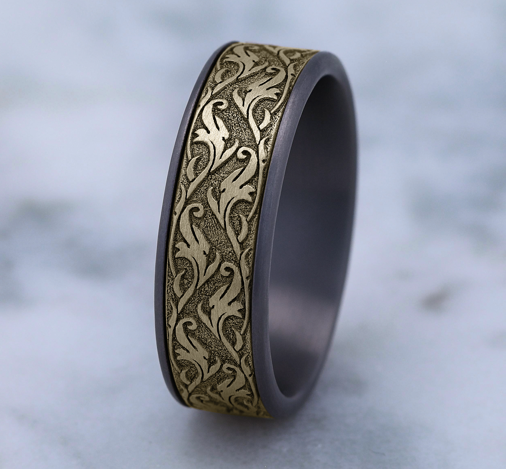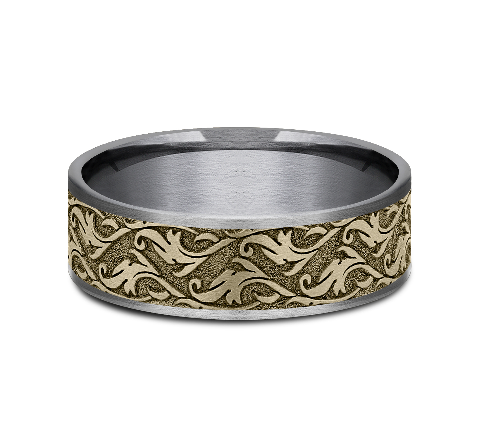 7.5mm, Comfort fit Grey Tantalum and 14K Yellow Gold Vine script pattern, thin edges