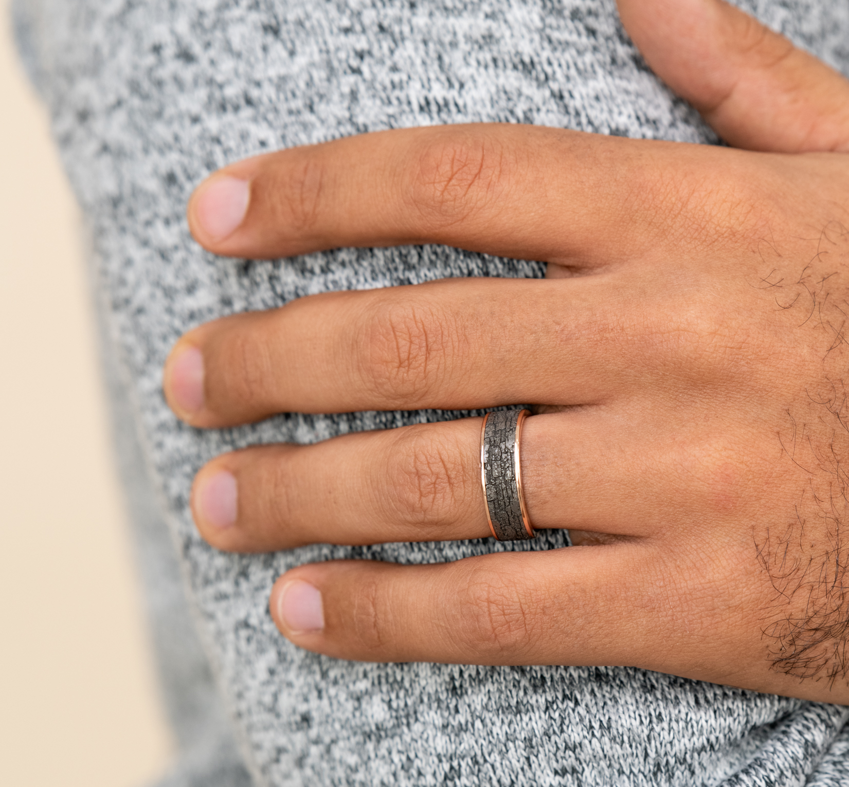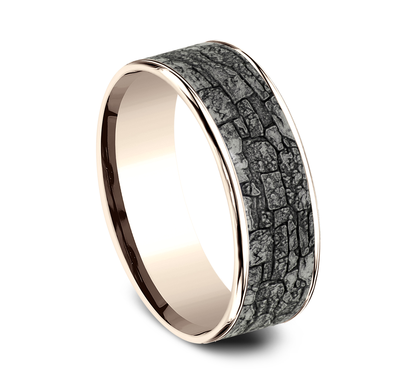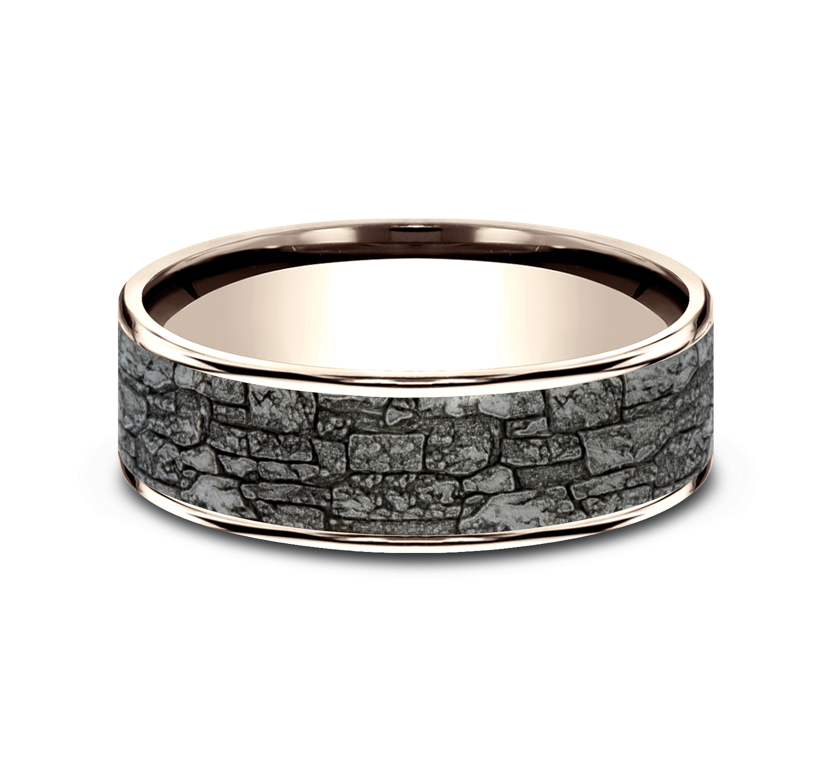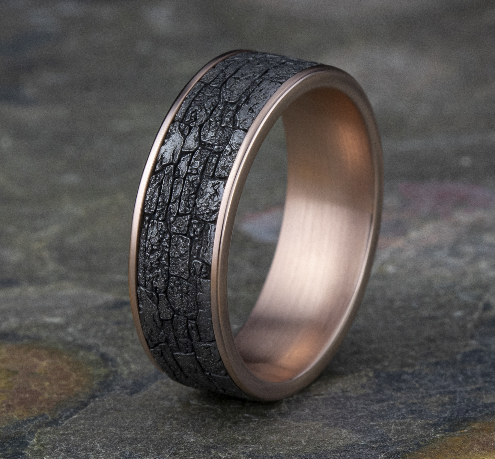 7.5mm, Comfort fit 14K Rose Gold and Grey Tantalum Stone wall pattern, thin edges