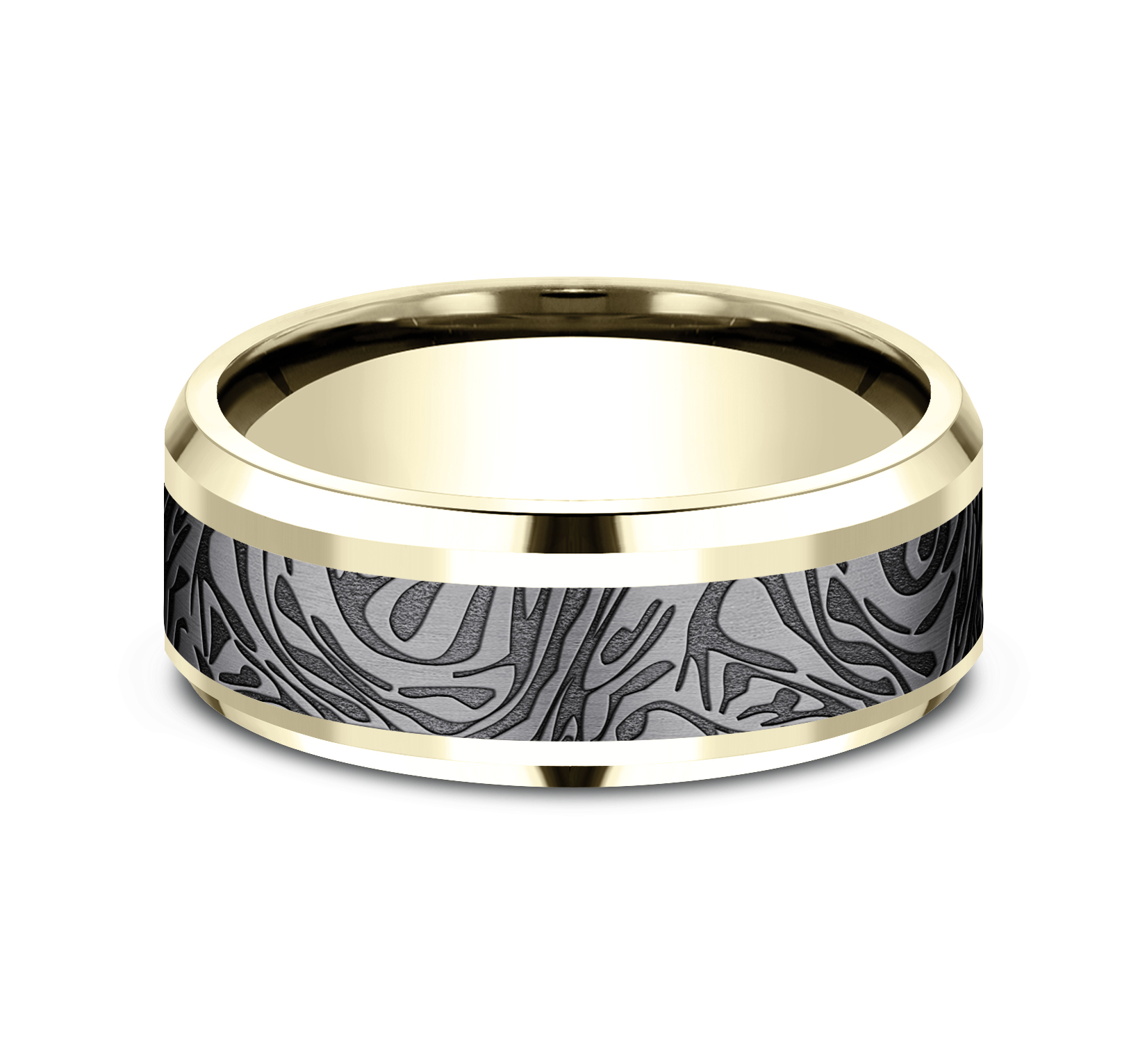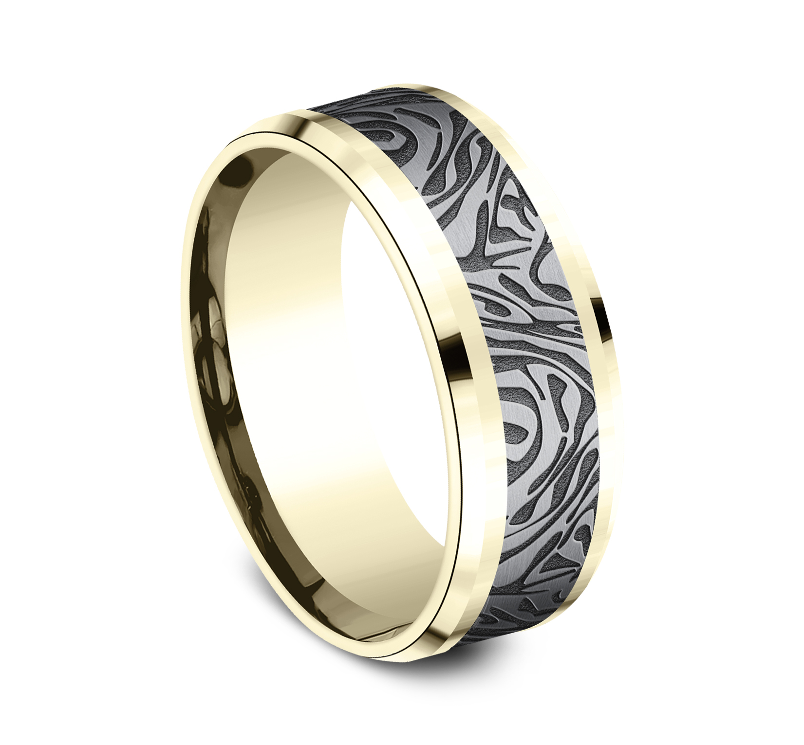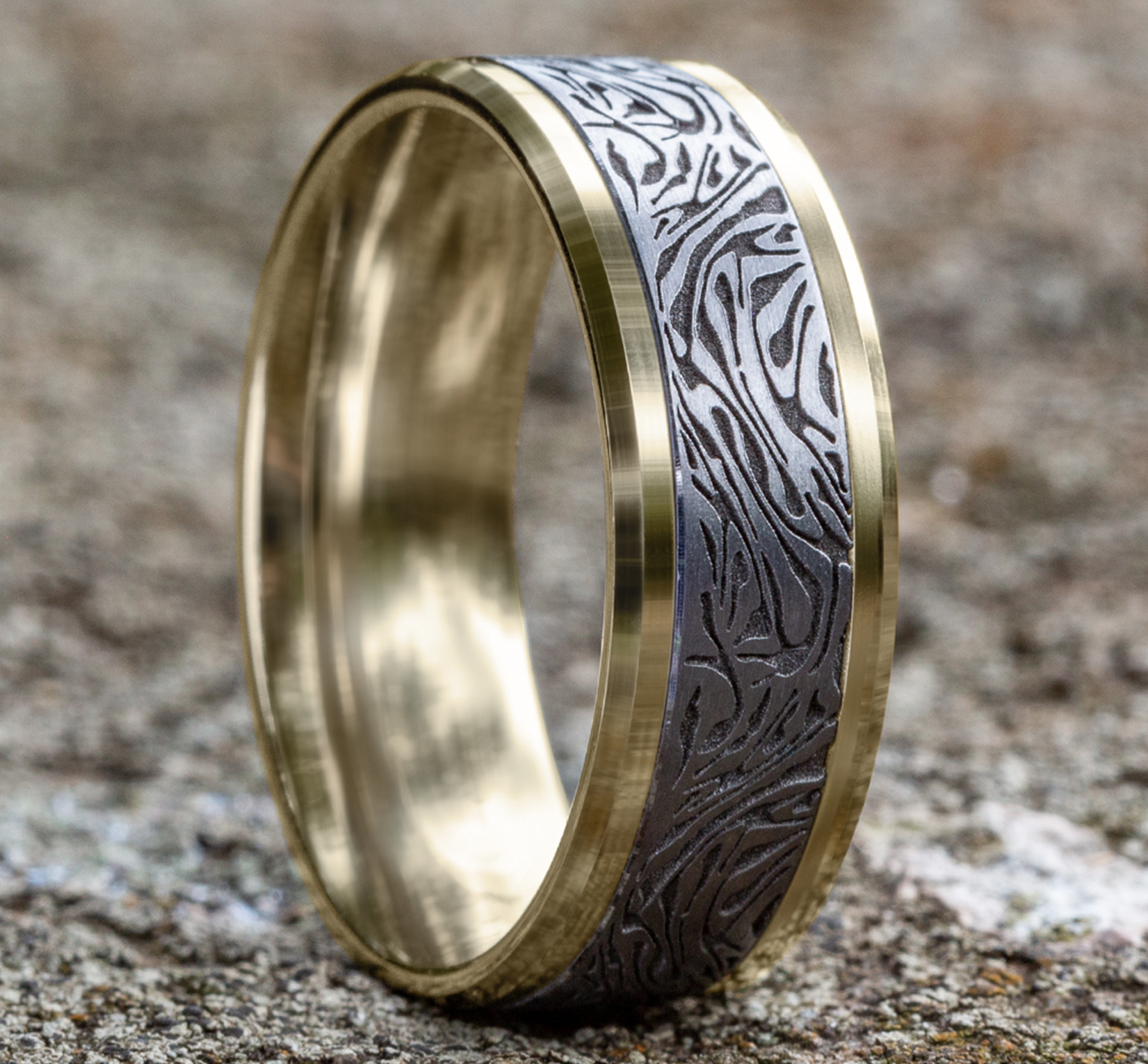8mm, Comfort fit 14K Yellow Gold and Grey Tantalum Faux mokume pattern, polished slightly beveled edges