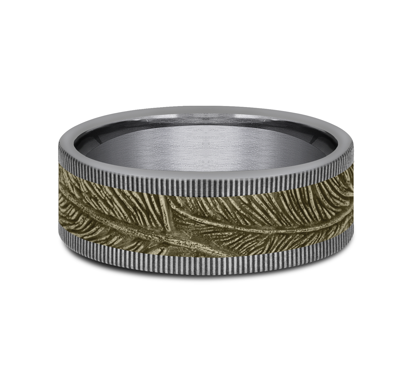 8mm, Comfort fit Grey Tantalum and 14K Yellow Gold Feather patterned center with milgrain detail