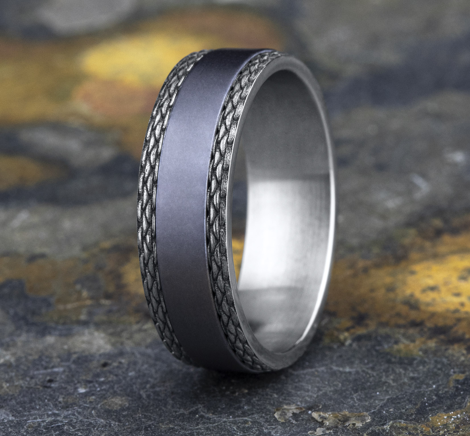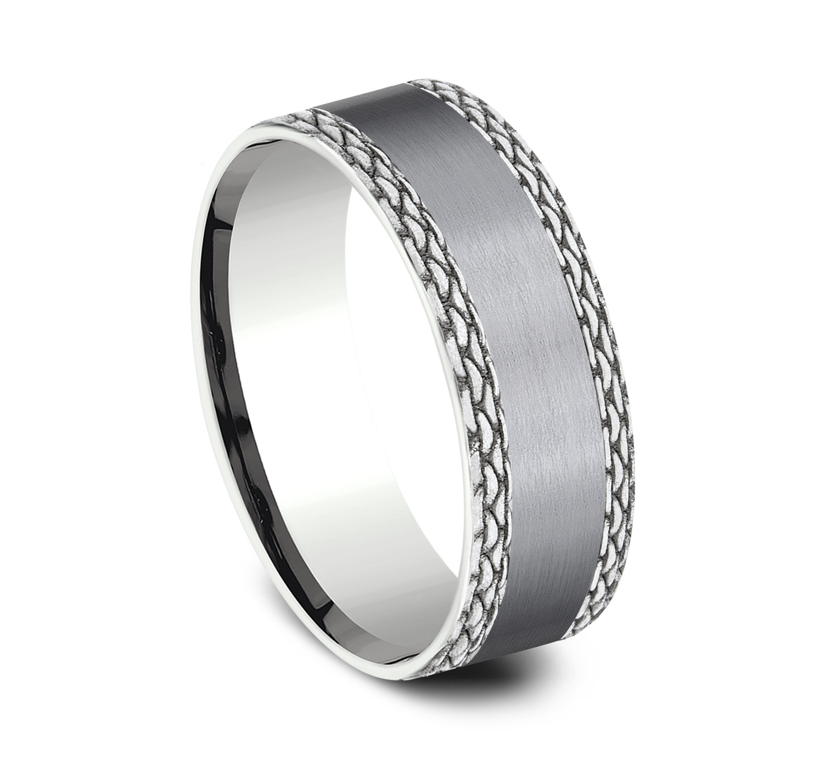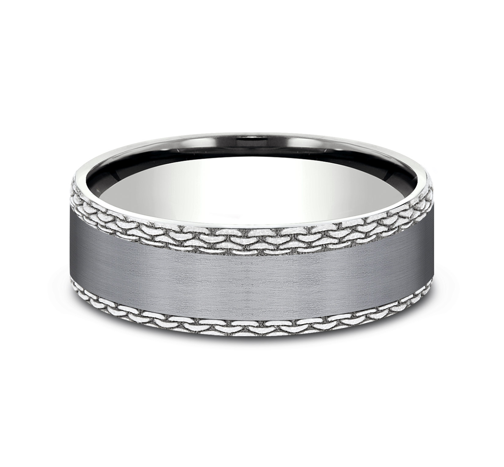 7mm, Comfort fit Grey Tantalum and 14K White Gold Satin center, chain link patterned edges