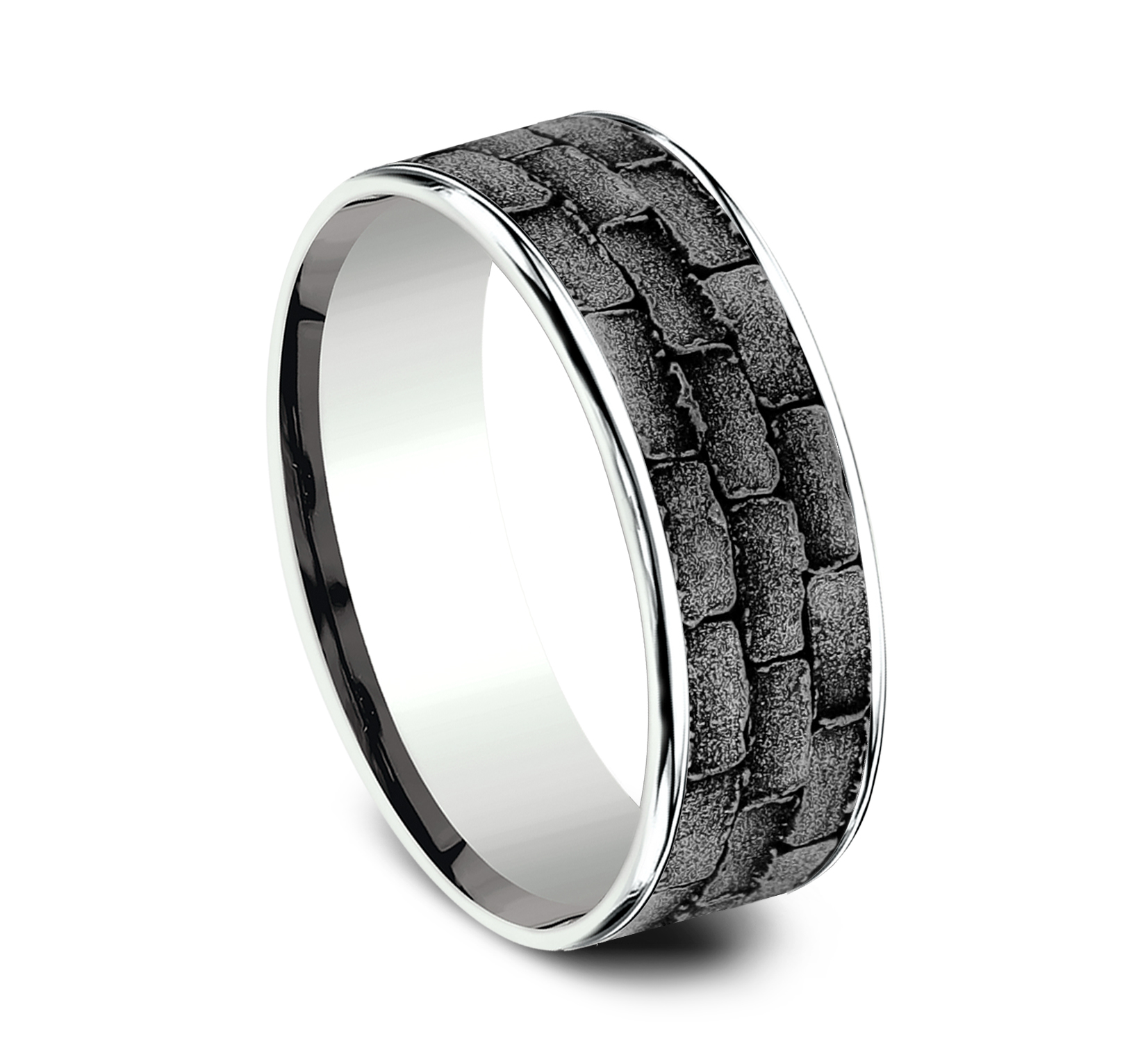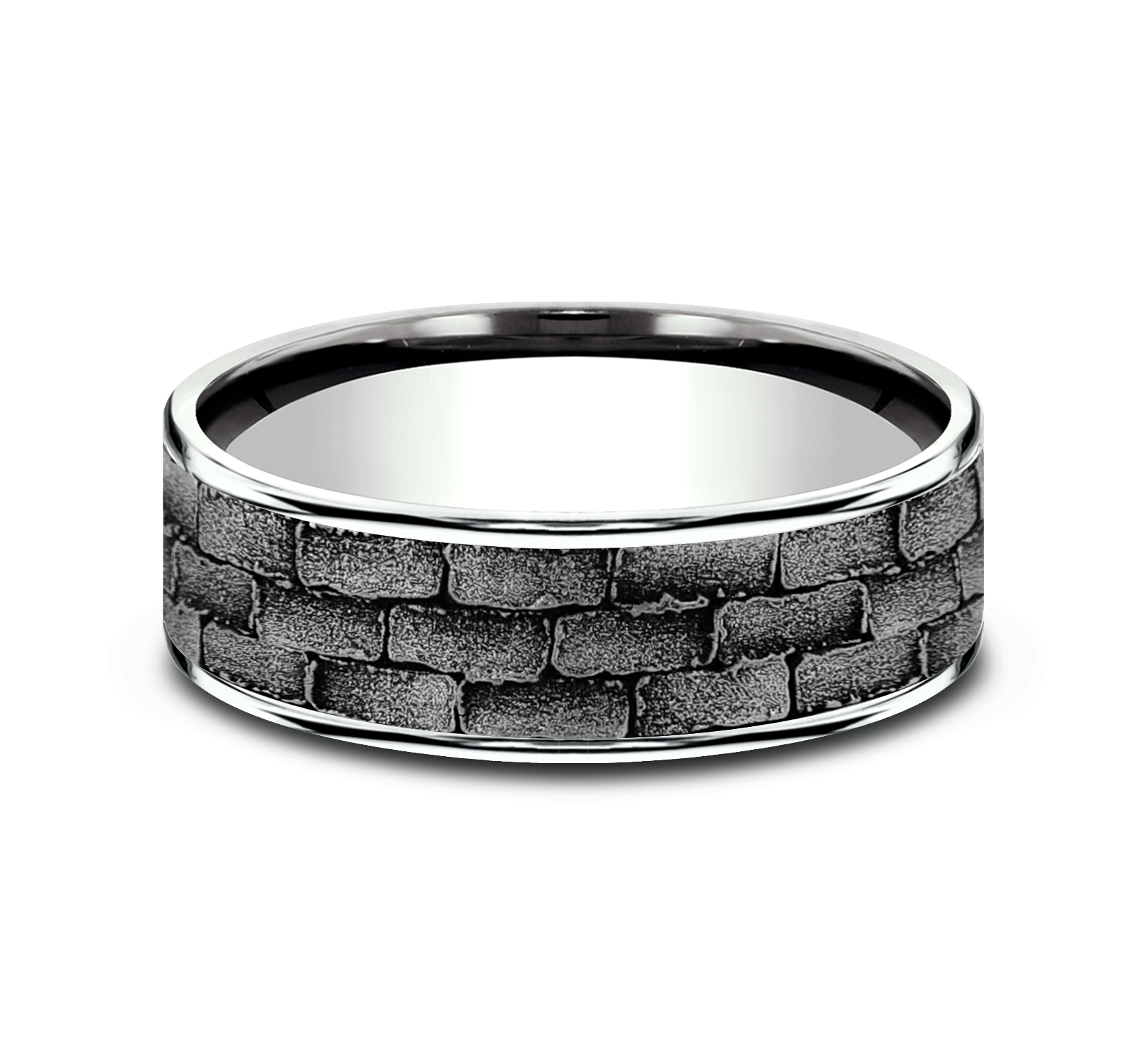 7.5mm, Comfort fit 14K White Gold and Grey Tantalum Brick pattern, thin edges