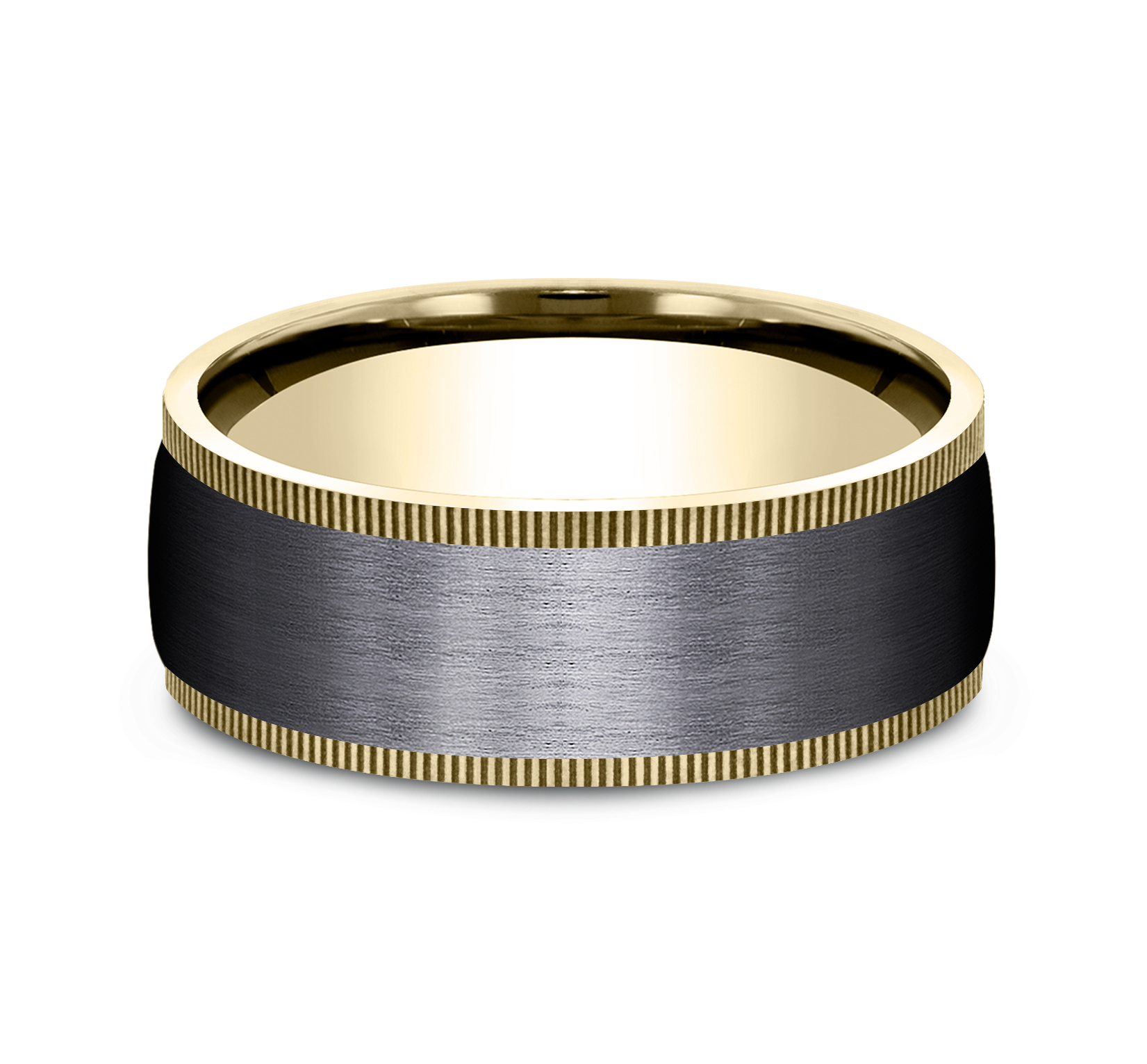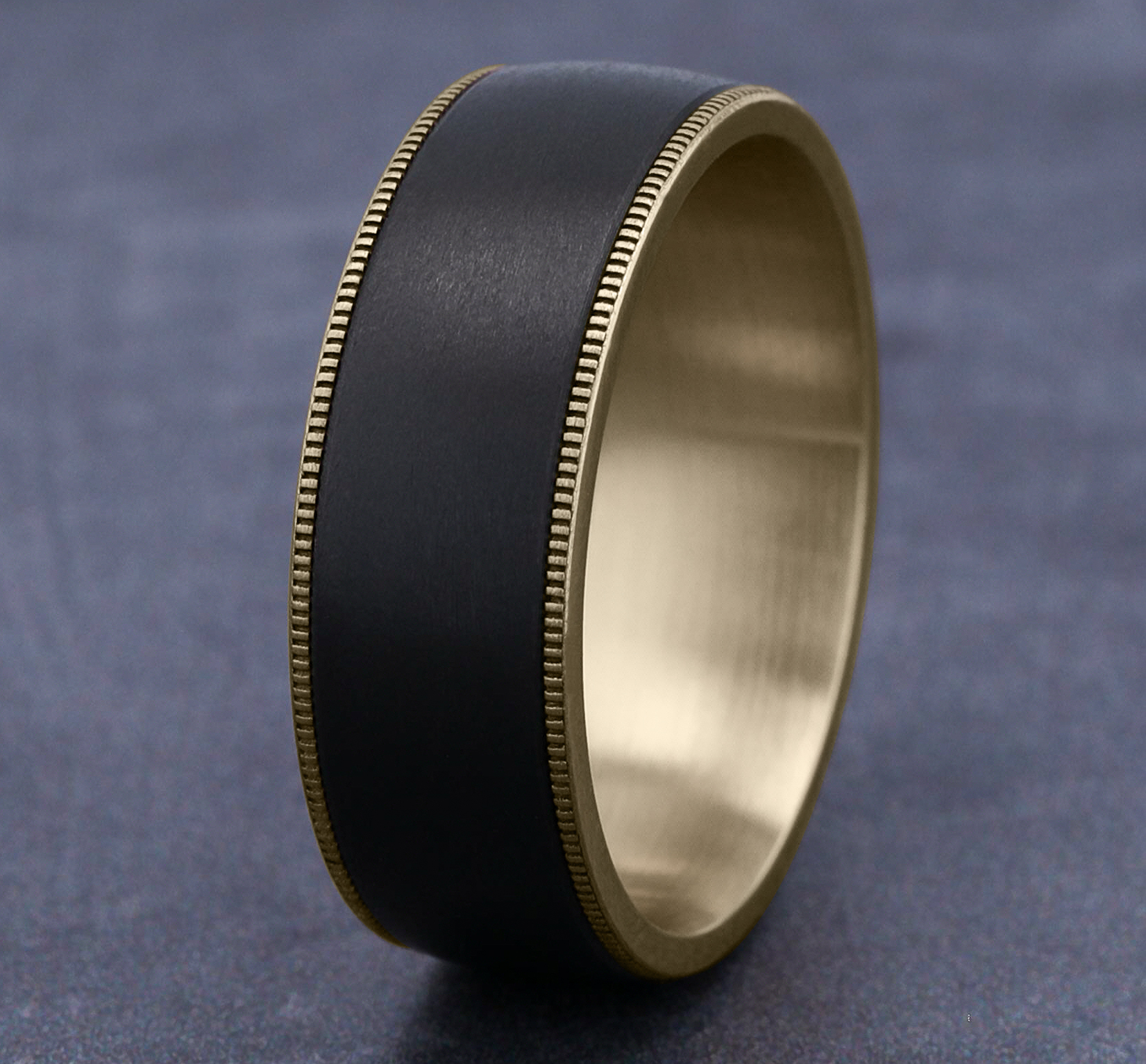8mm, Comfort fit 14K Yellow Gold and Black Titanium Satin center, thin coin edges
