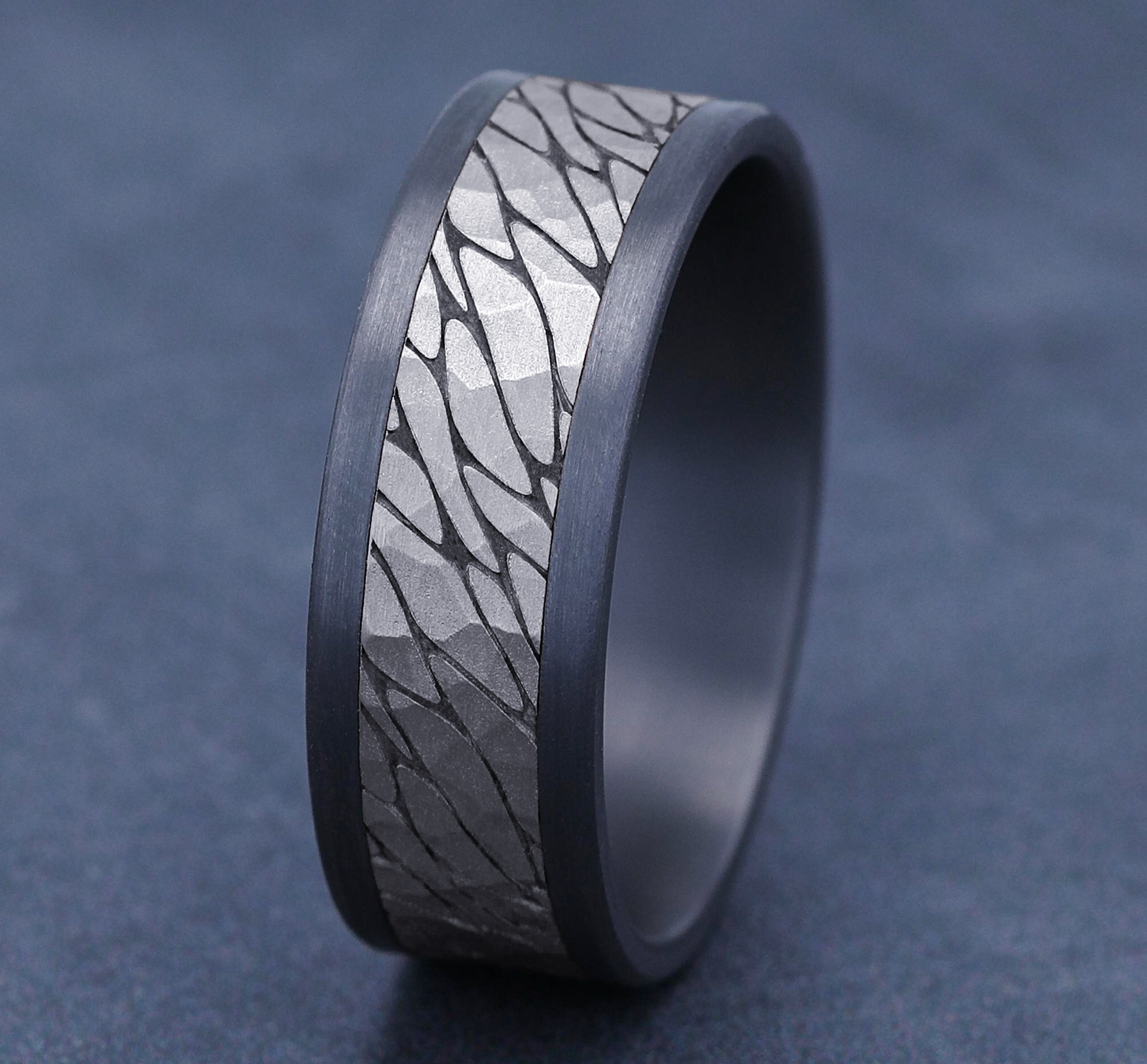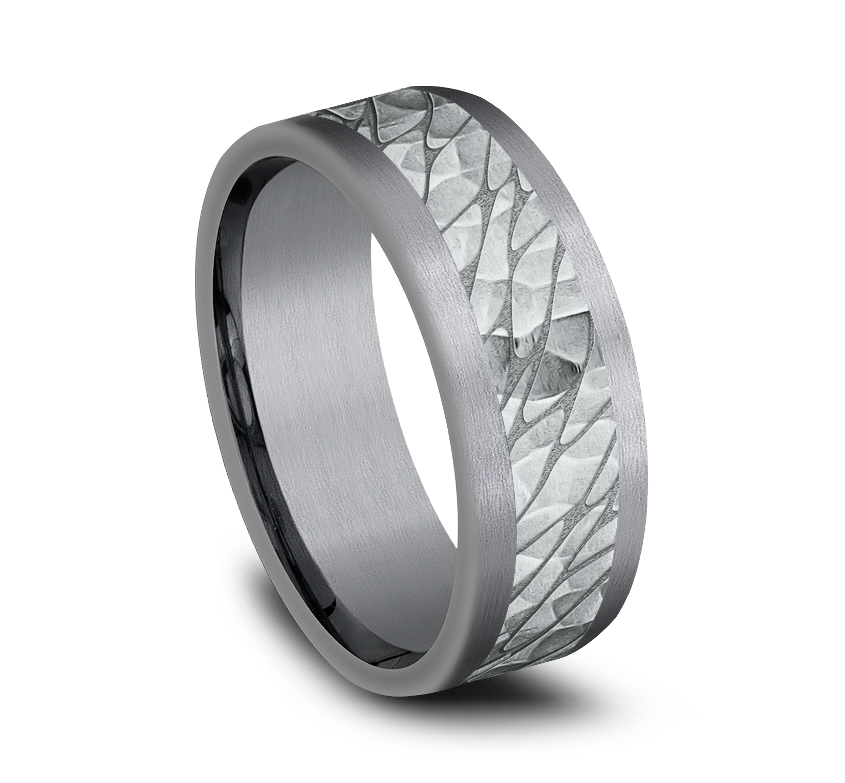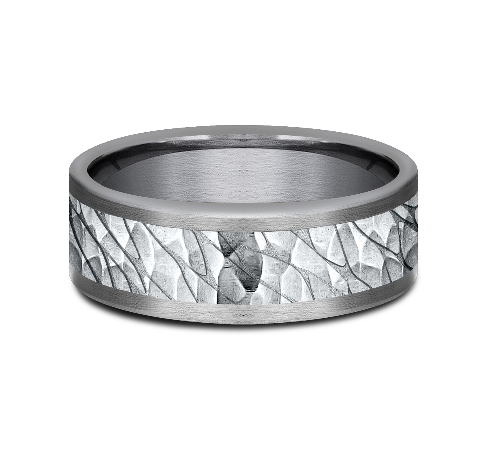 8mm, Comfort fit Grey Tantalum and 14K White Gold Pebble pattern with hammered finish, straight edges