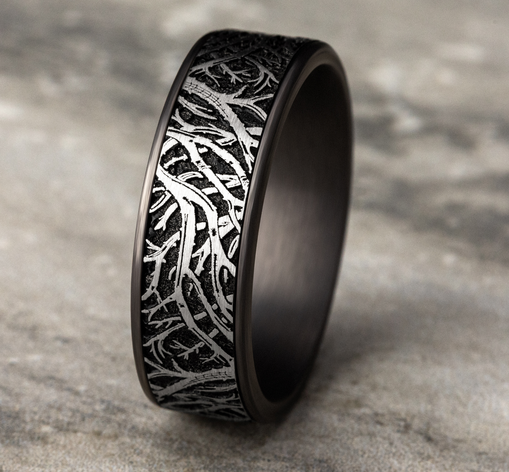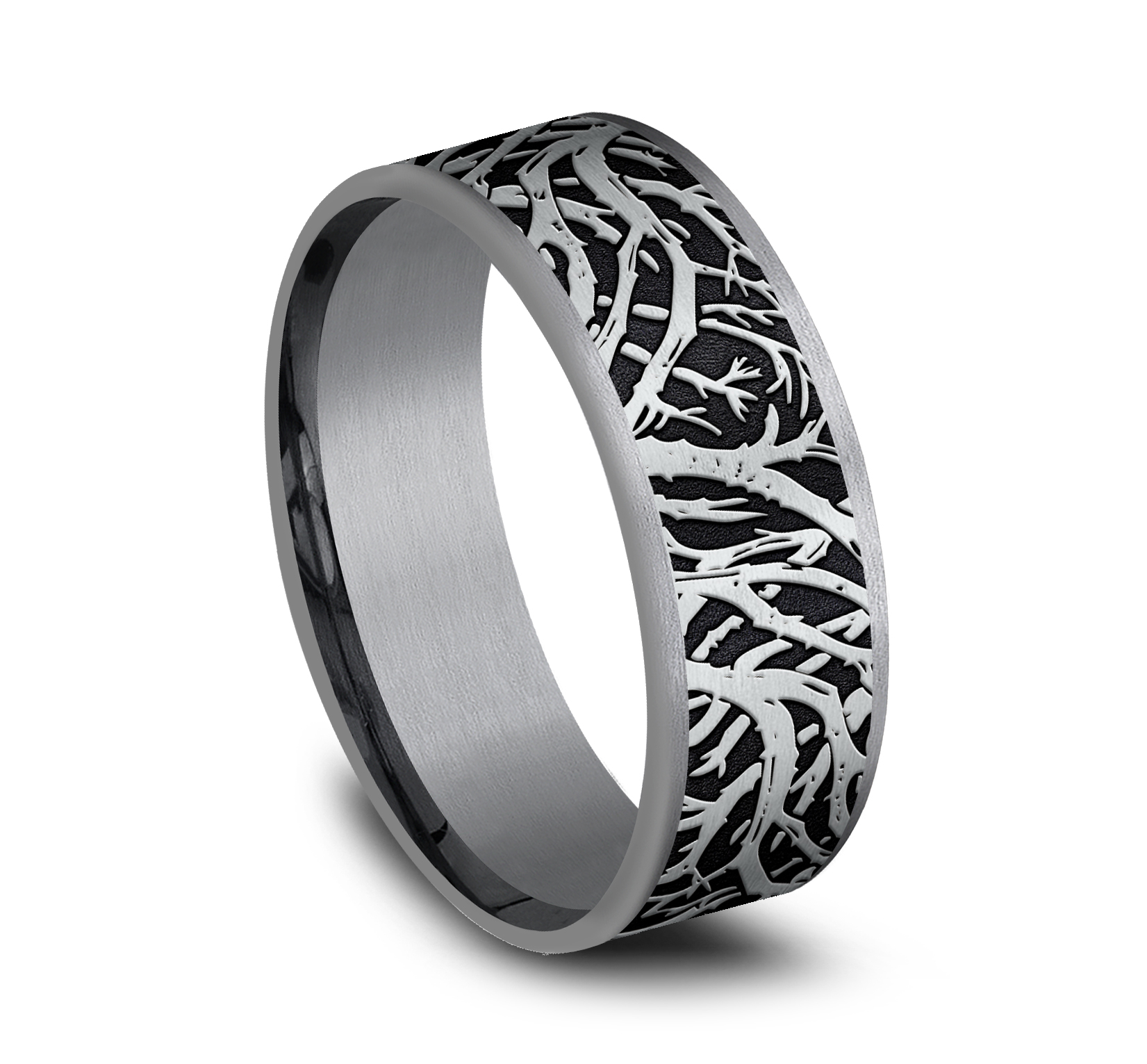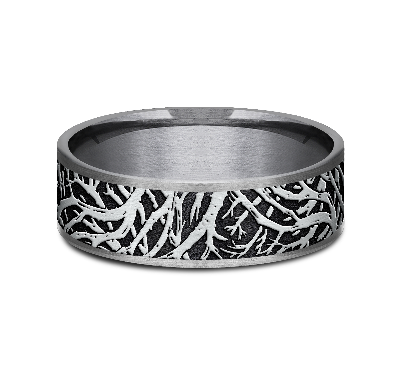 7.5mm, Comfort fit Grey Tantalum and 14K White Gold Forest branch pattern, thin edges