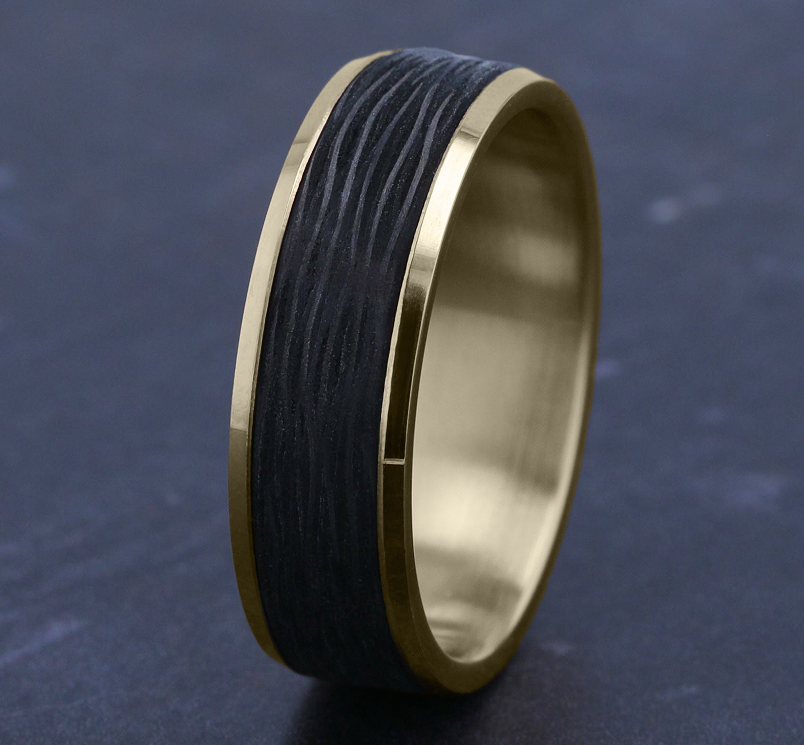 7mm, Comfort fit 14K Yellow Gold and Forged Carbon Fiber Forged carbon fiber center, bevel edges