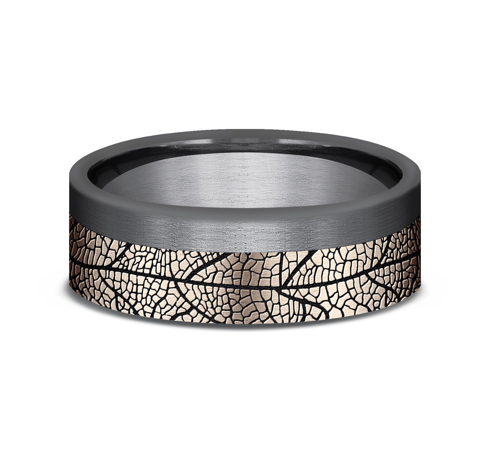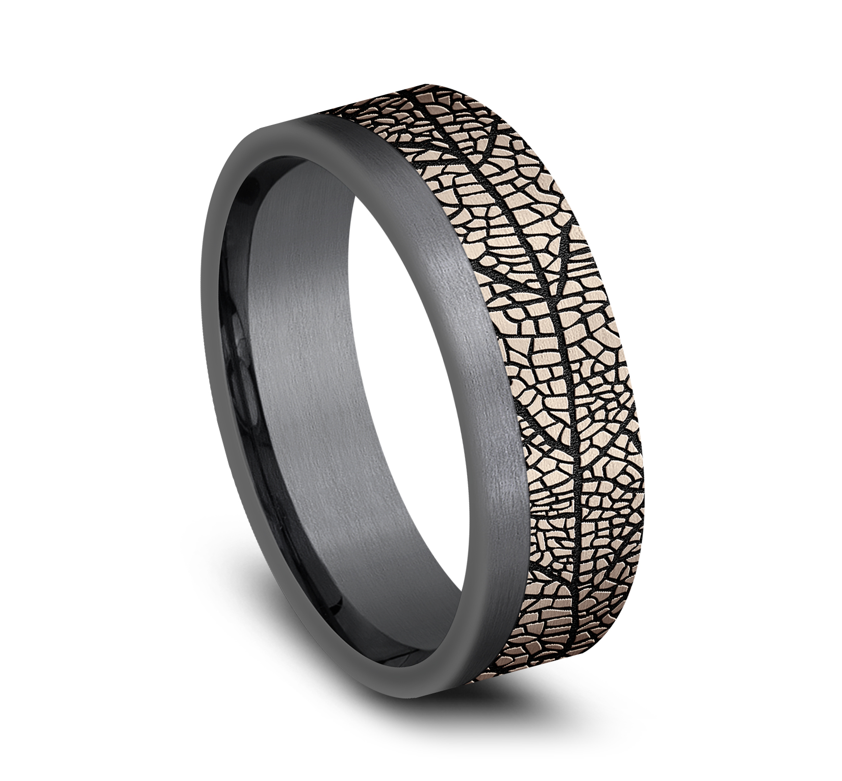 7mm, Comfort fit 14K Rose Gold and Darkened Tantalum Leaf pattern