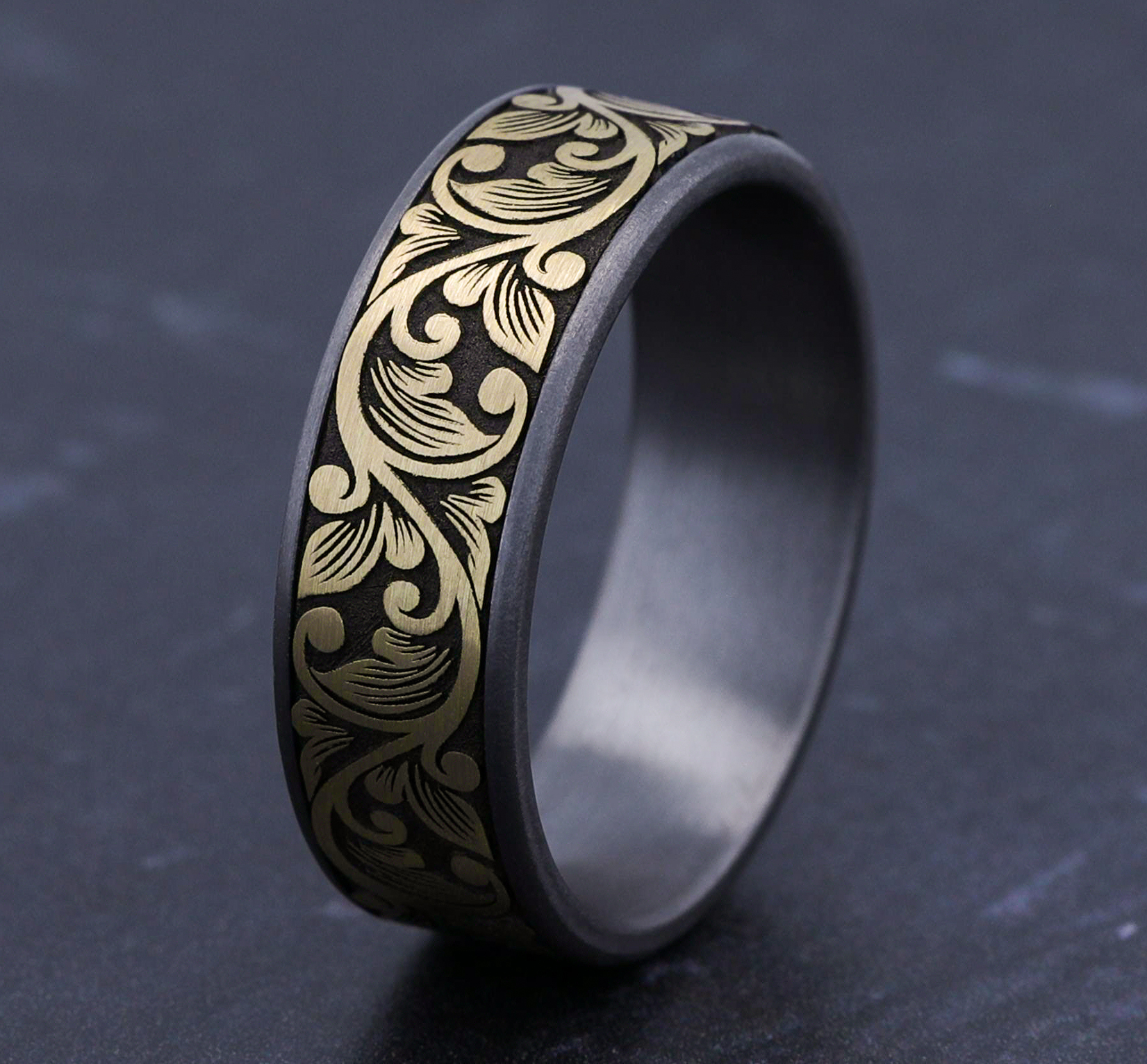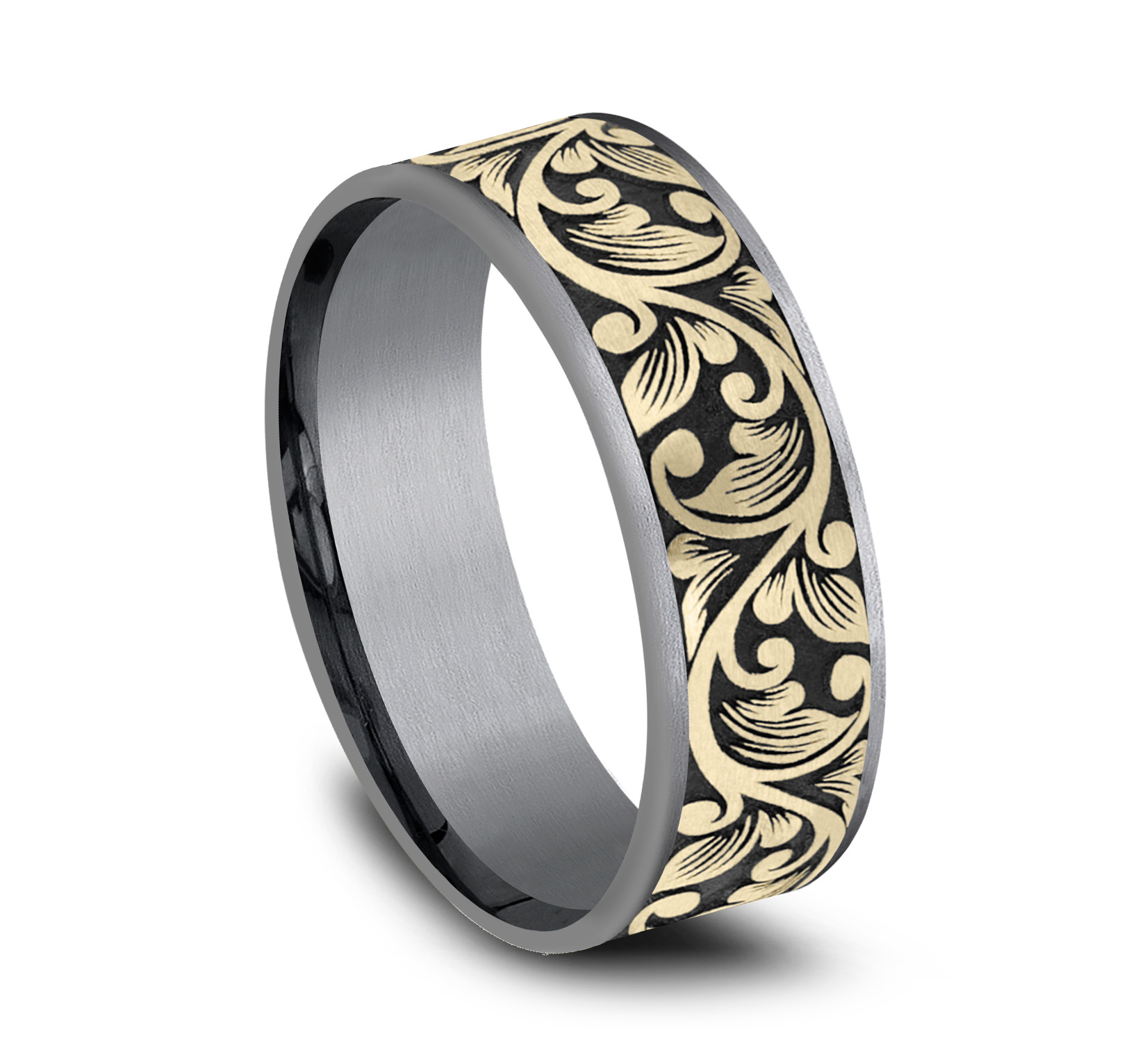 7.5mm, Comfort fit Grey Tantalum and 14K Yellow Gold Roman script design, thin edges