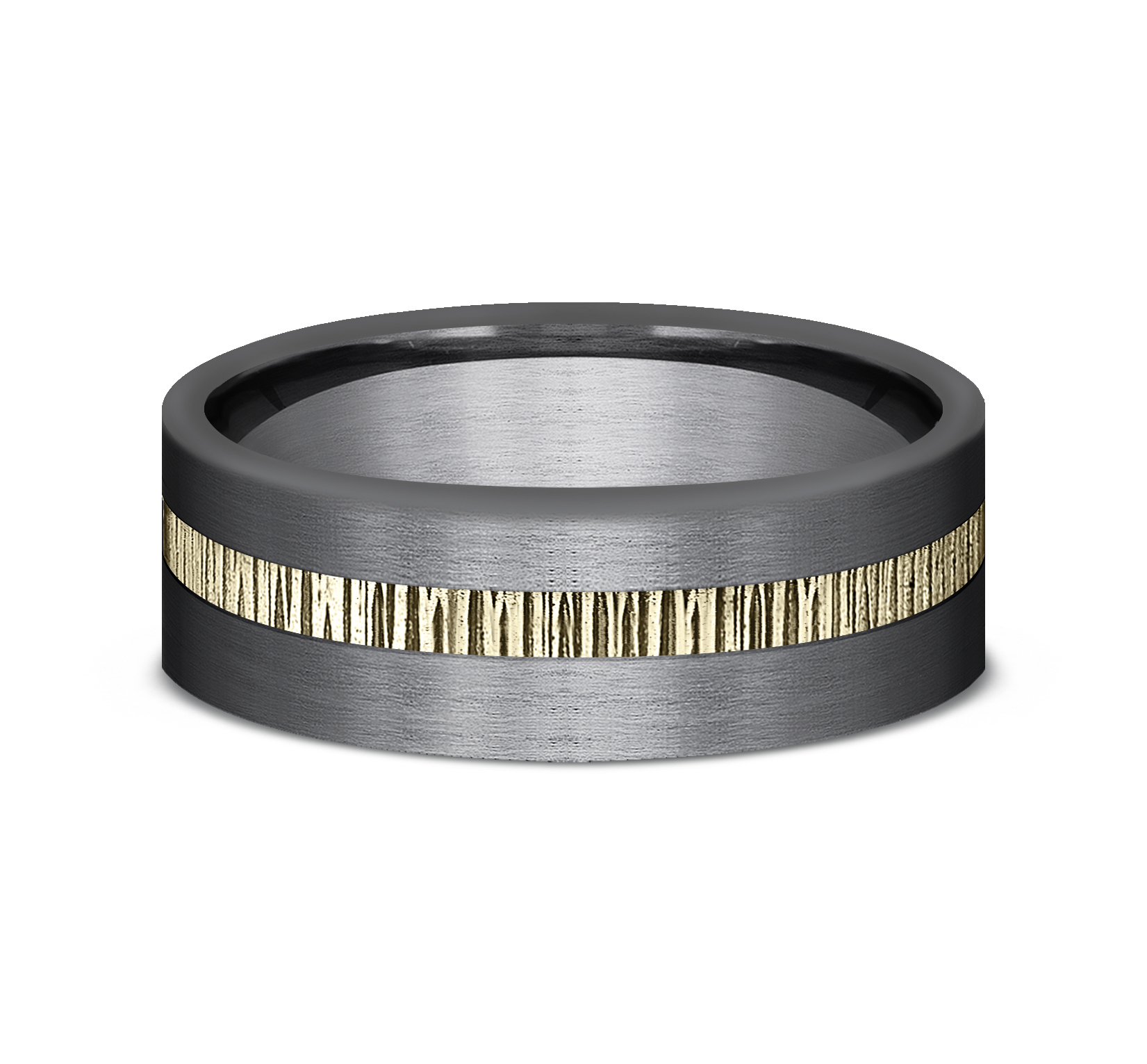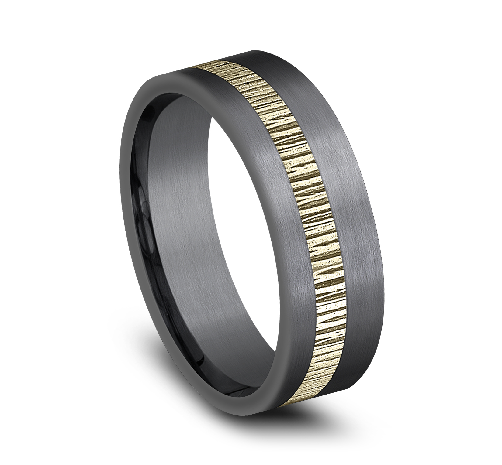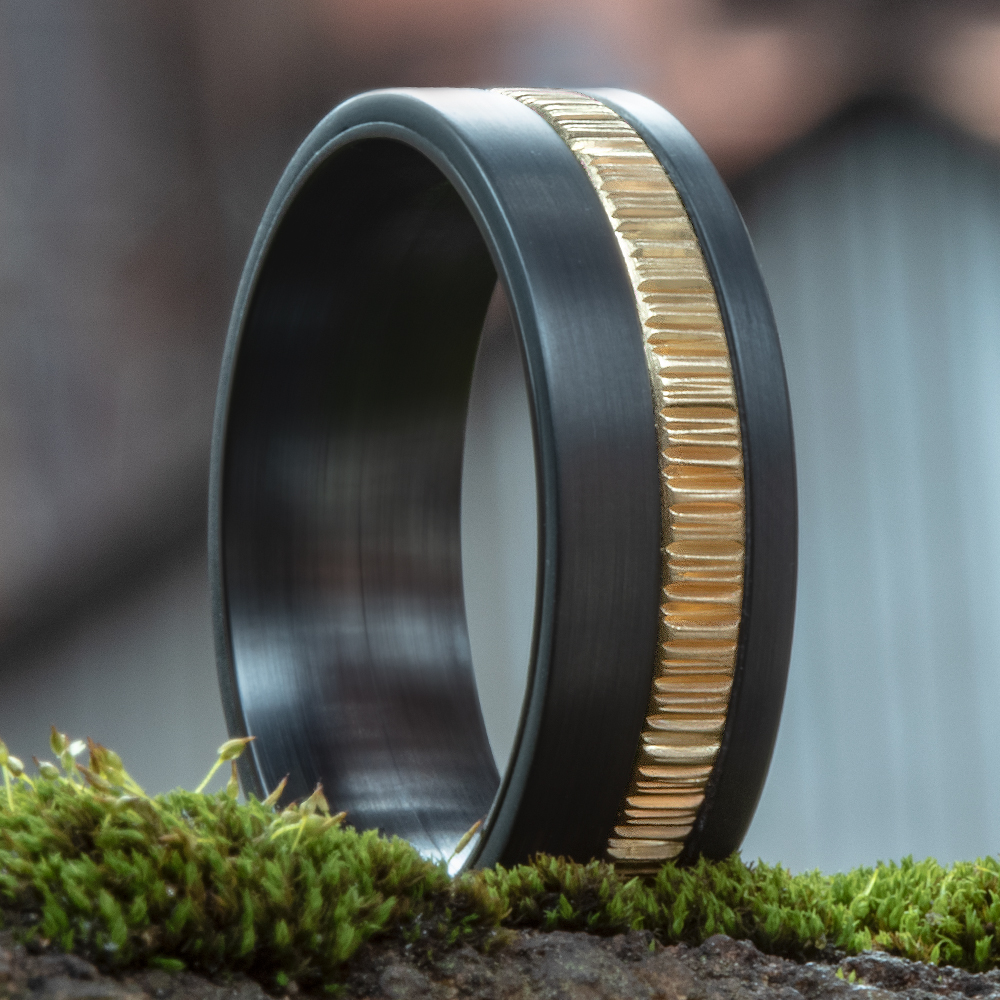 7mm, Comfort fit Darkened Tantalum and 14K Yellow Gold Textured offset stripe