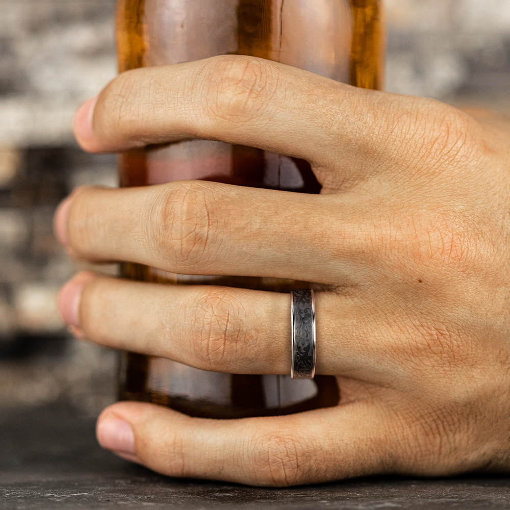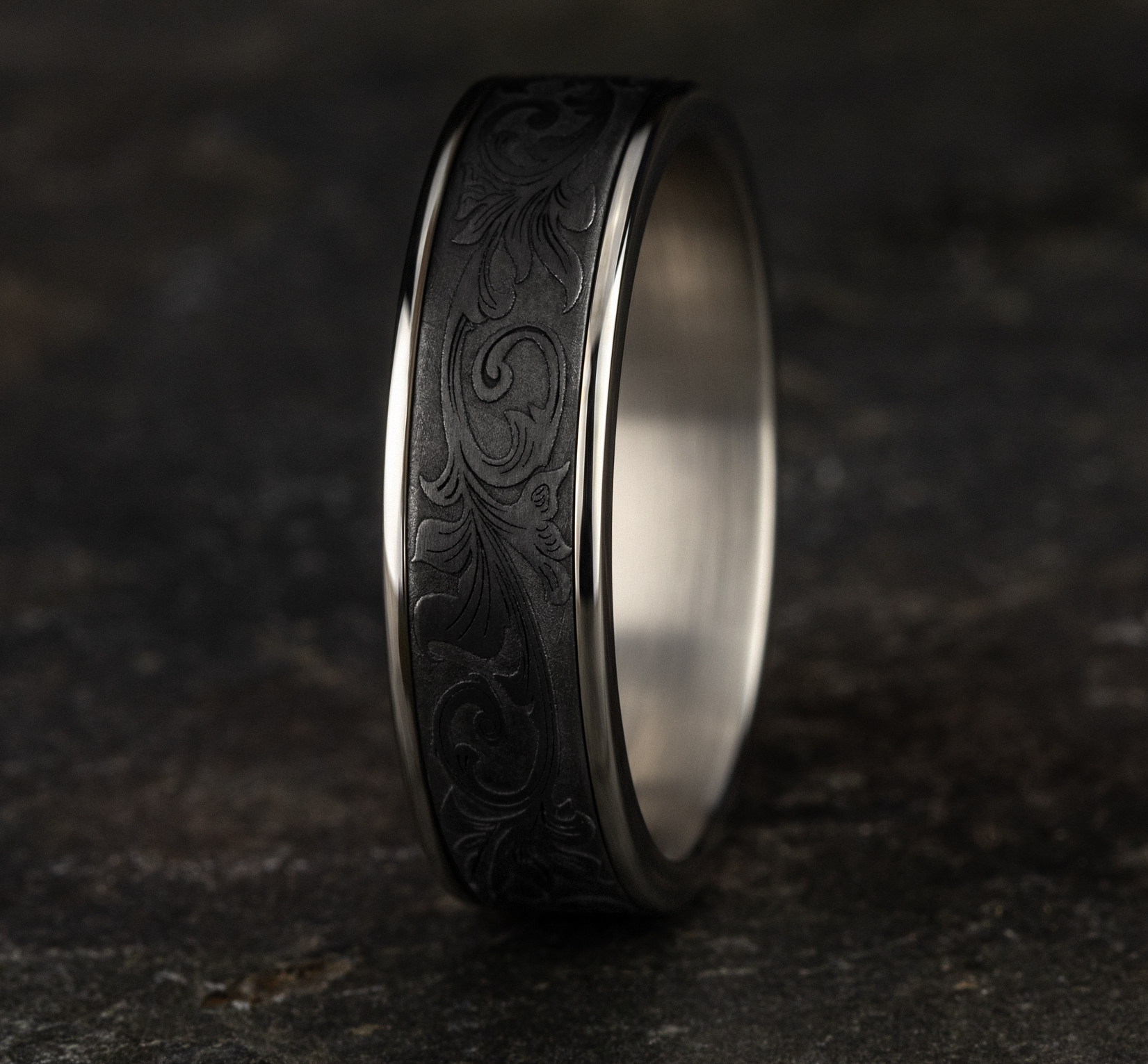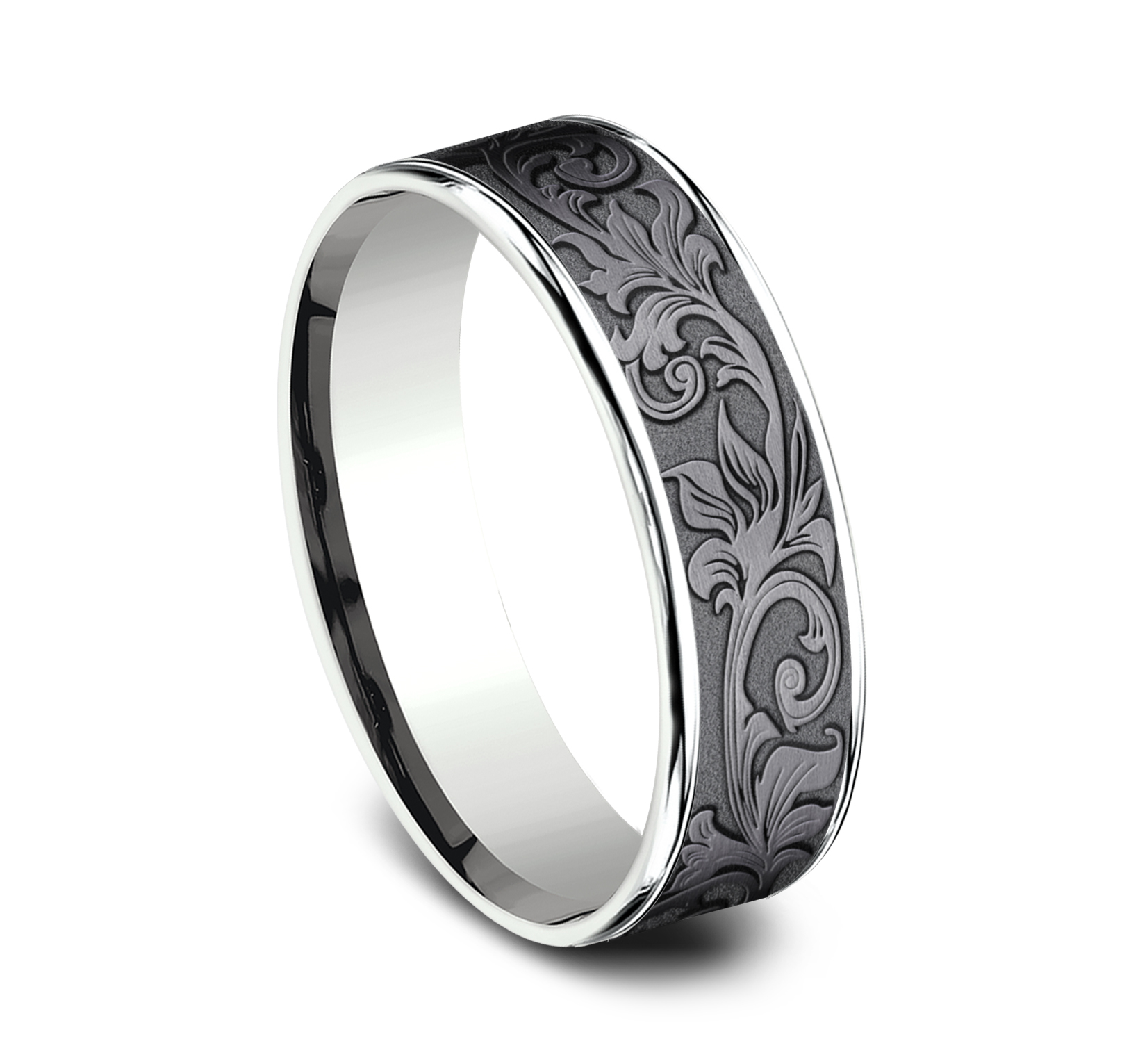 6.5mm, Comfort fit 14K White Gold and Darkened Tantalum Vintage script pattern, polished thin edges