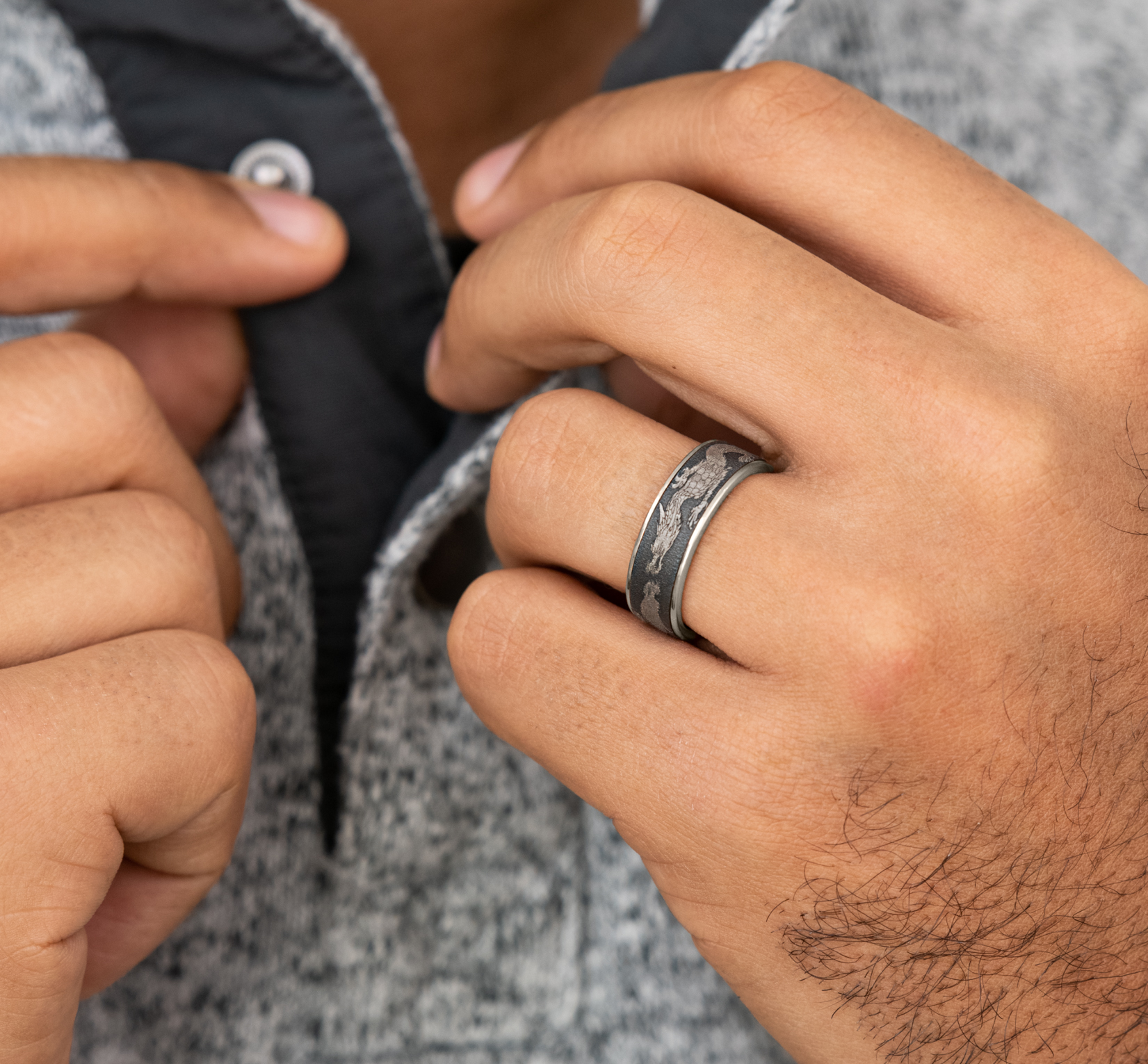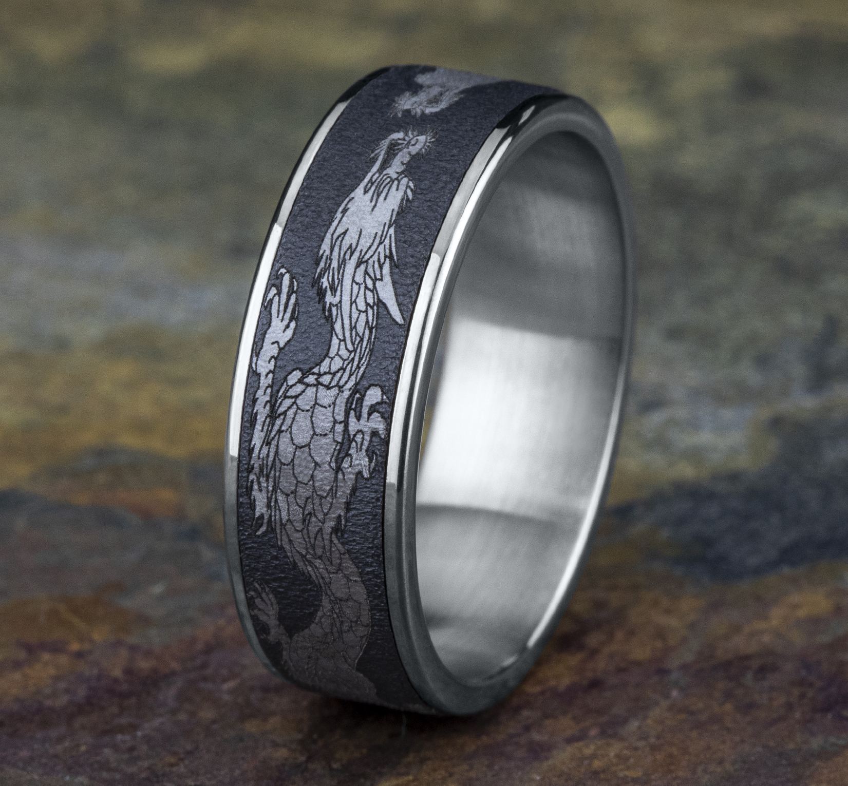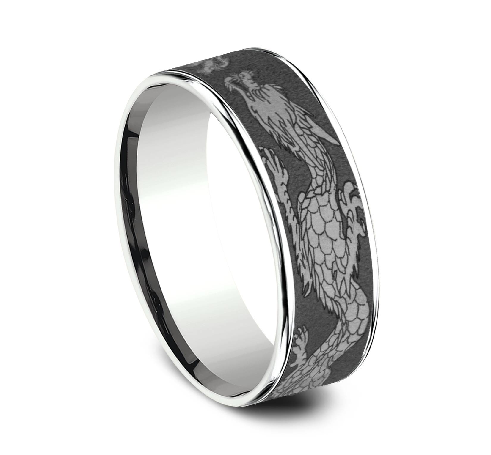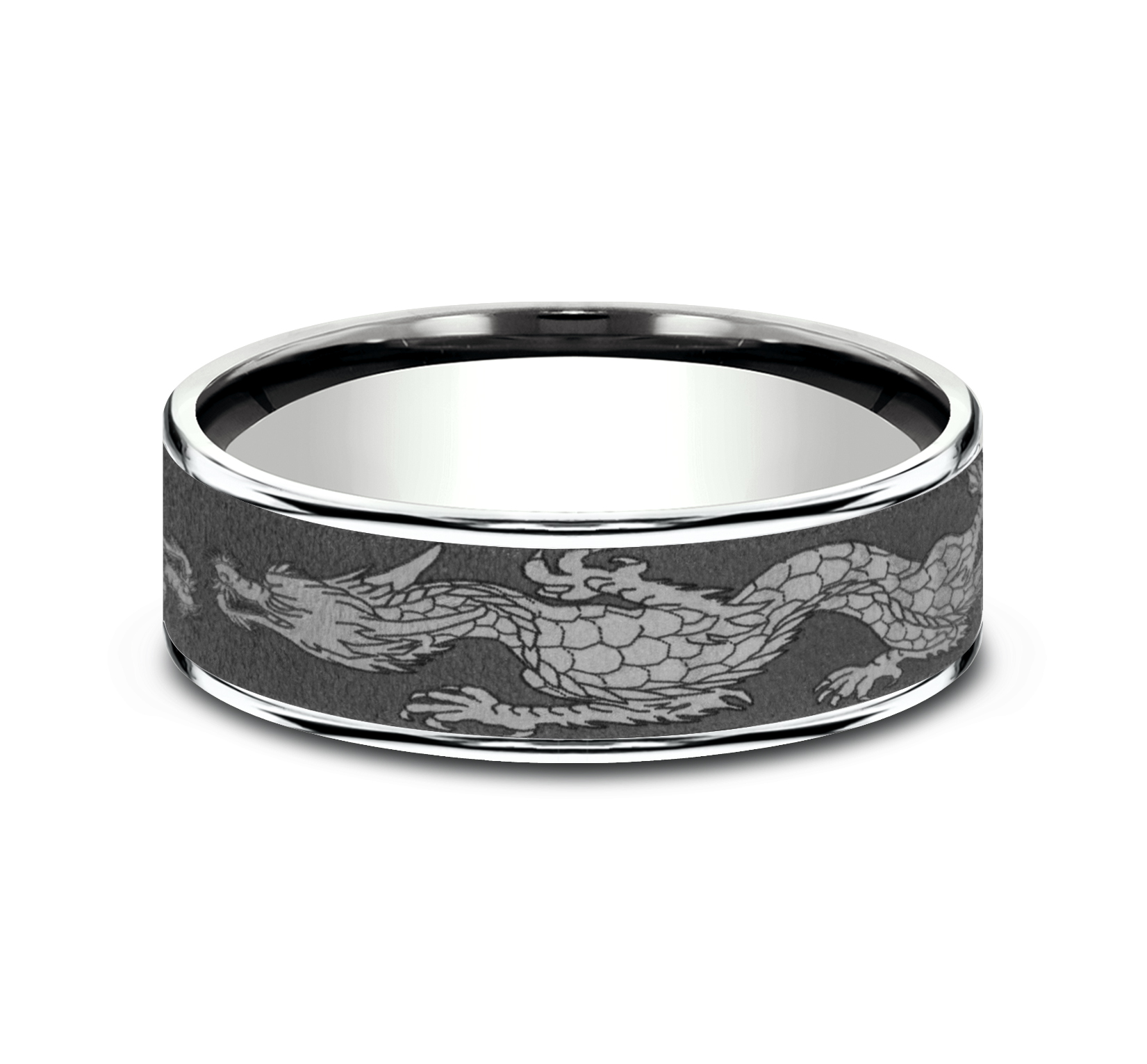 7.5mm, Comfort fit 14K White Gold and Darkened Tantalum Chinese dragon patterened center, thin edges