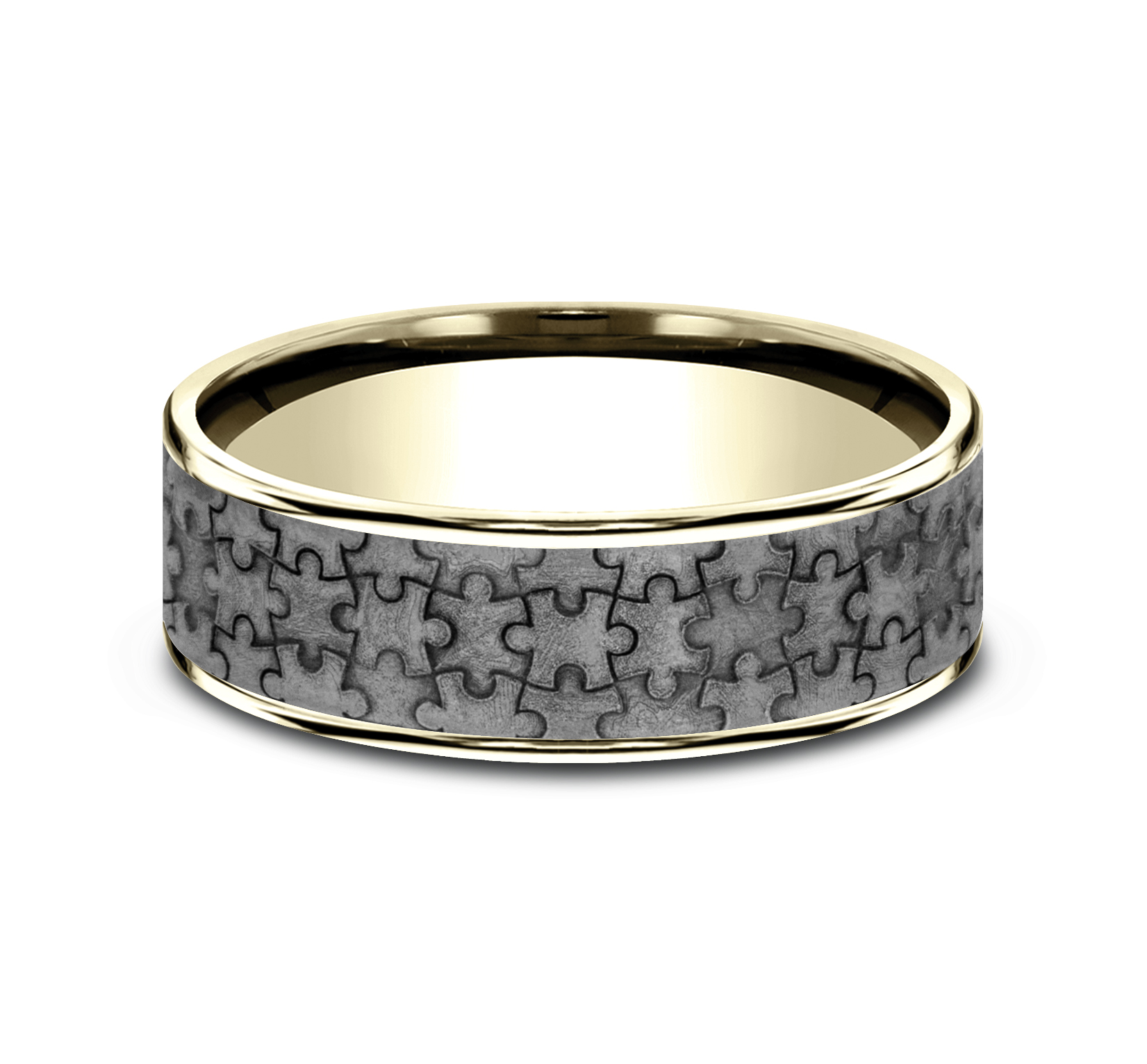 7.5mm, Comfort fit 14K Yellow Gold and Grey Tantalum Puzzle patterned center, thin edges