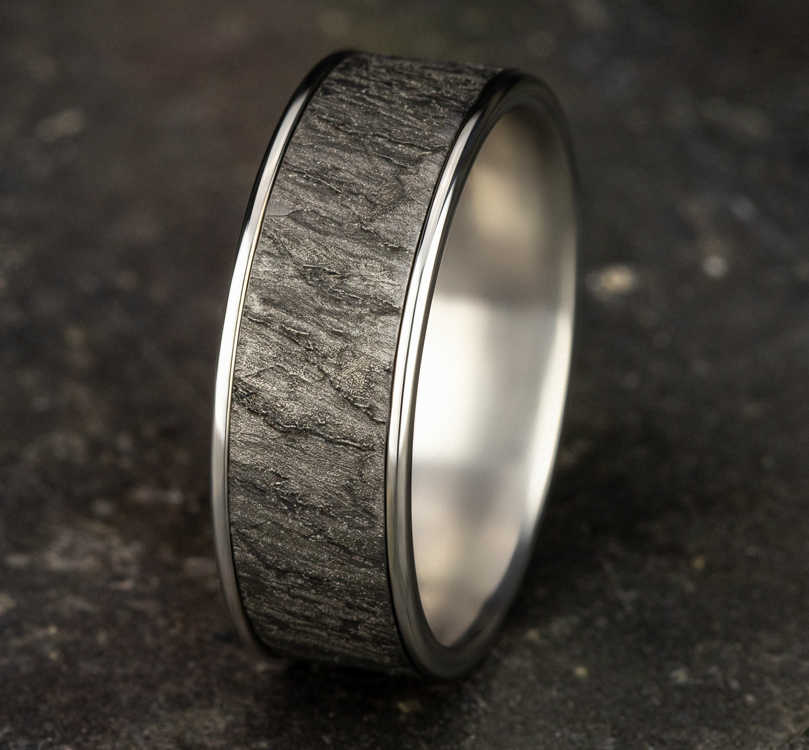 7.5mm, Comfort fit 14K White Gold and Grey Tantalum Lava rock textured center, polished thin edges