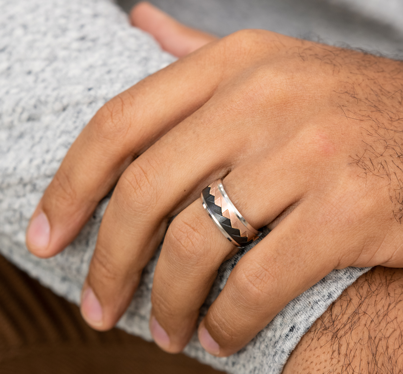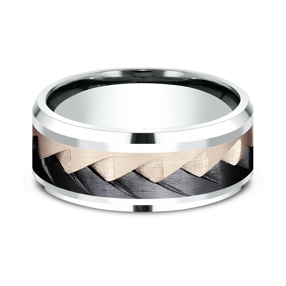 9mm, Comfort fit 14K White and Rose Gold and Black Titanium Saw tooth pattern, polished bevel edges