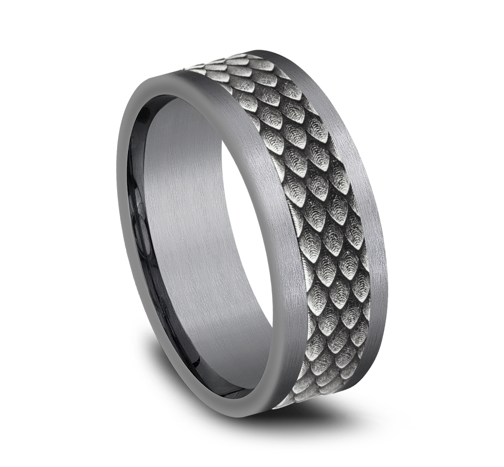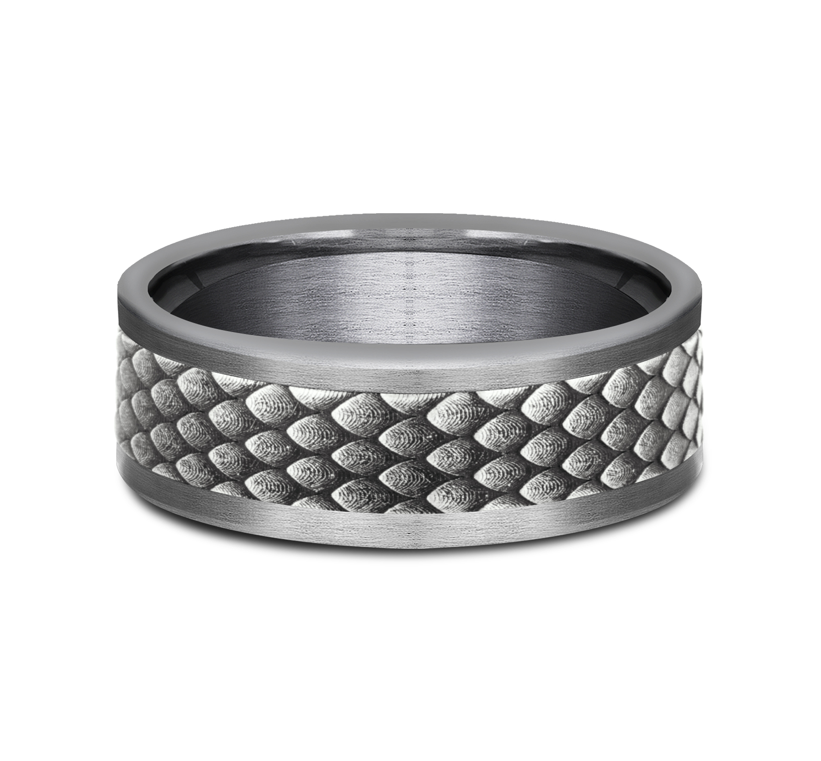 8mm, Comfort fit Grey Tantalum and 14K White Gold Dragon scale patterned center, straight edges