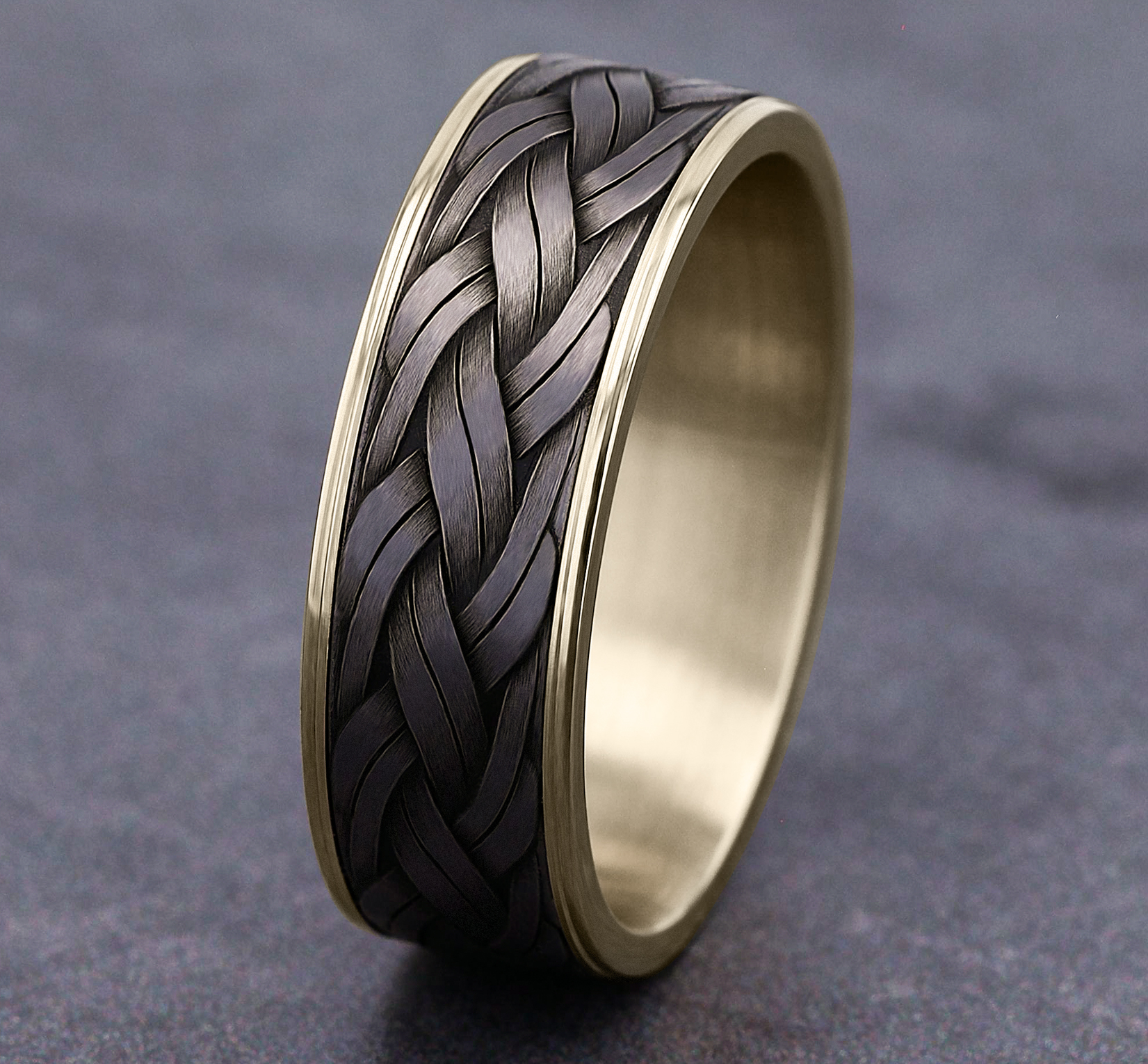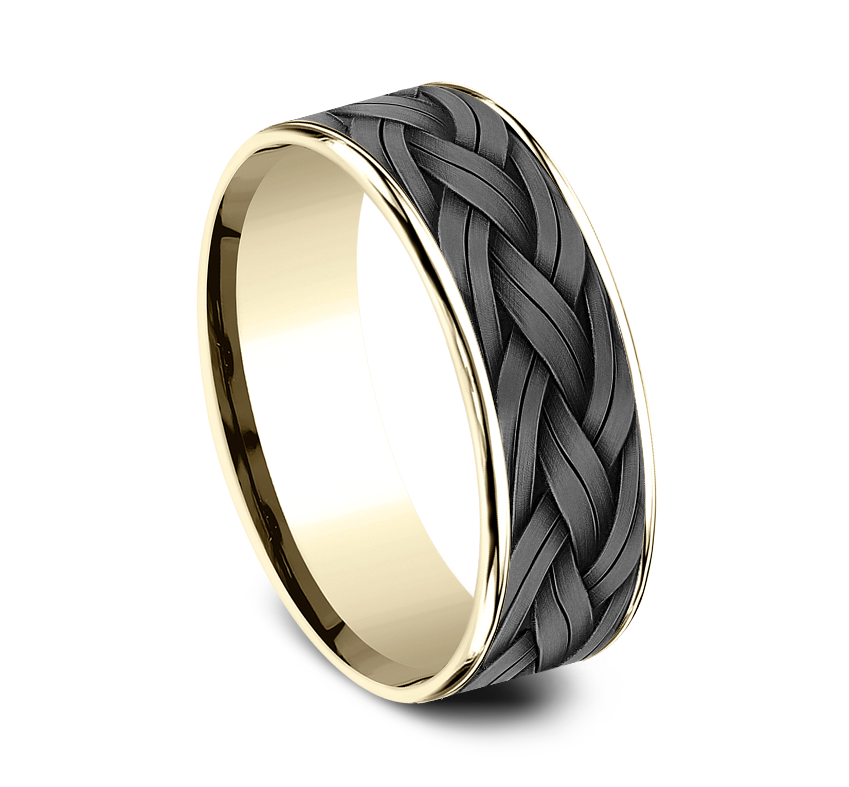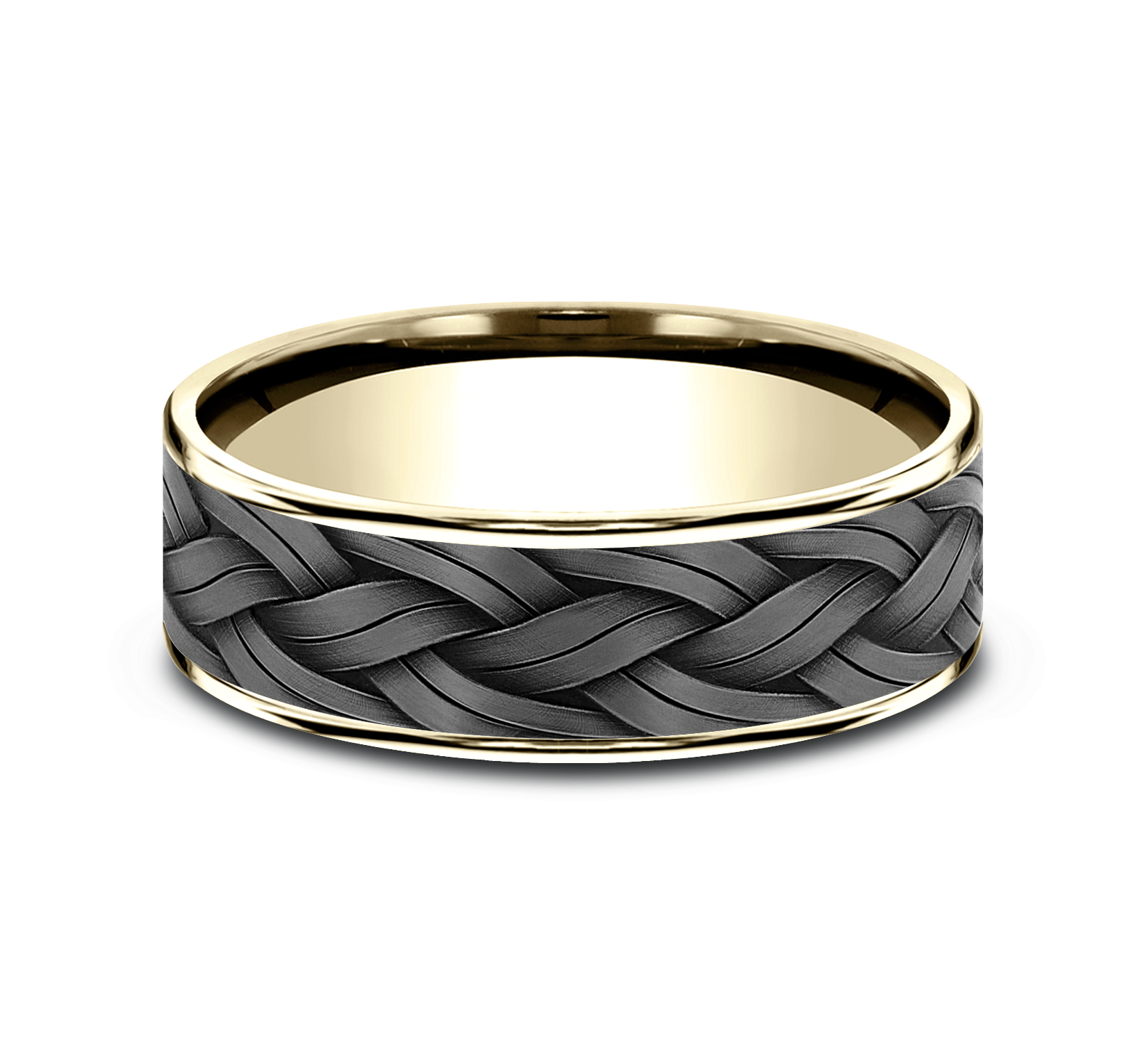 7.5mm, Comfort fit 14K Yellow Gold and Grey Tantalum Braided rope pattern, thin edges