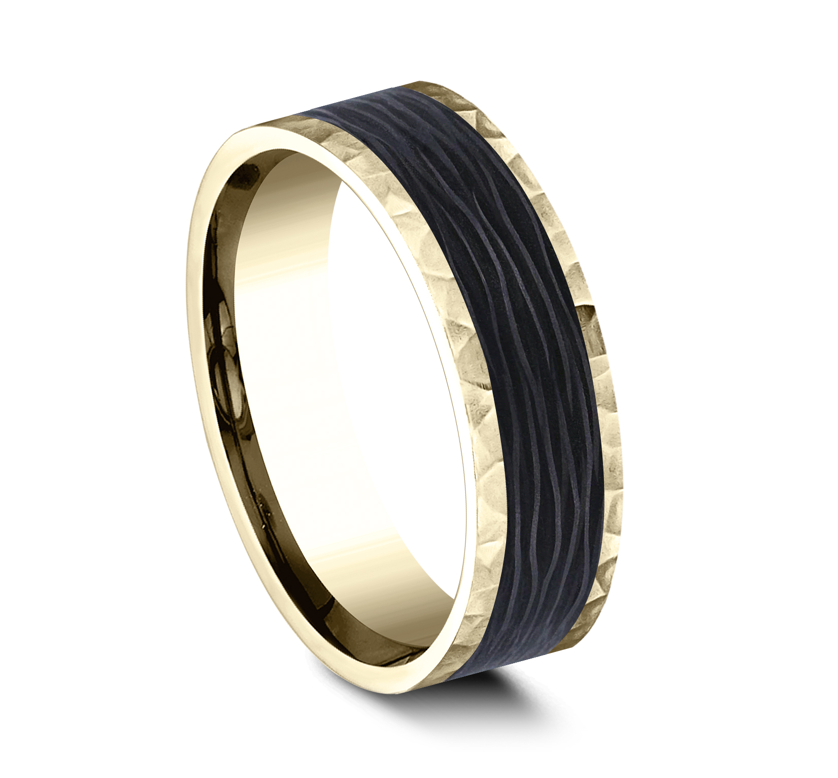 7mm, Comfort fit 14K Yellow Gold and Forged Carbon Fiber Forged carbon fiber center, hammer edges