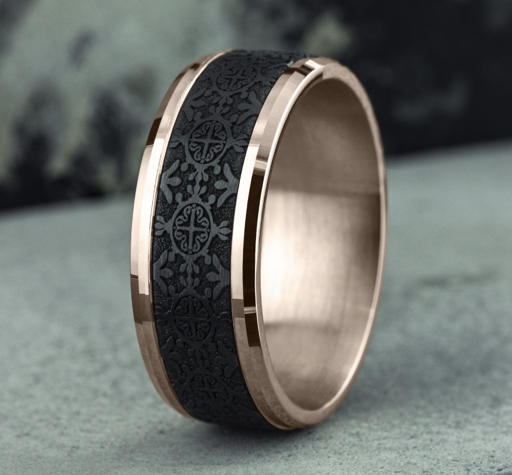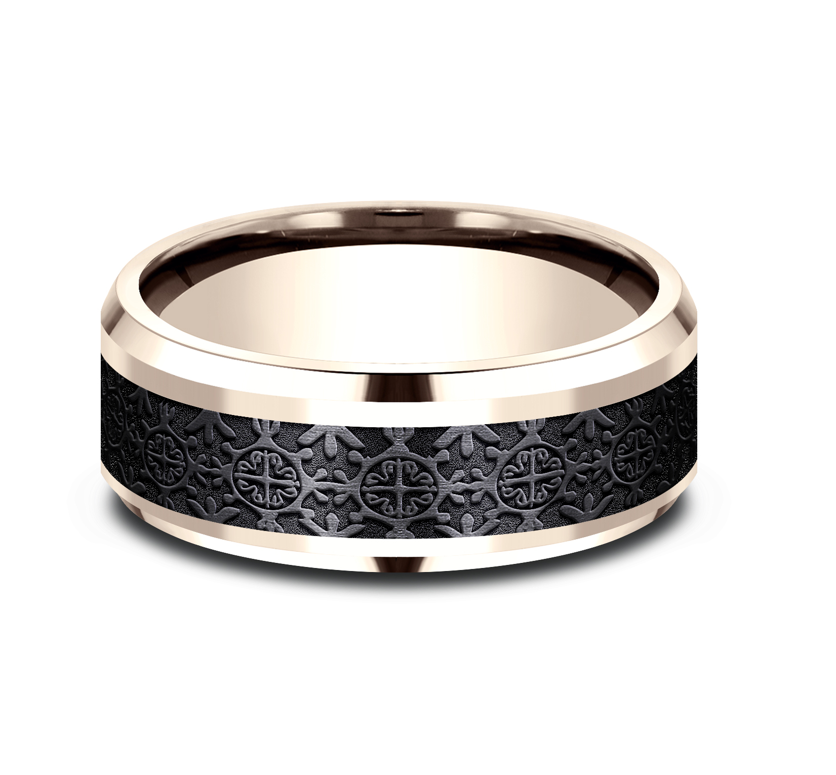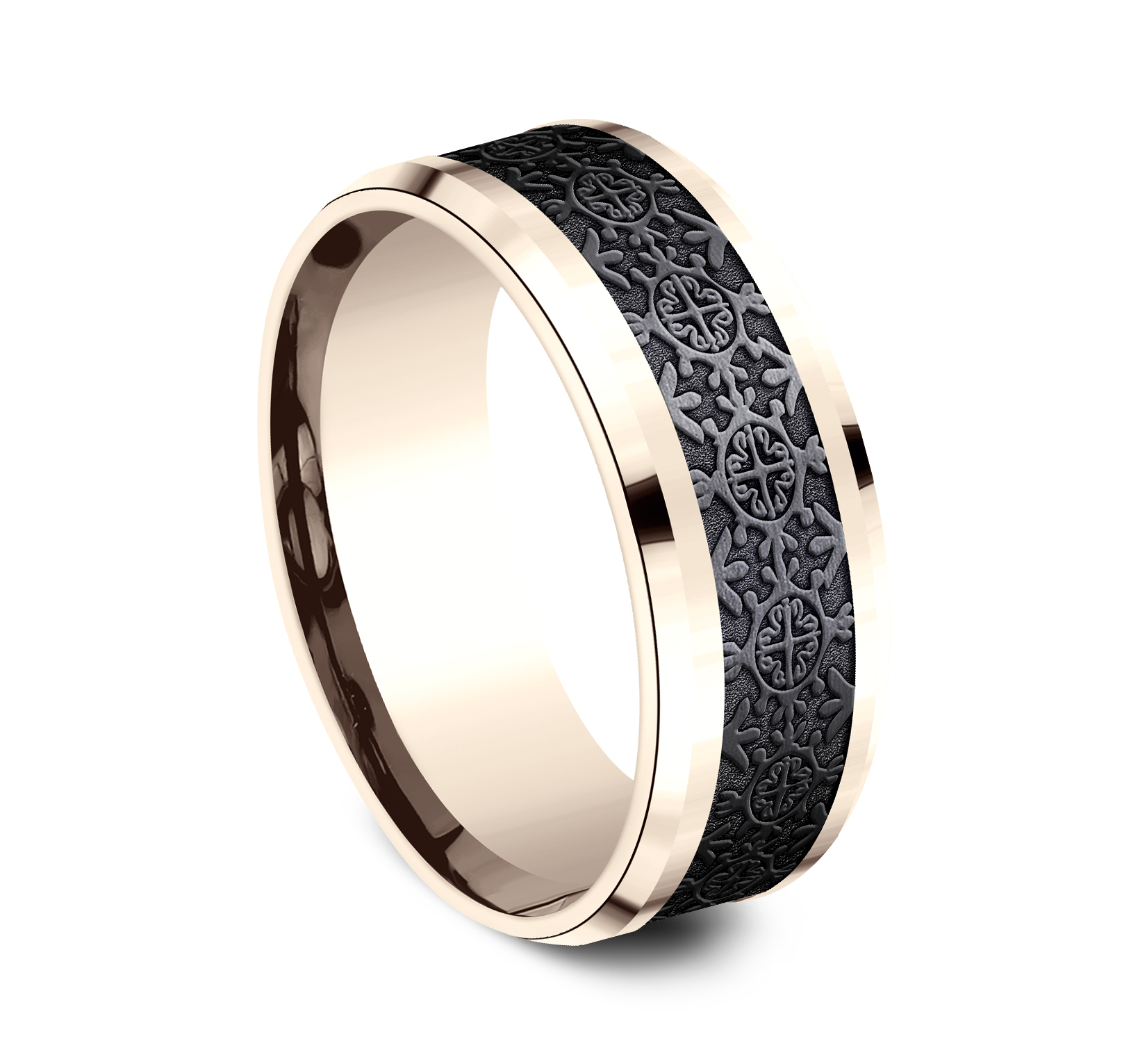 8mm, Comfort fit 14K Rose Gold and Black Titanium Intricate patterned center, polished bevel edges