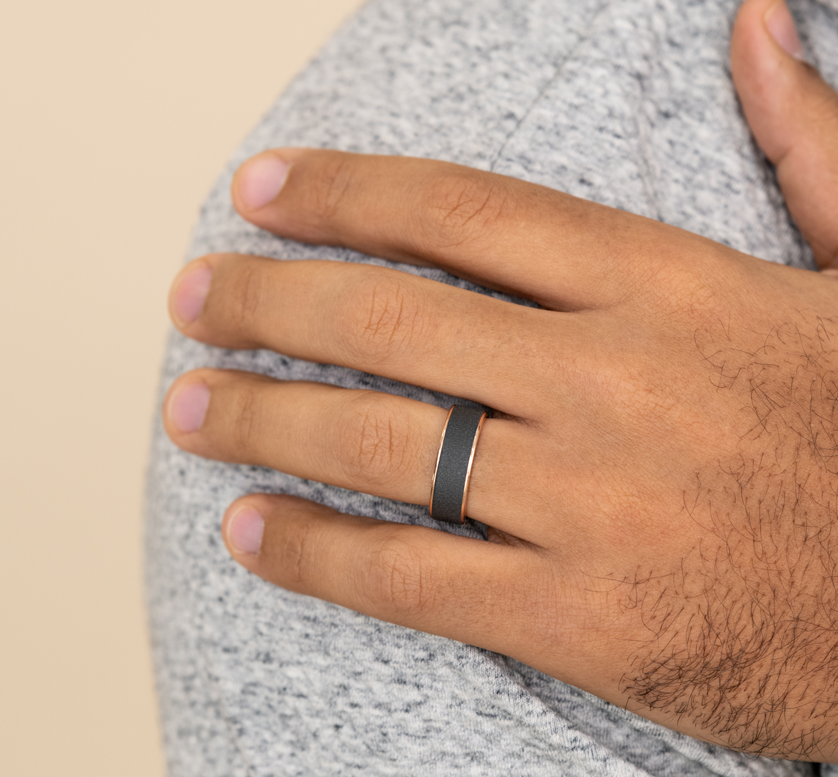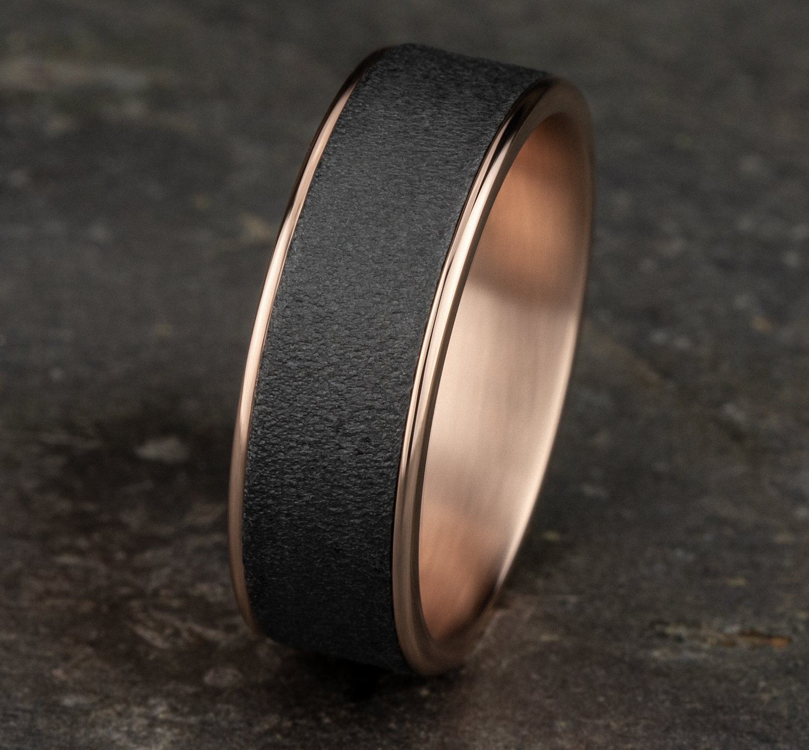 7.5mm, Comfort fit 14K Rose Gold and Darkened Tantalum Wire brush finish, polished thin edges