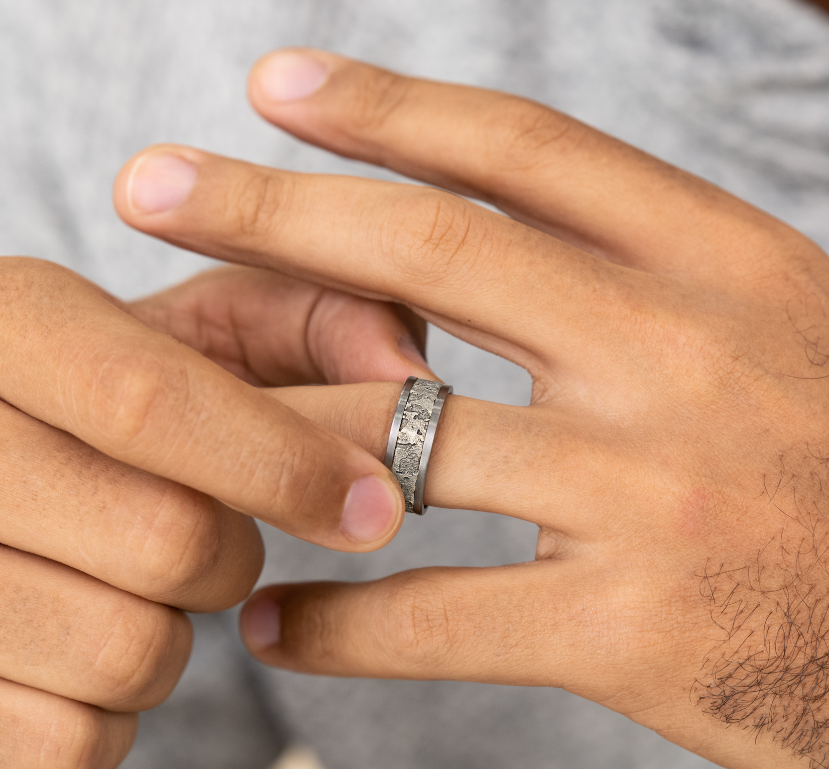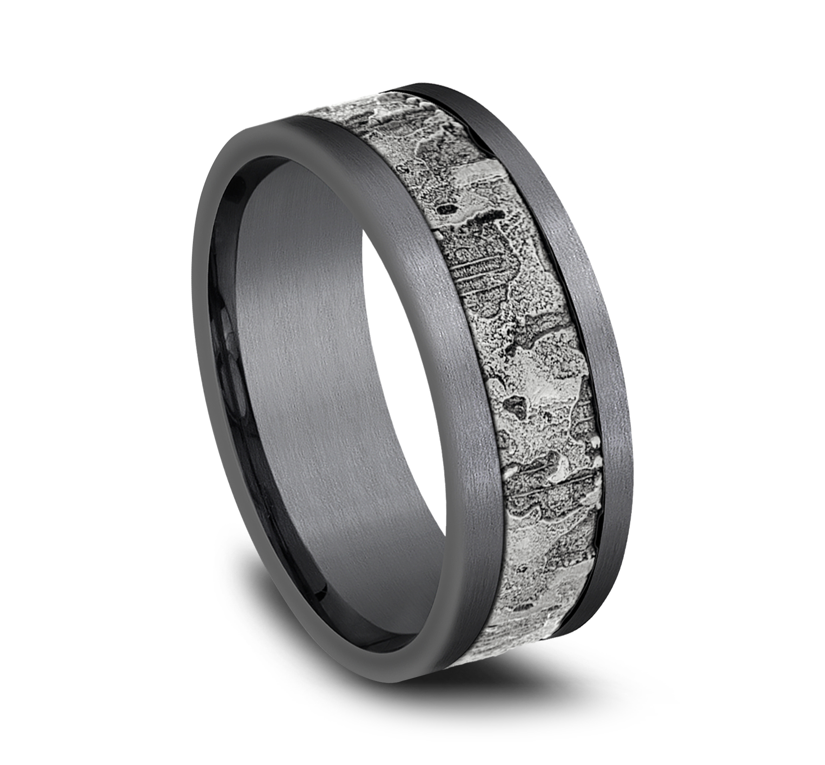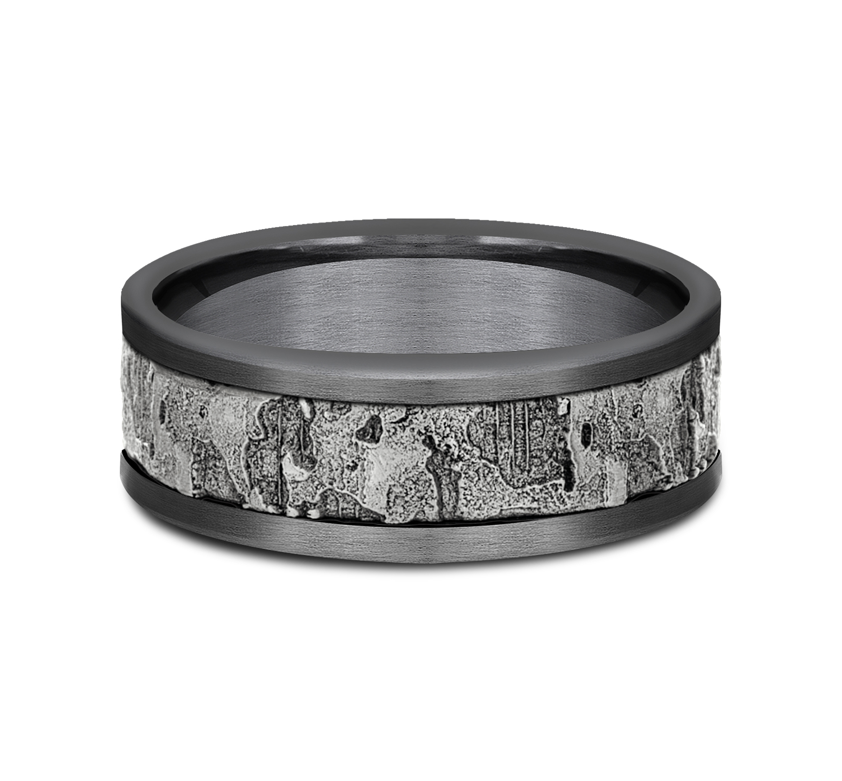 8mm, Comfort fit Grey Tantalum and 14K White Gold Wall fracture designed center, straight edges