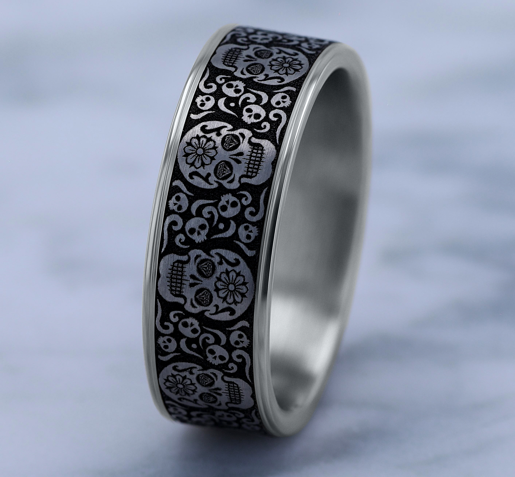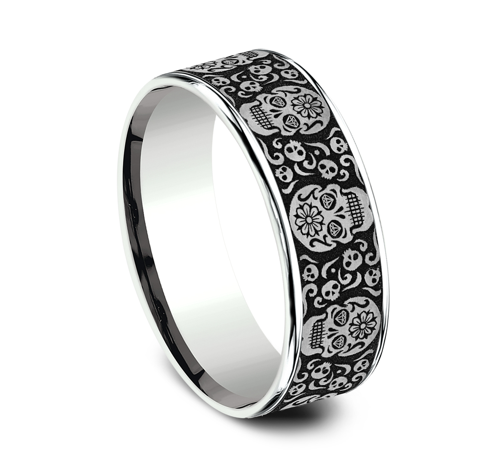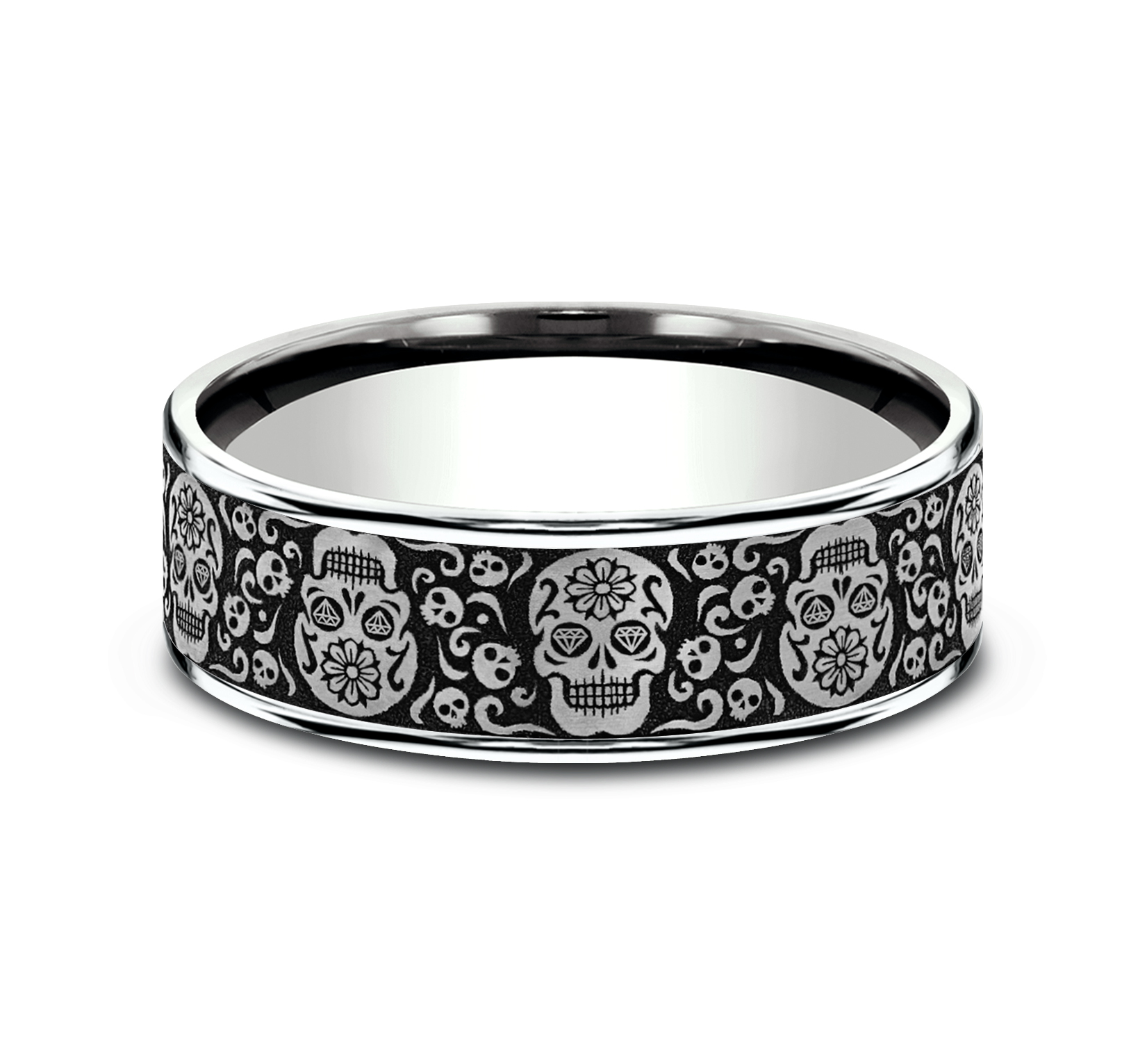 7.5mm, Comfort fit 14K White Gold and Grey/Black Titanium Sugar skull pattern, thin edges